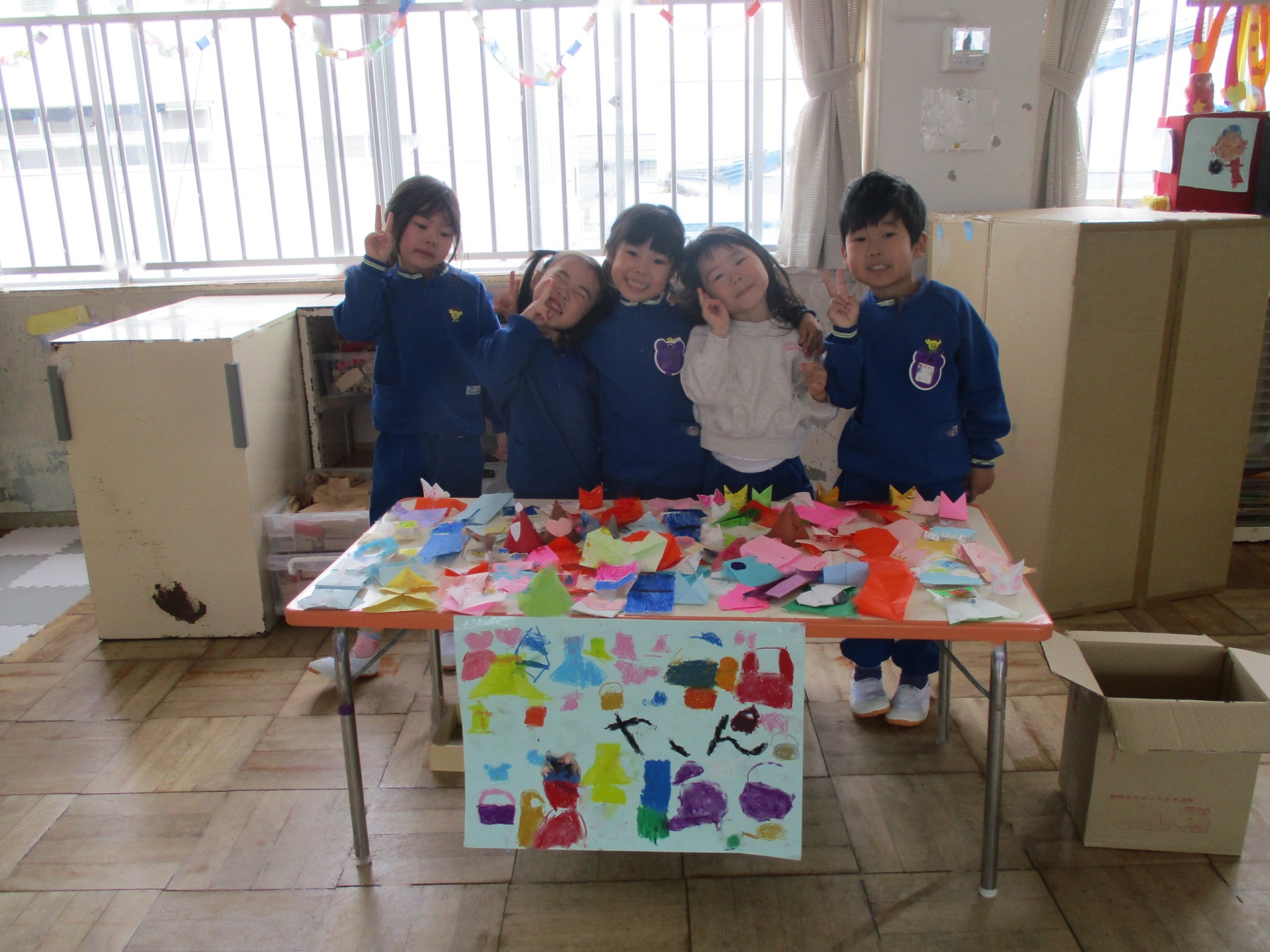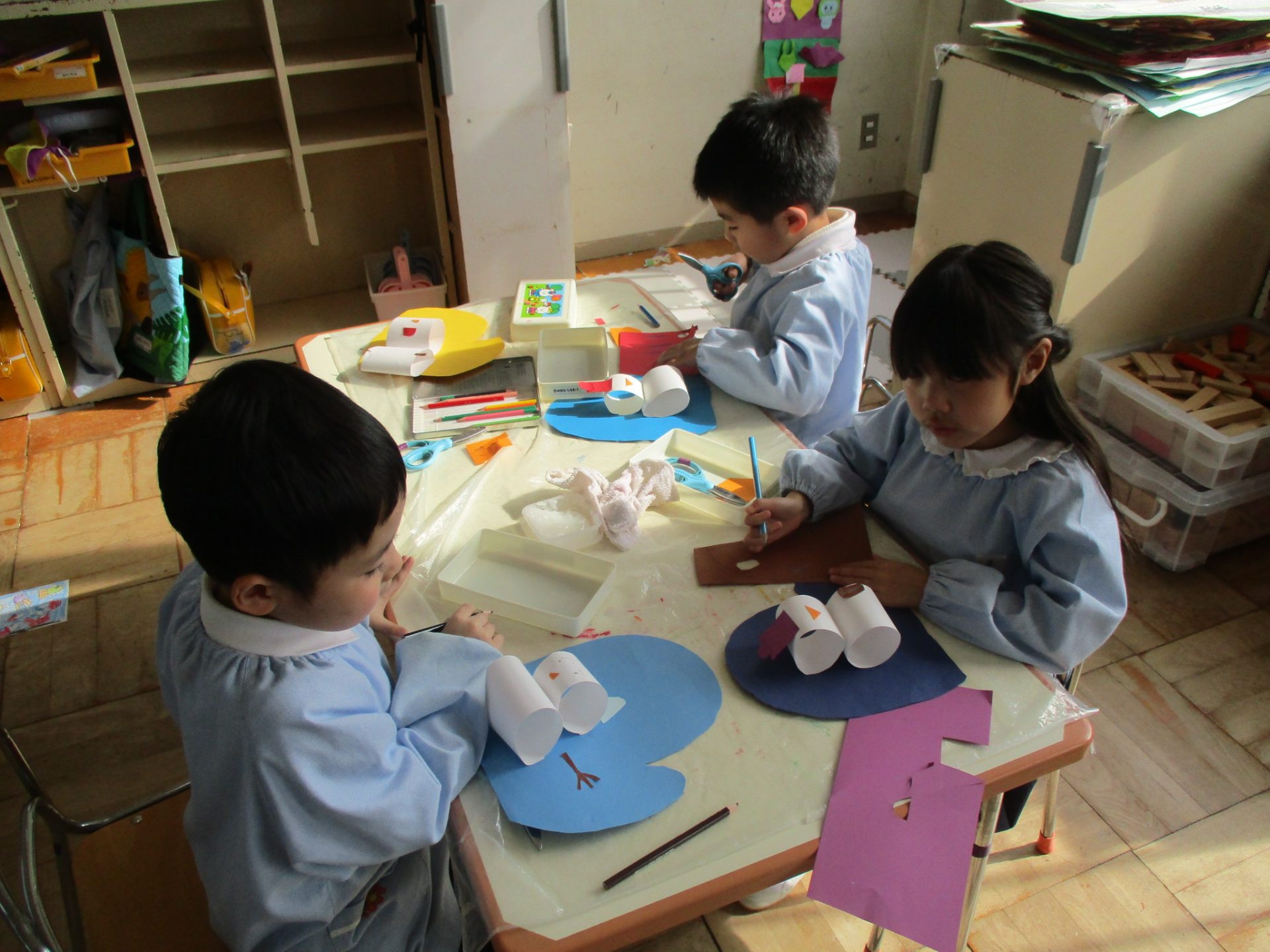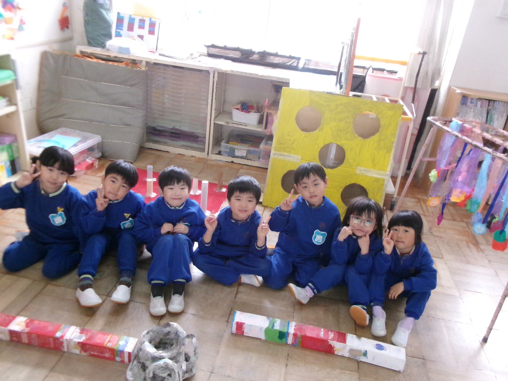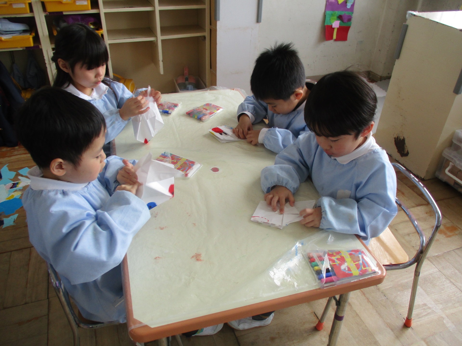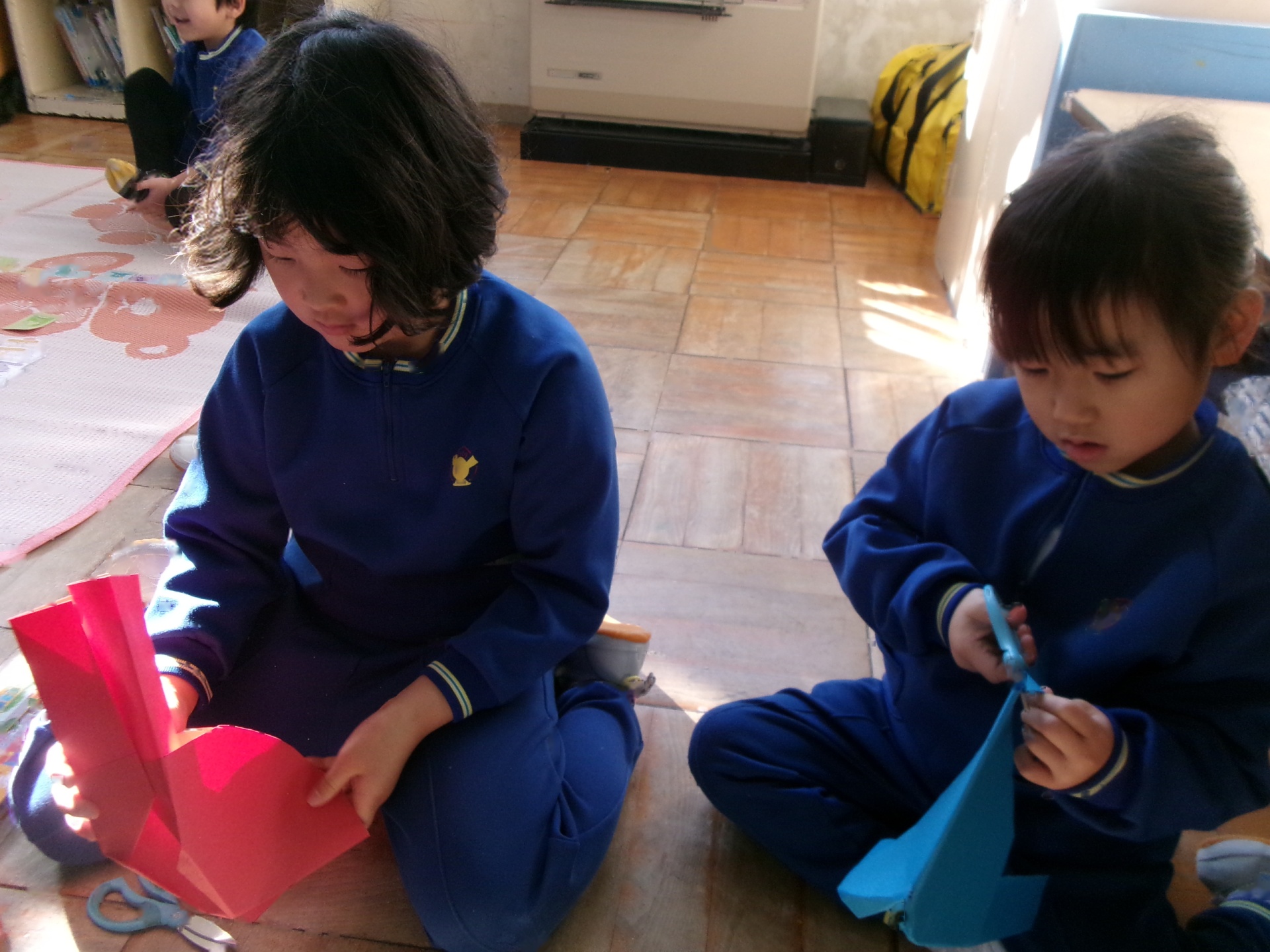 先日の節分に向けて、年中組は升を作りました。大きな紙に節分に関する絵を描き、それを折りました。日ごろの遊びで折り紙を楽しんでいるため、難しい折り方にも楽しんで取り組む姿が見られましたよ😊