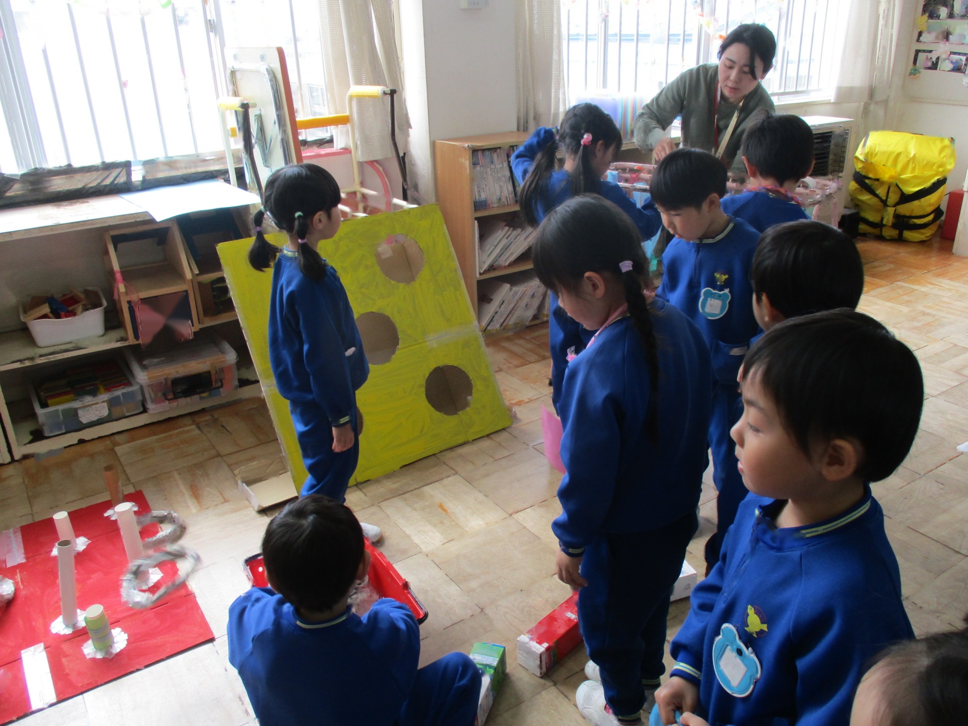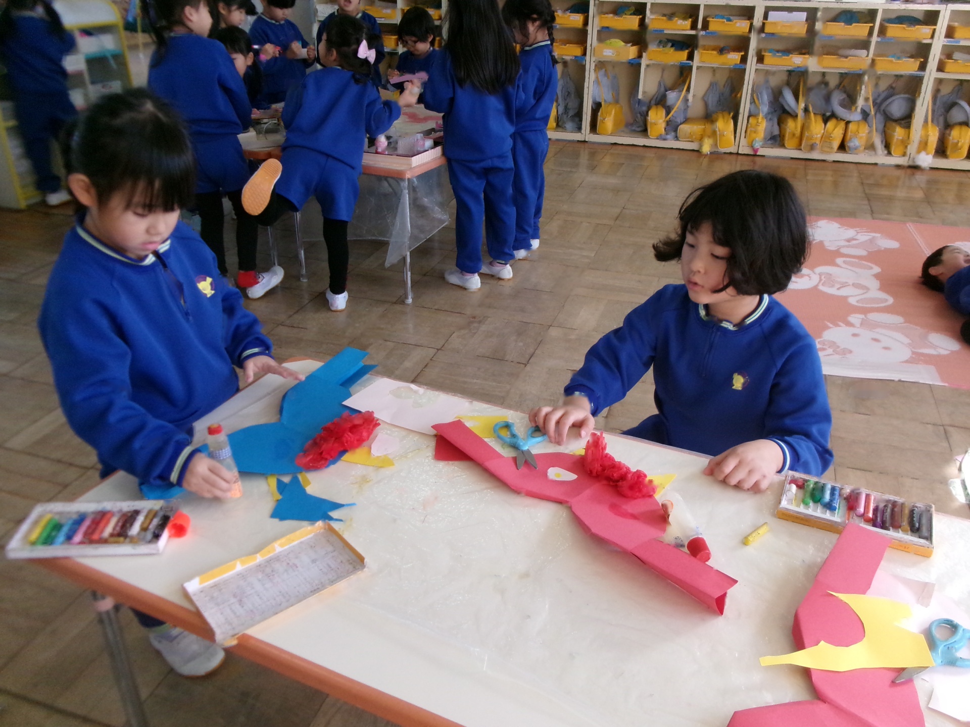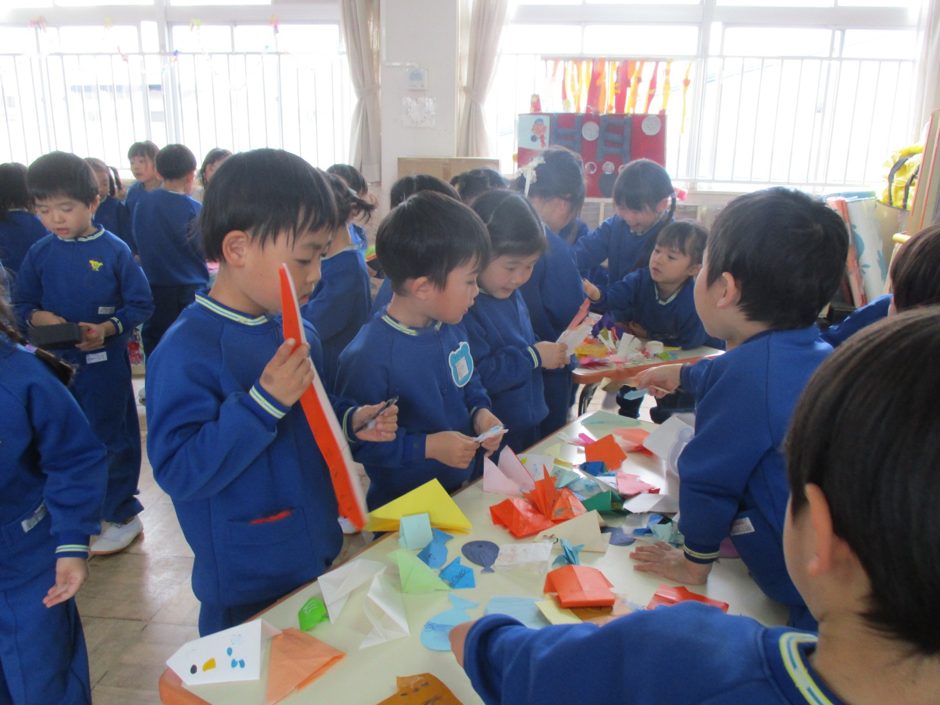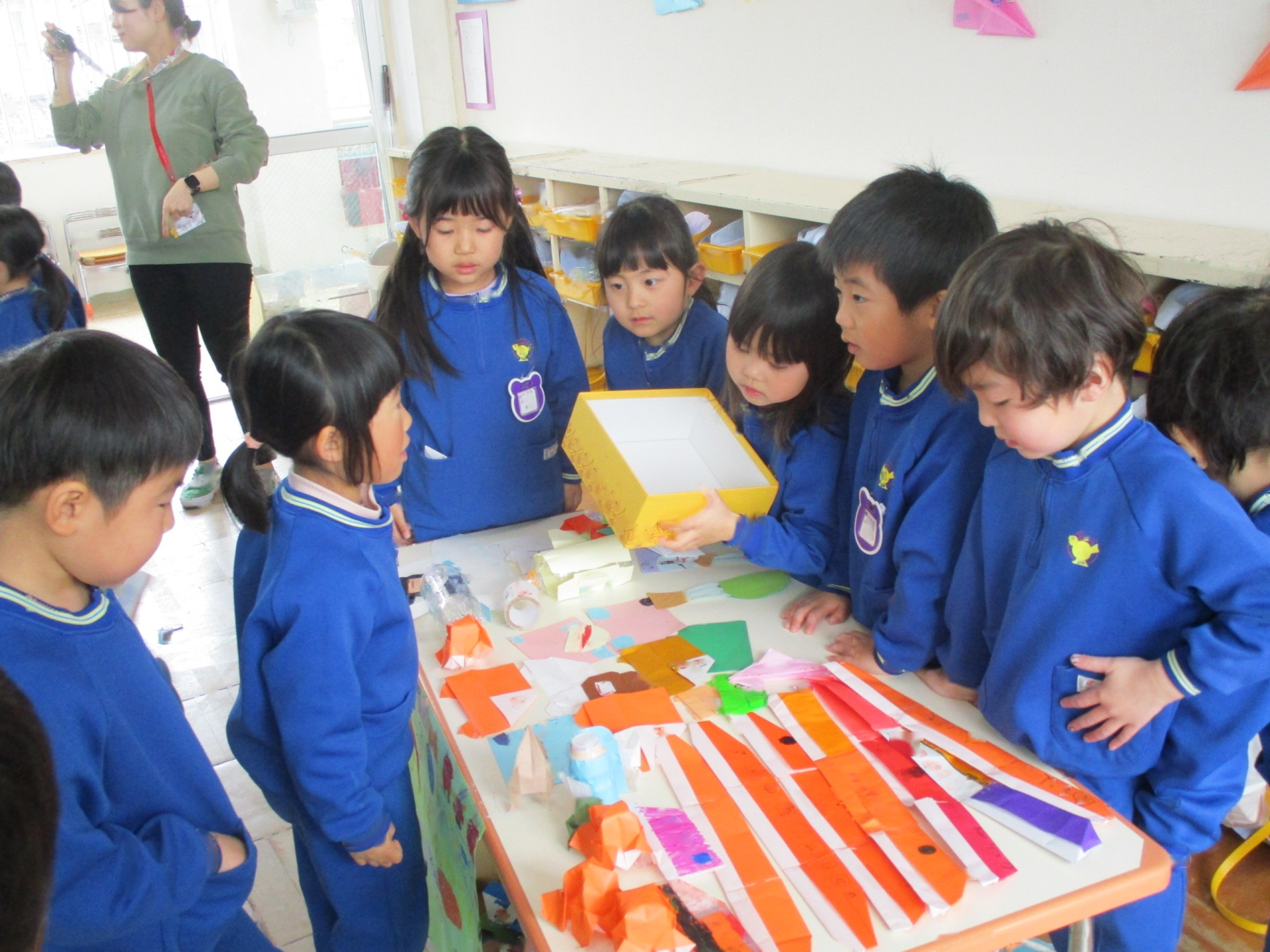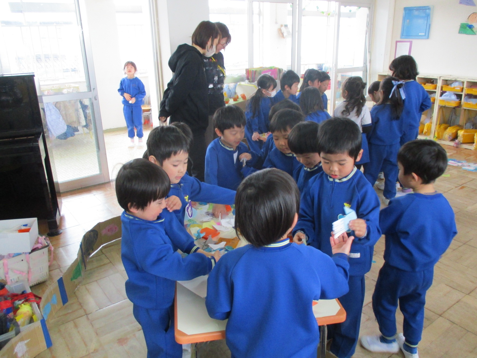 先日の節分に向けて、年中組は升を作りました。大きな紙に節分に関する絵を描き、それを折りました。日ごろの遊びで折り紙を楽しんでいるため、難しい折り方にも楽しんで取り組む姿が見られましたよ😊