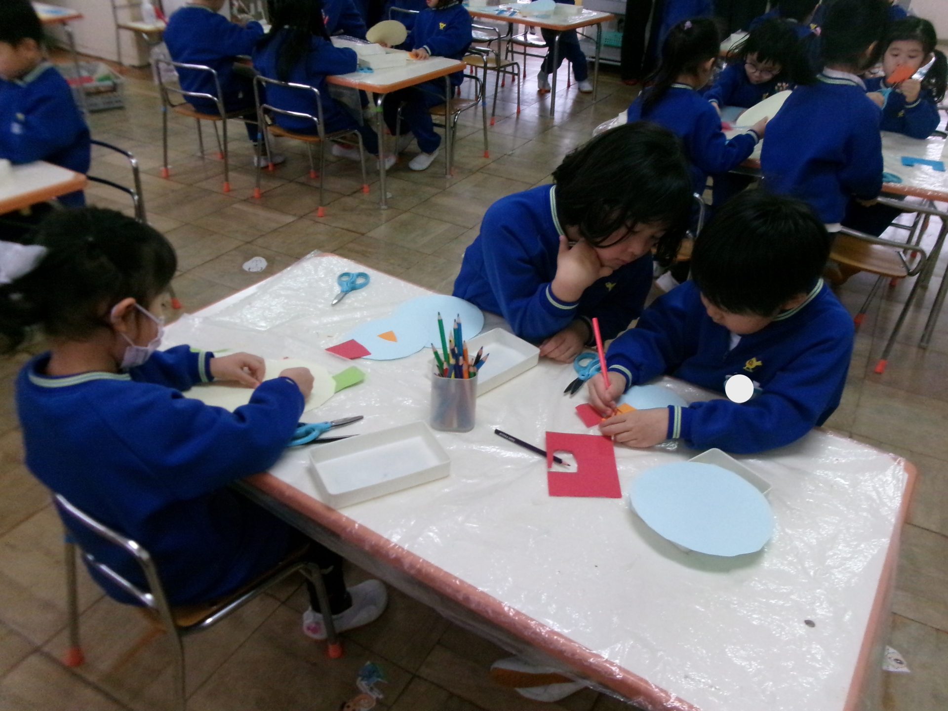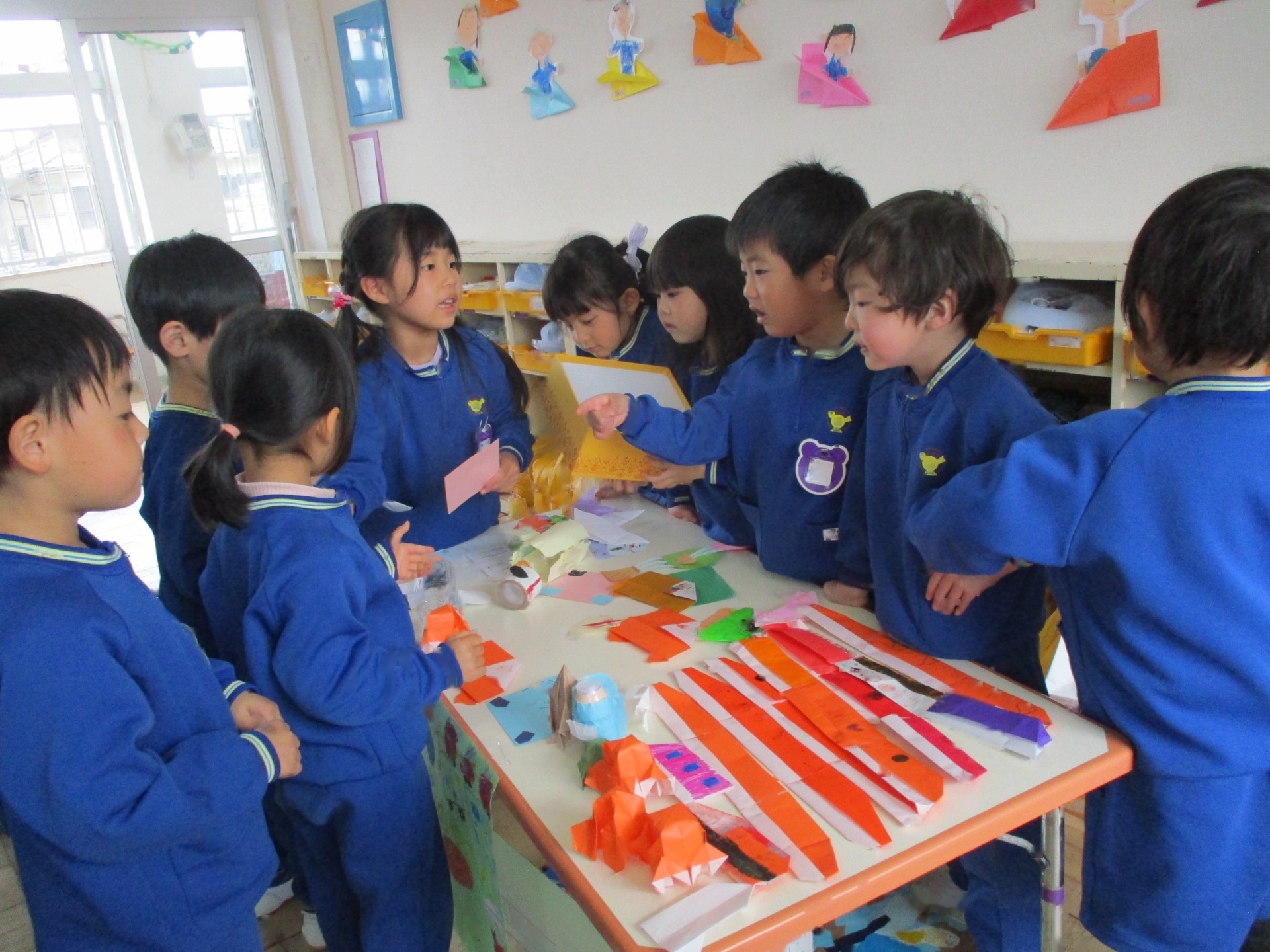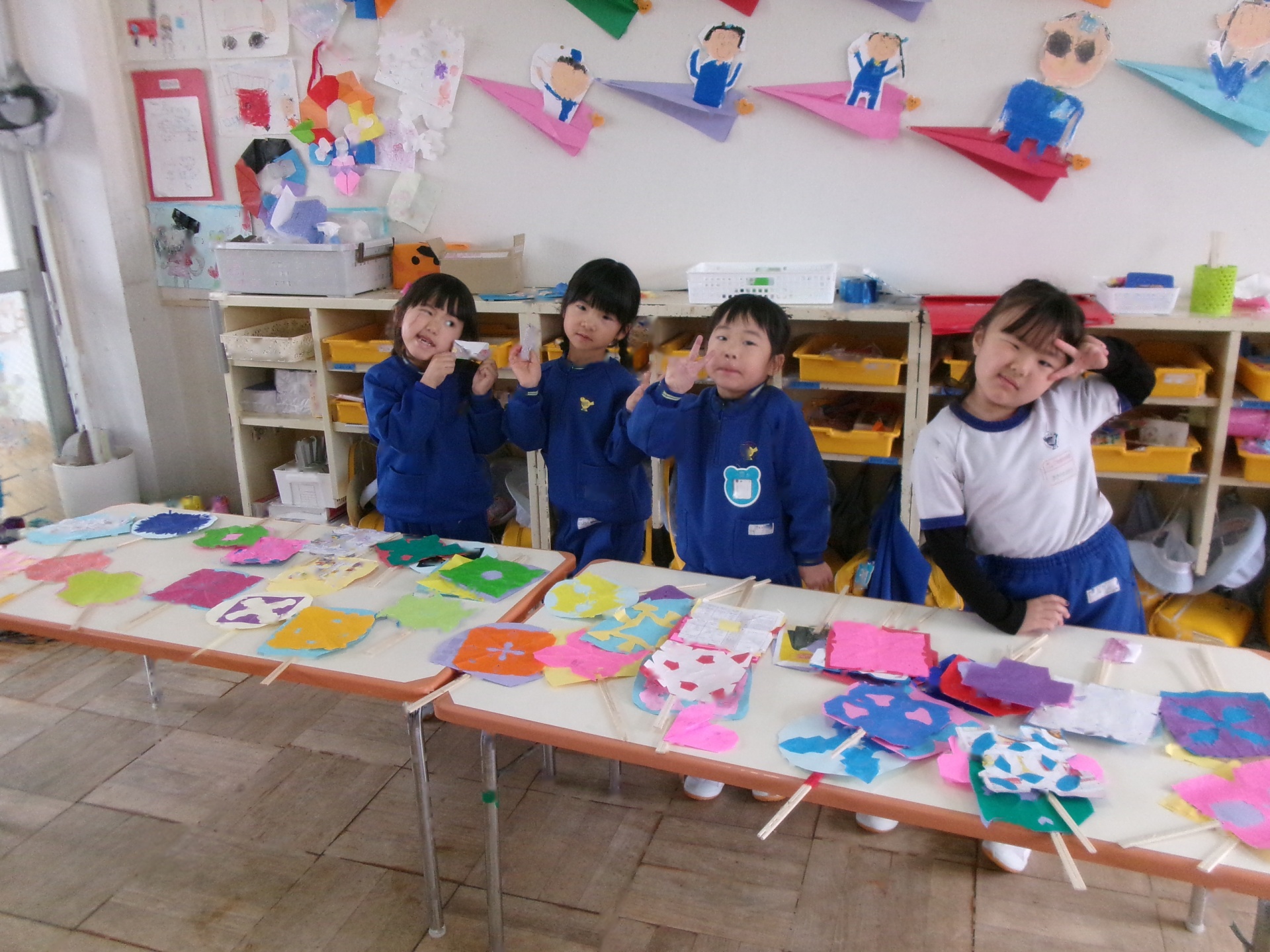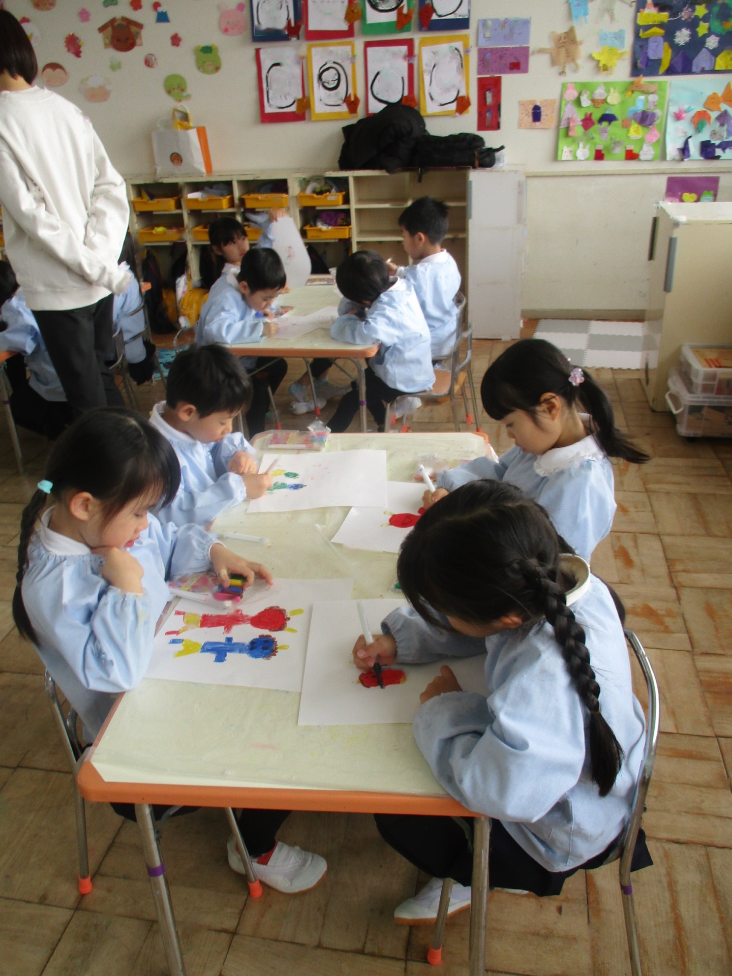先日の節分に向けて、年中組は升を作りました。大きな紙に節分に関する絵を描き、それを折りました。日ごろの遊びで折り紙を楽しんでいるため、難しい折り方にも楽しんで取り組む姿が見られましたよ😊