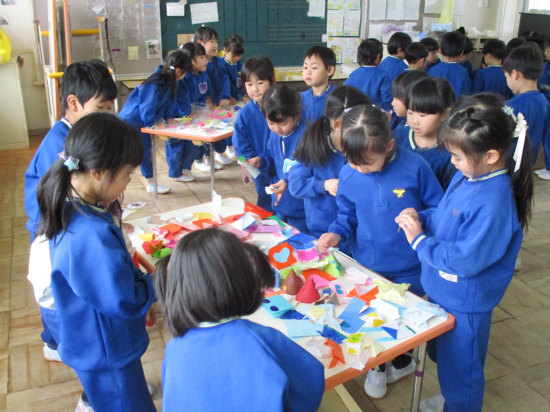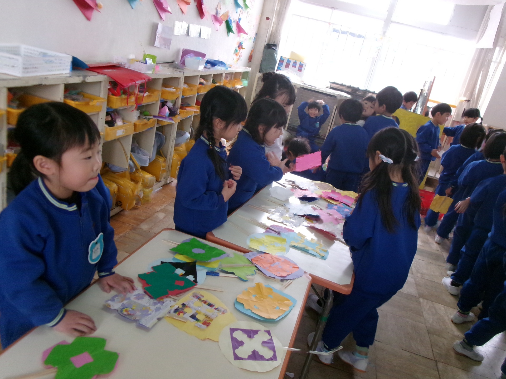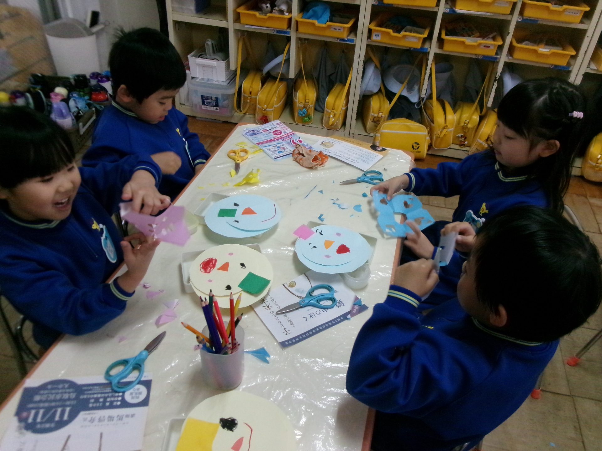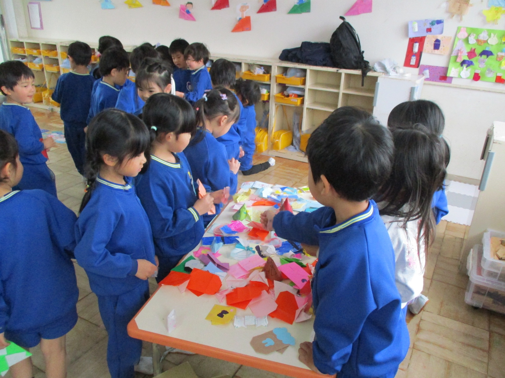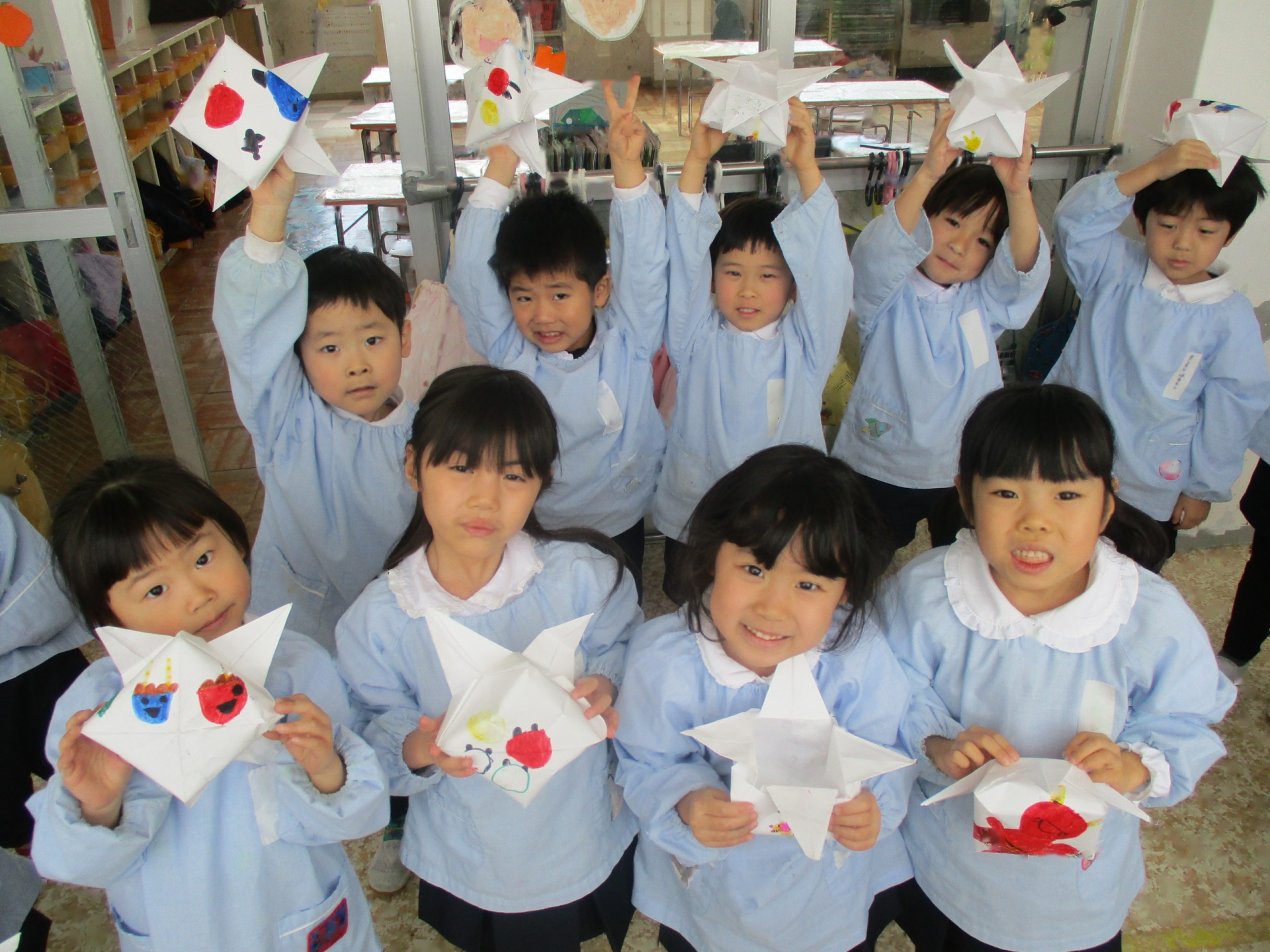 先日の節分に向けて、年中組は升を作りました。大きな紙に節分に関する絵を描き、それを折りました。日ごろの遊びで折り紙を楽しんでいるため、難しい折り方にも楽しんで取り組む姿が見られましたよ😊