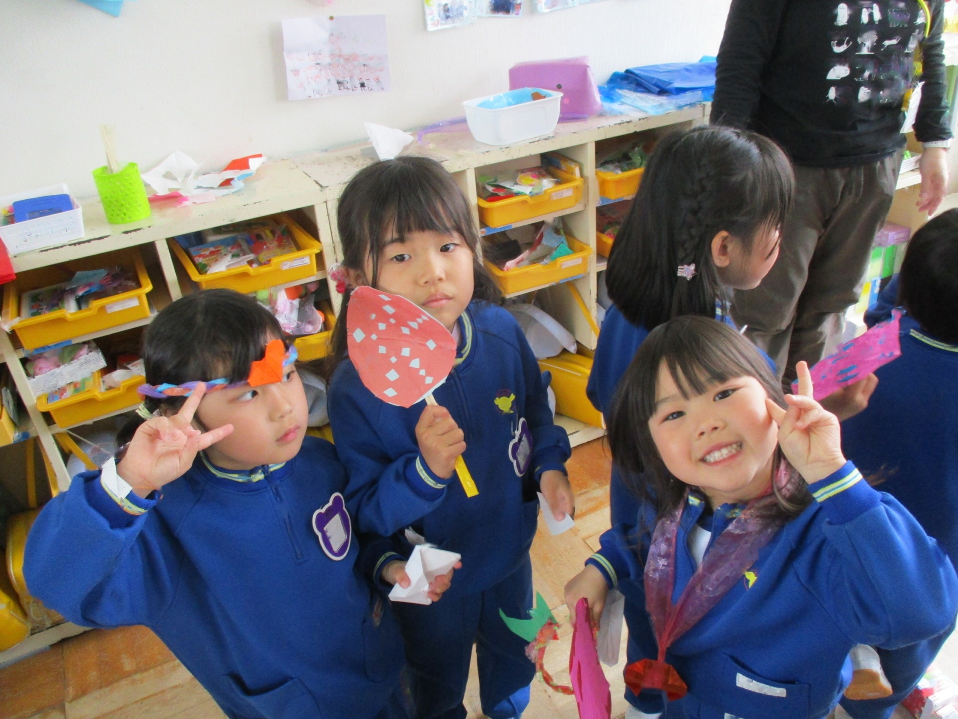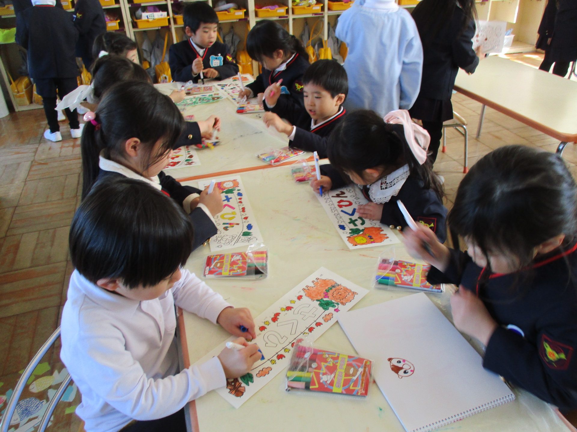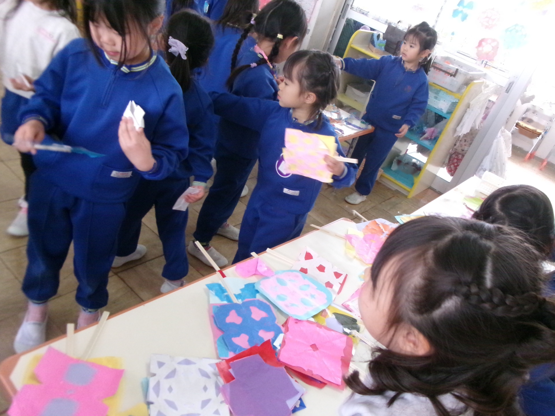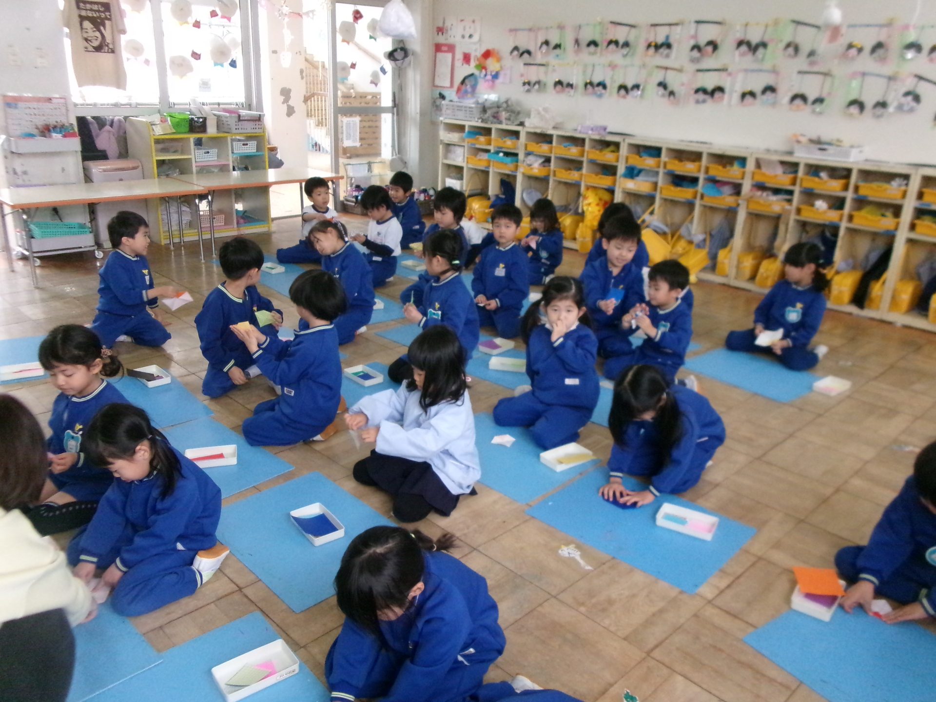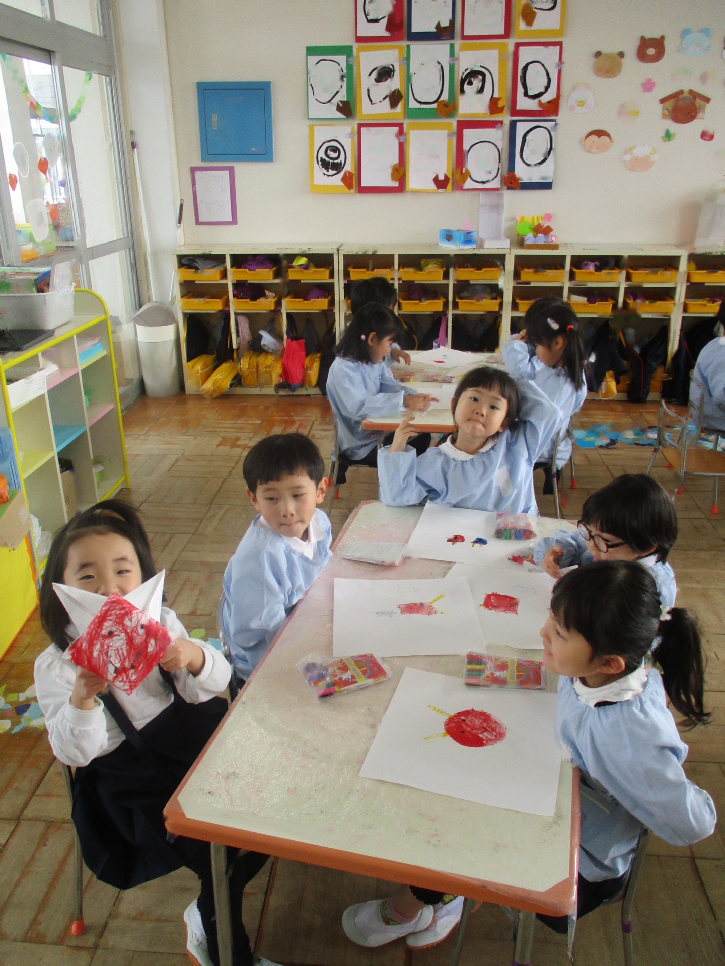 先日の節分に向けて、年中組は升を作りました。大きな紙に節分に関する絵を描き、それを折りました。日ごろの遊びで折り紙を楽しんでいるため、難しい折り方にも楽しんで取り組む姿が見られましたよ😊