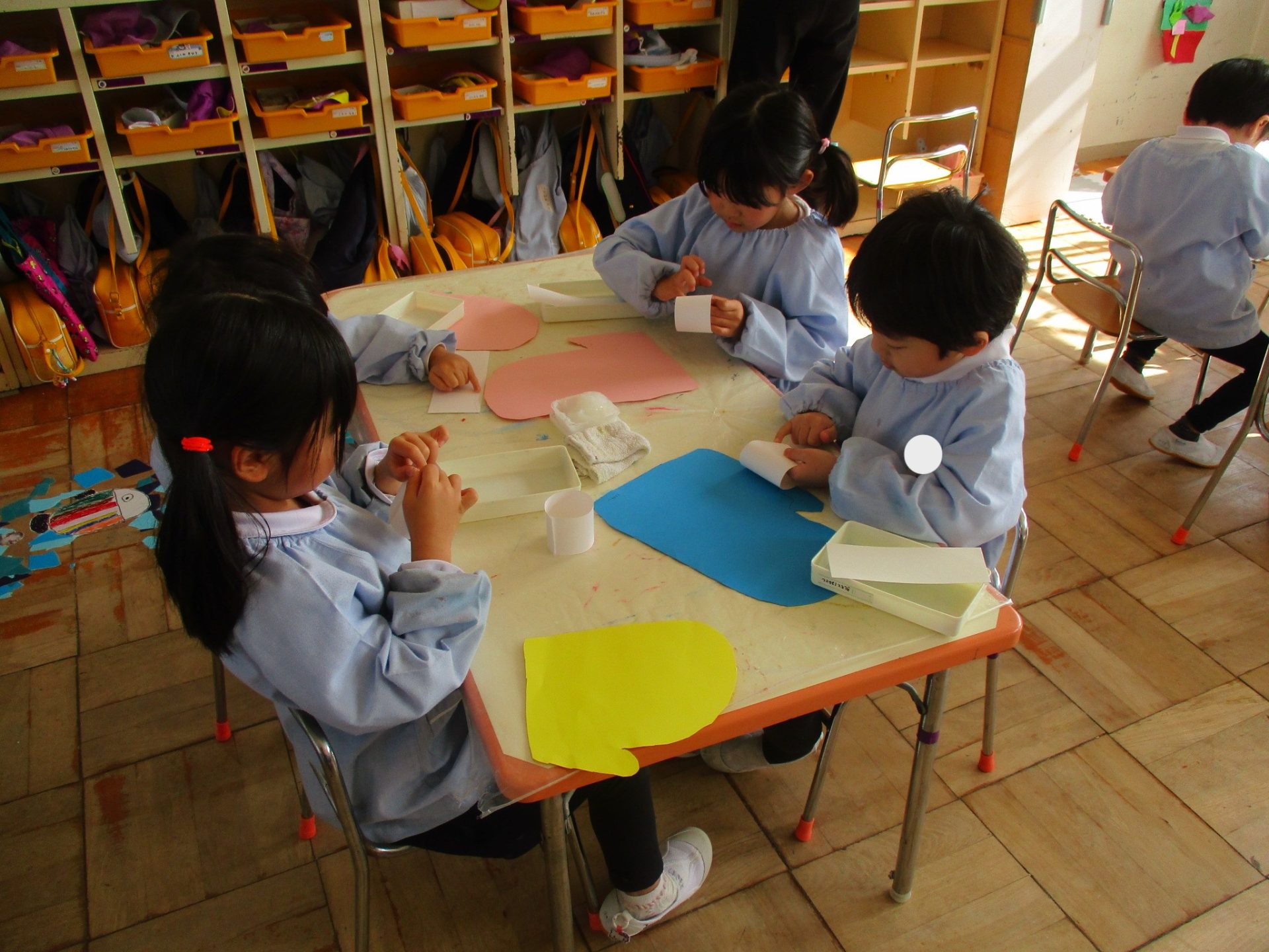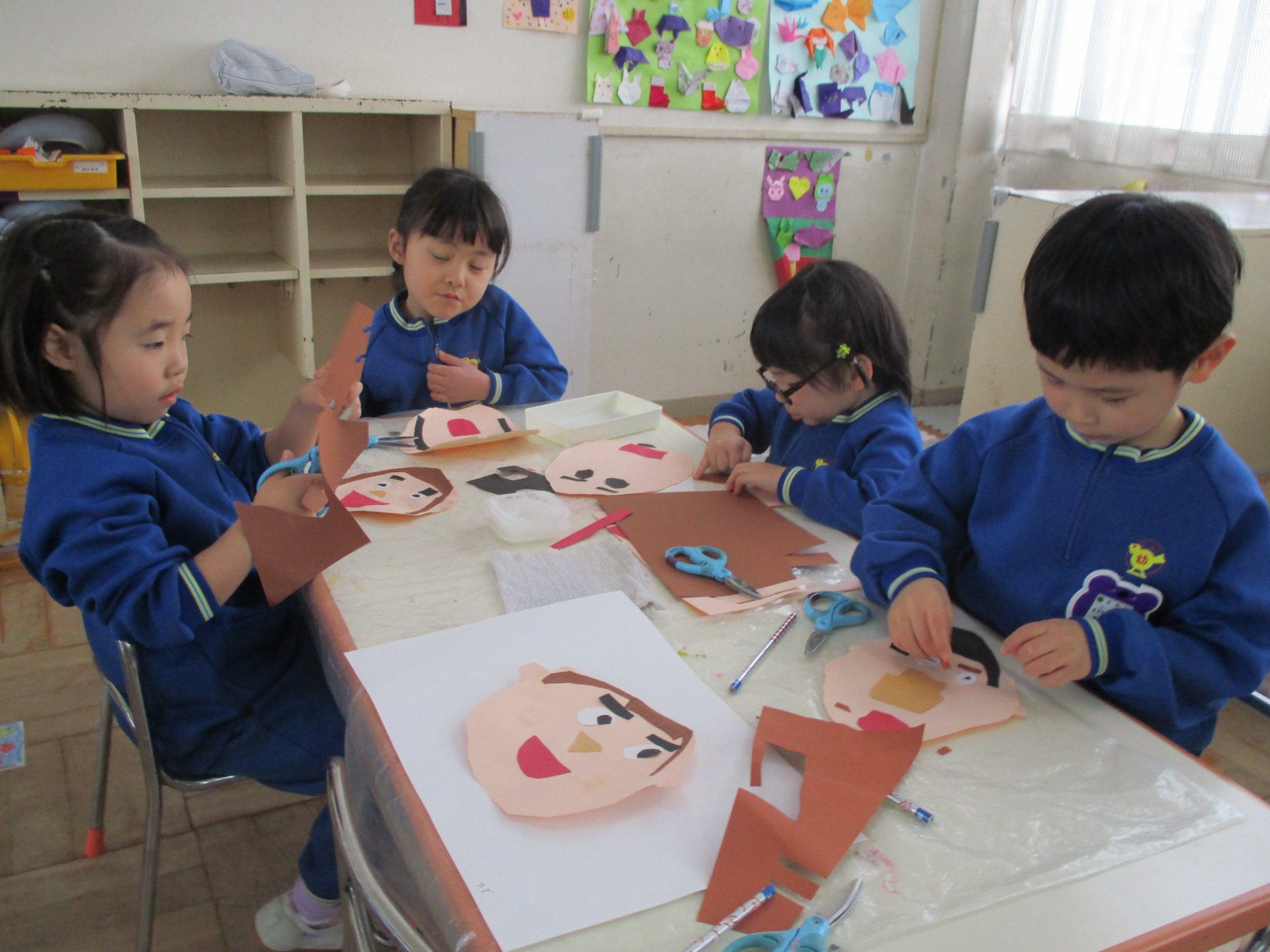 先日持ち帰った作品袋の制作の様子です。年中組では、自分の顔を初めて全部画用紙で作ってみました。一つ一つパーツを確認しながら作っていた子ども達。完成すると嬉しそうに見せてくれました!顔の周りには、折り紙でハートを折りました♡