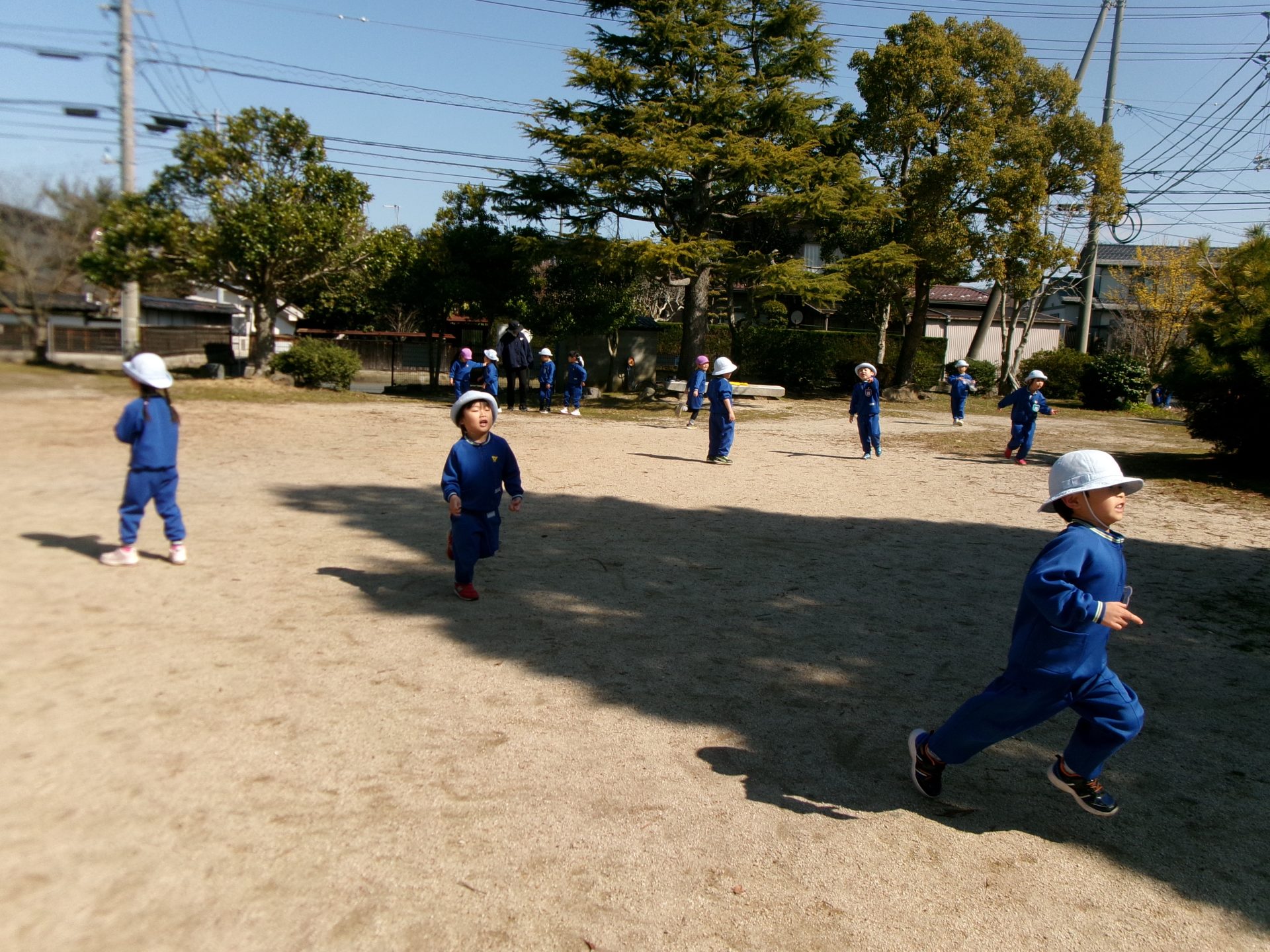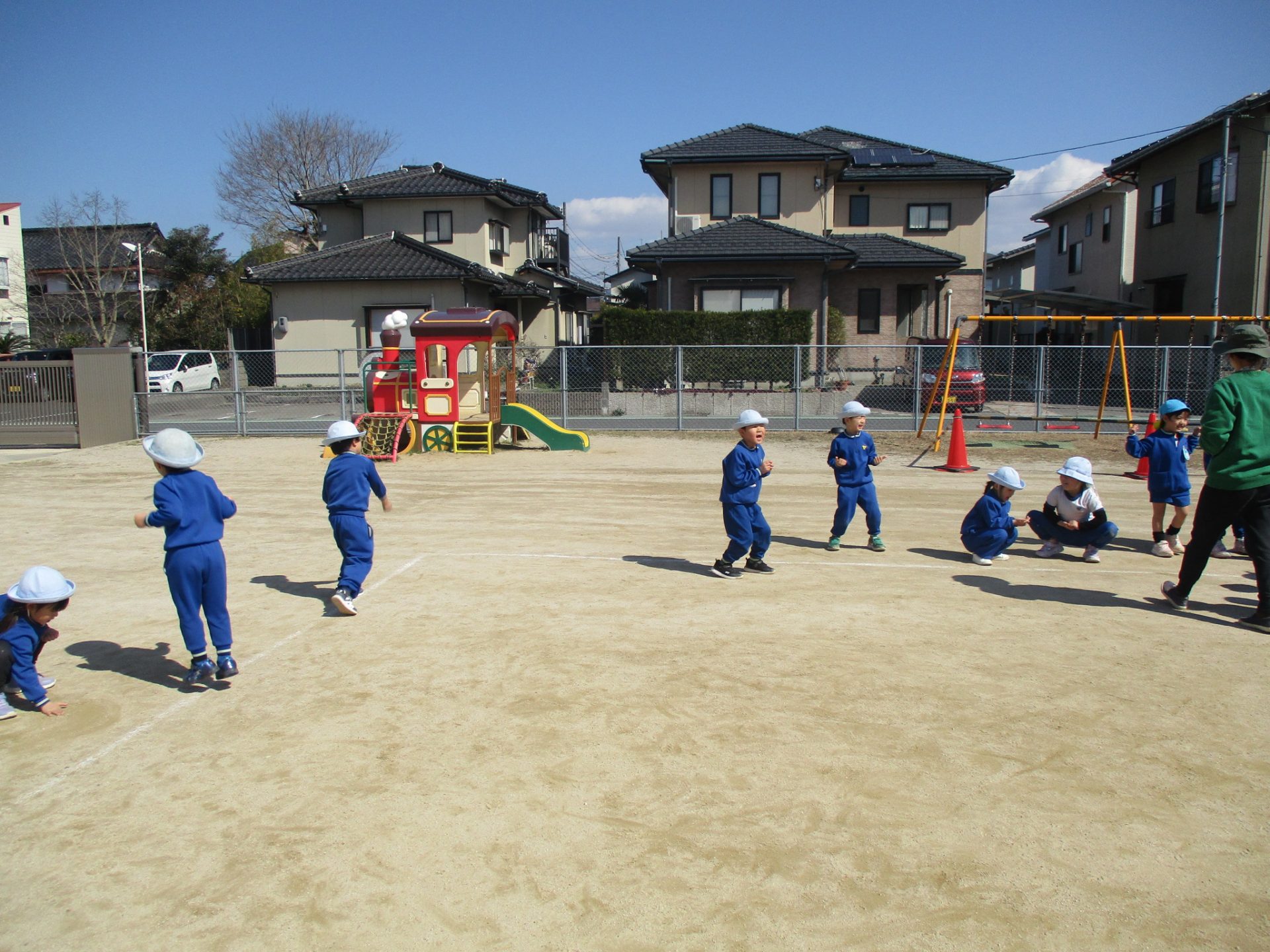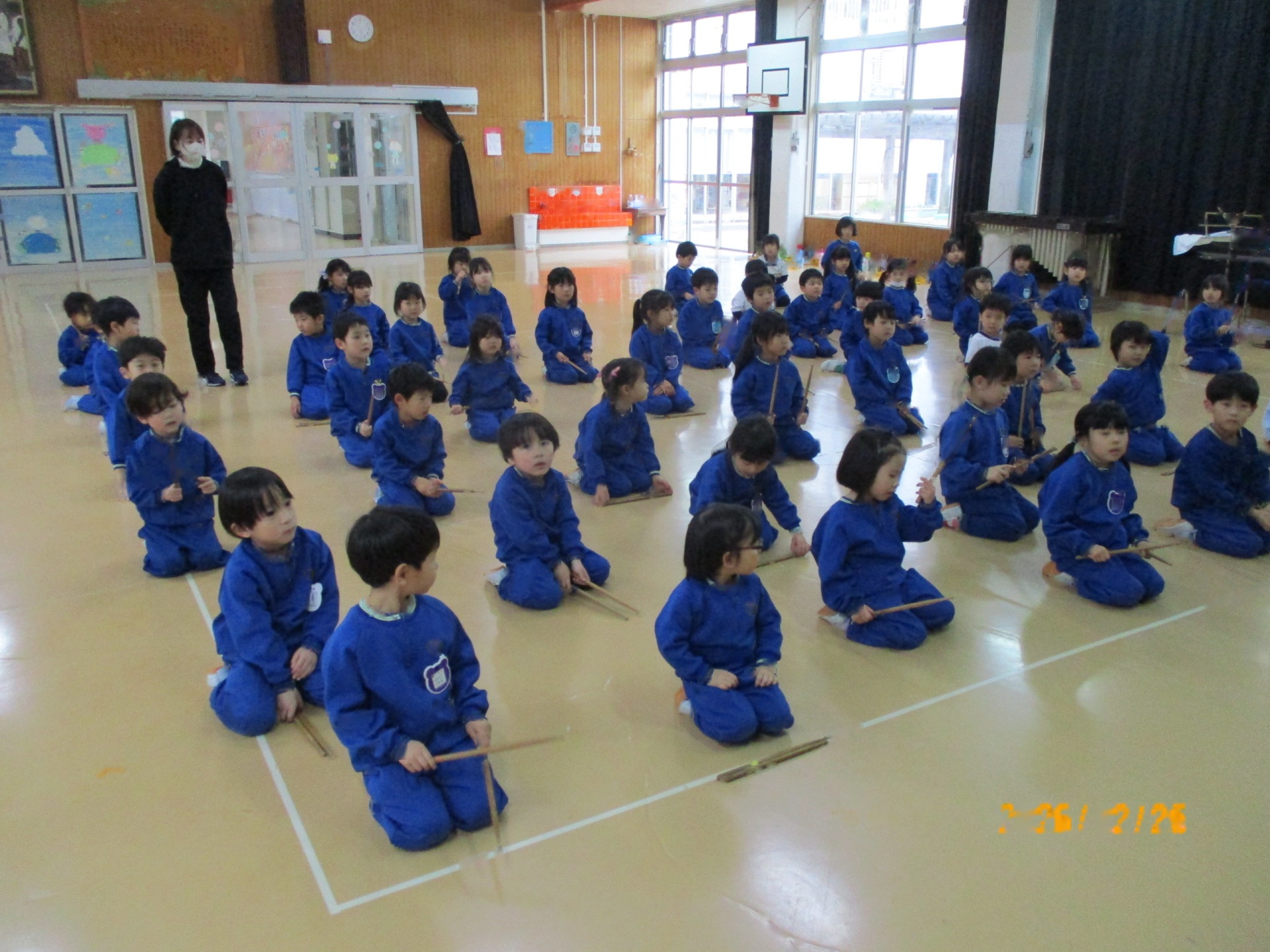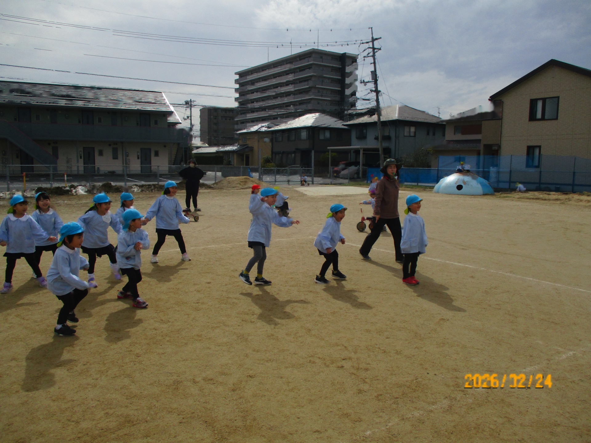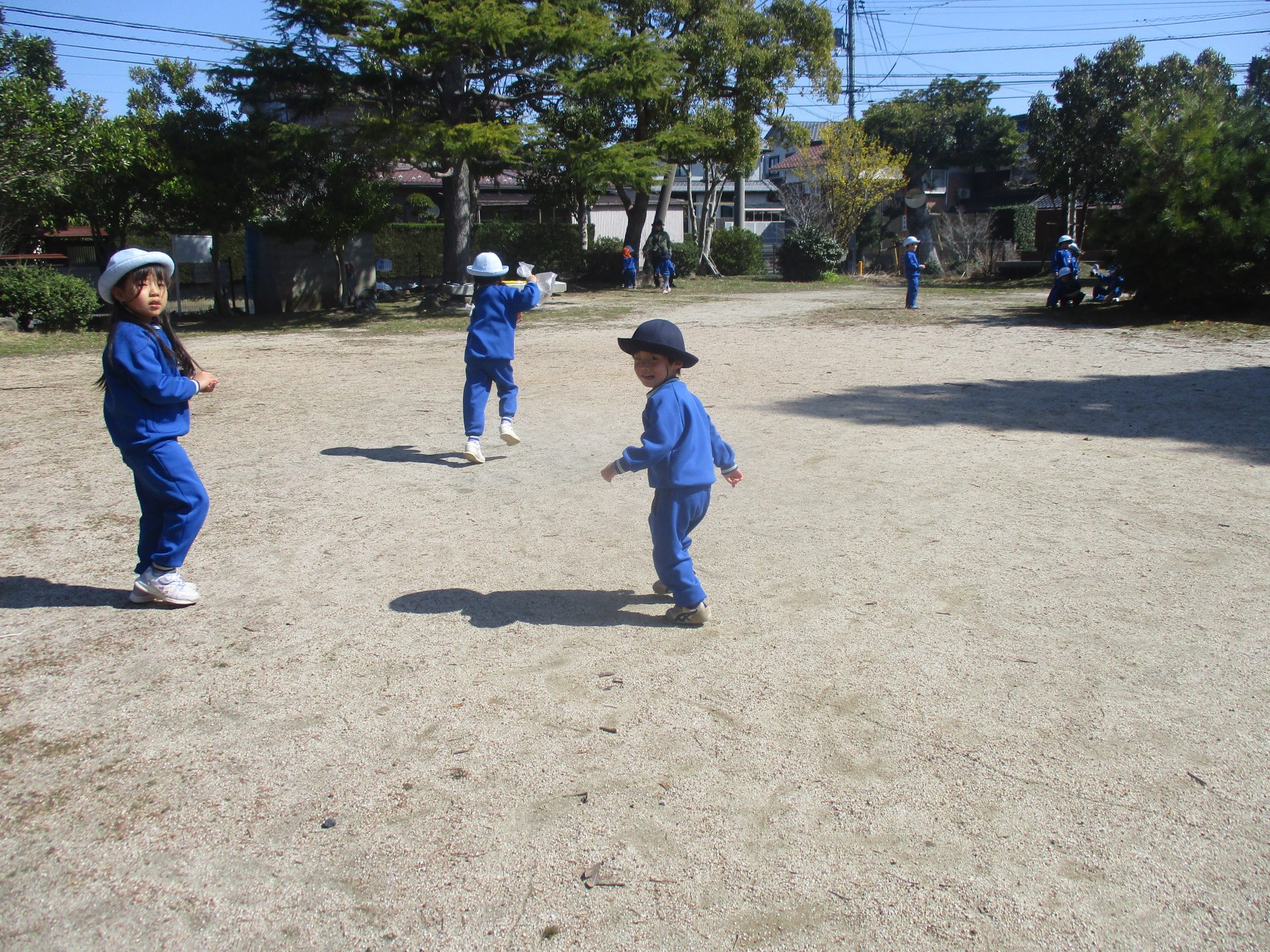 3学期に入り、マーチングの練習を始めました。年長組のお兄さんお姉さんの姿を見て憧れを抱いていた子ども達は、「マーチングの練習しようか!」と言うと「よっしゃー!」と喜んでいます😊まずは、基本動作から始めました。気を付け・休め、できるかな?笛の音に合わせて「や!」と元気な掛け声が響きます。