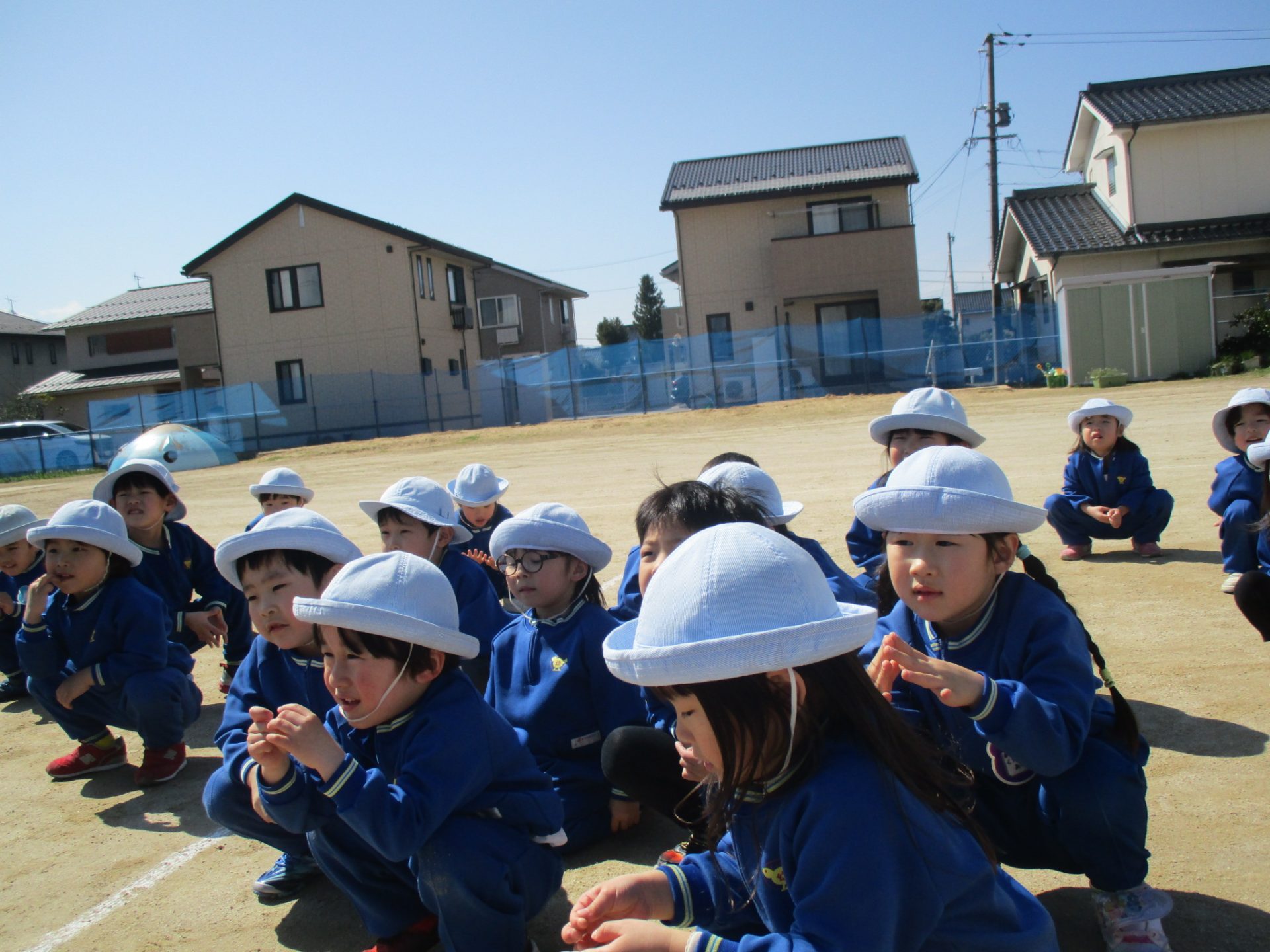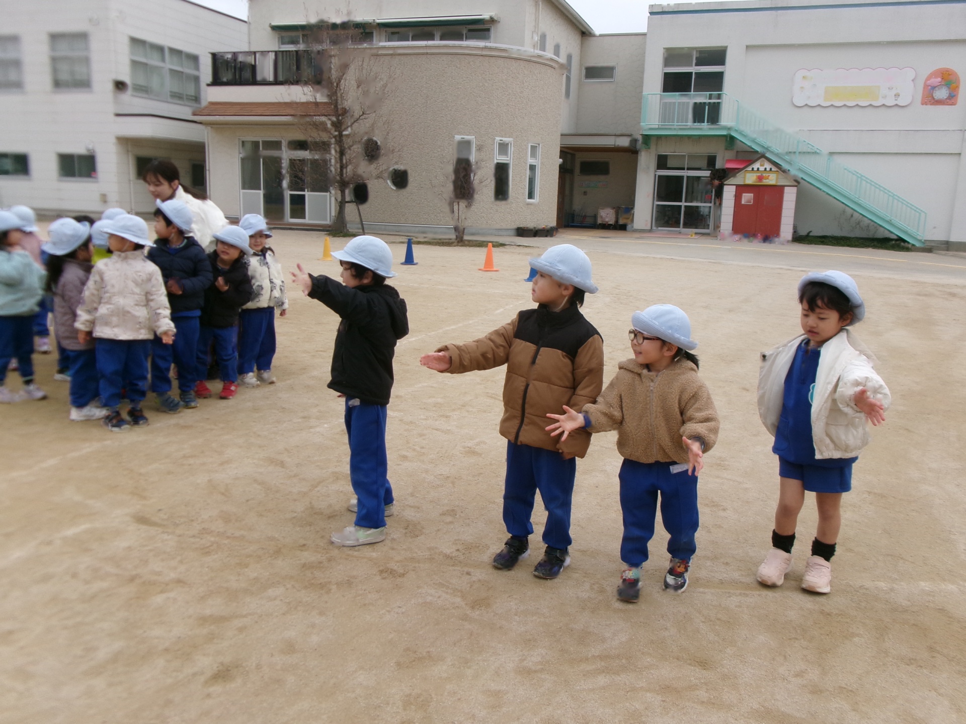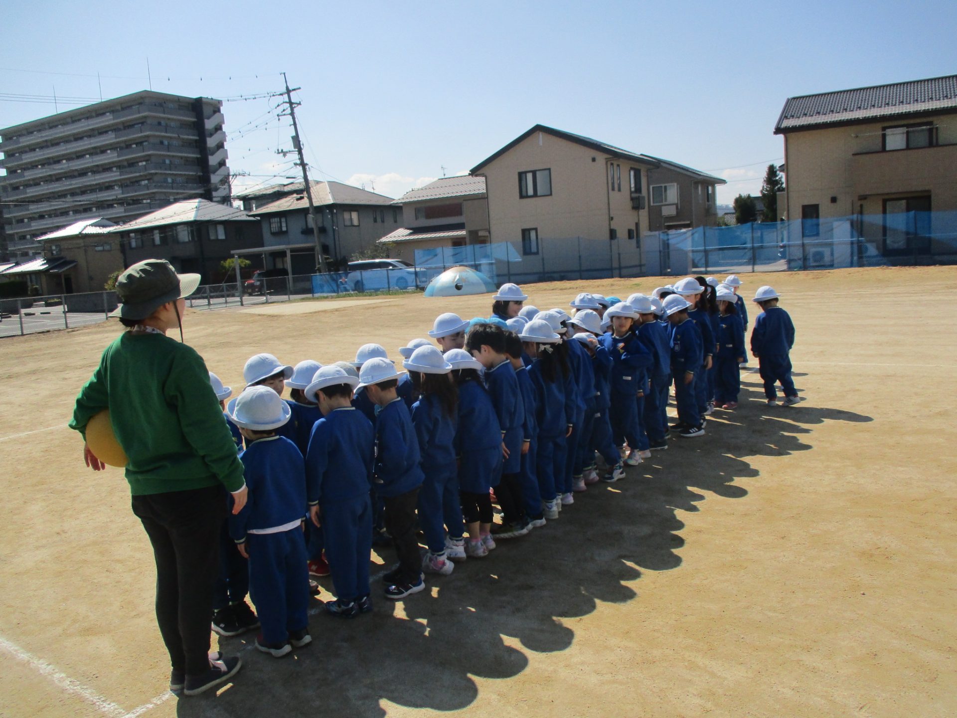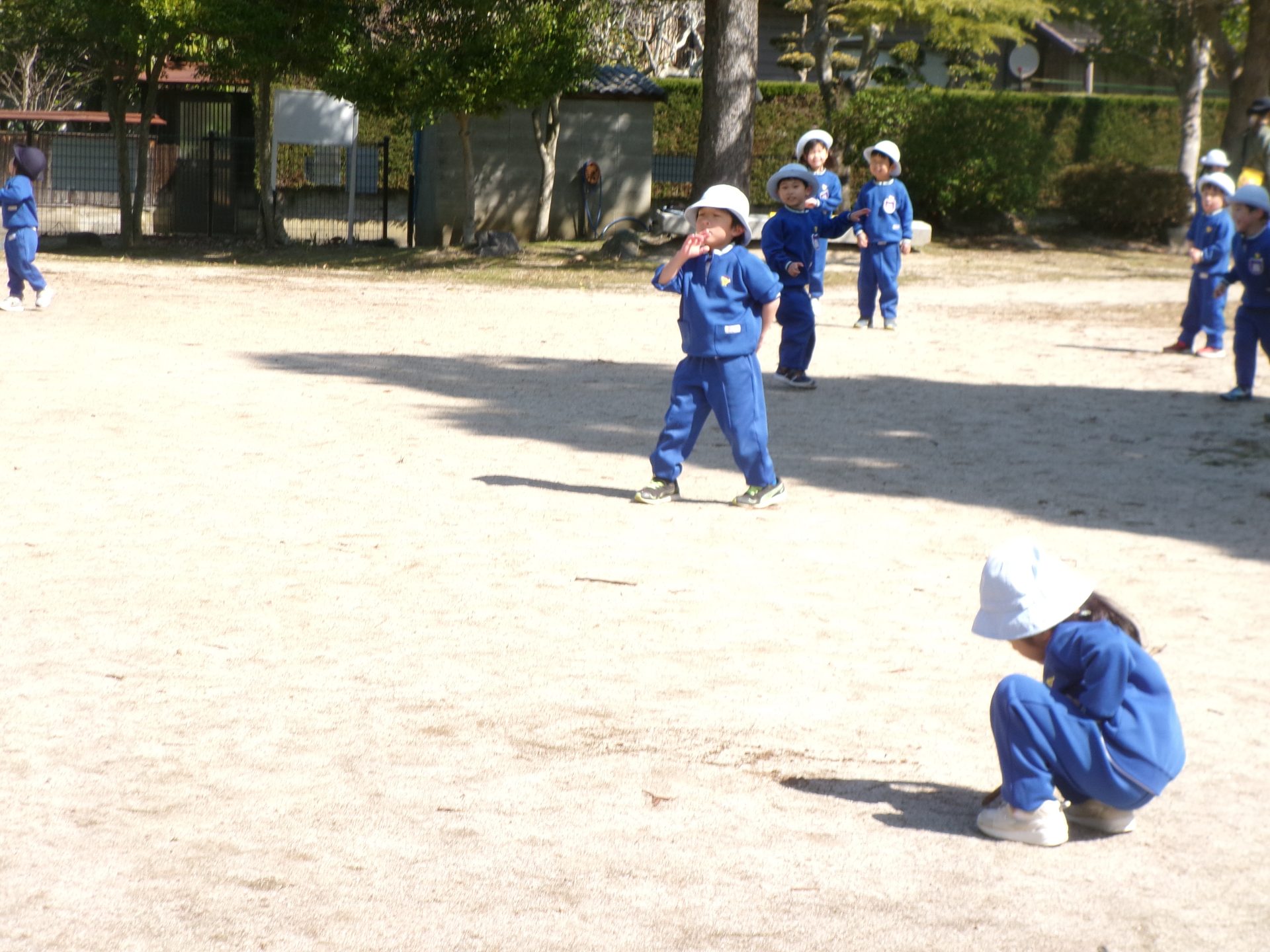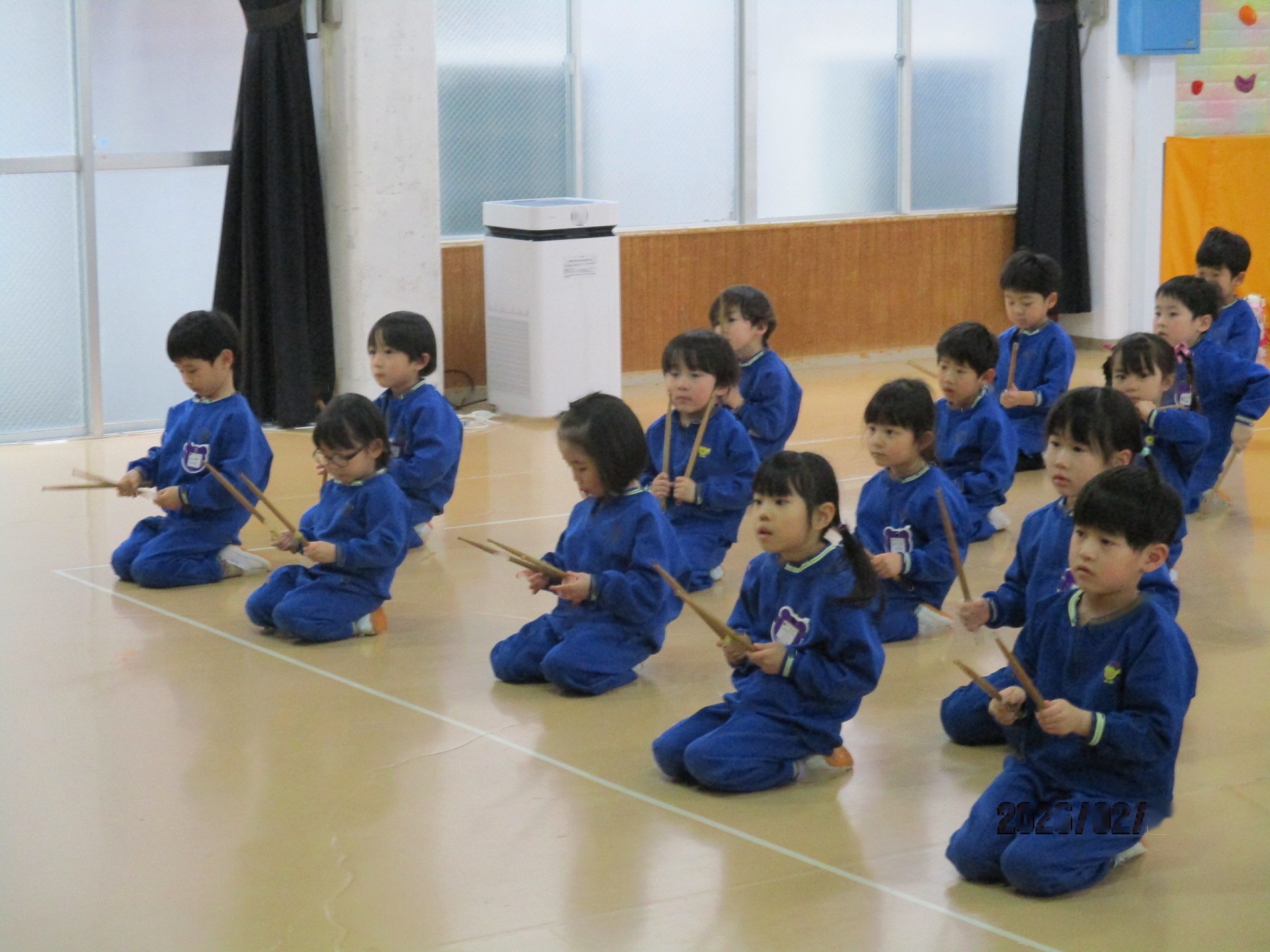 3学期に入り、マーチングの練習を始めました。年長組のお兄さんお姉さんの姿を見て憧れを抱いていた子ども達は、「マーチングの練習しようか!」と言うと「よっしゃー!」と喜んでいます😊まずは、基本動作から始めました。気を付け・休め、できるかな?笛の音に合わせて「や!」と元気な掛け声が響きます。