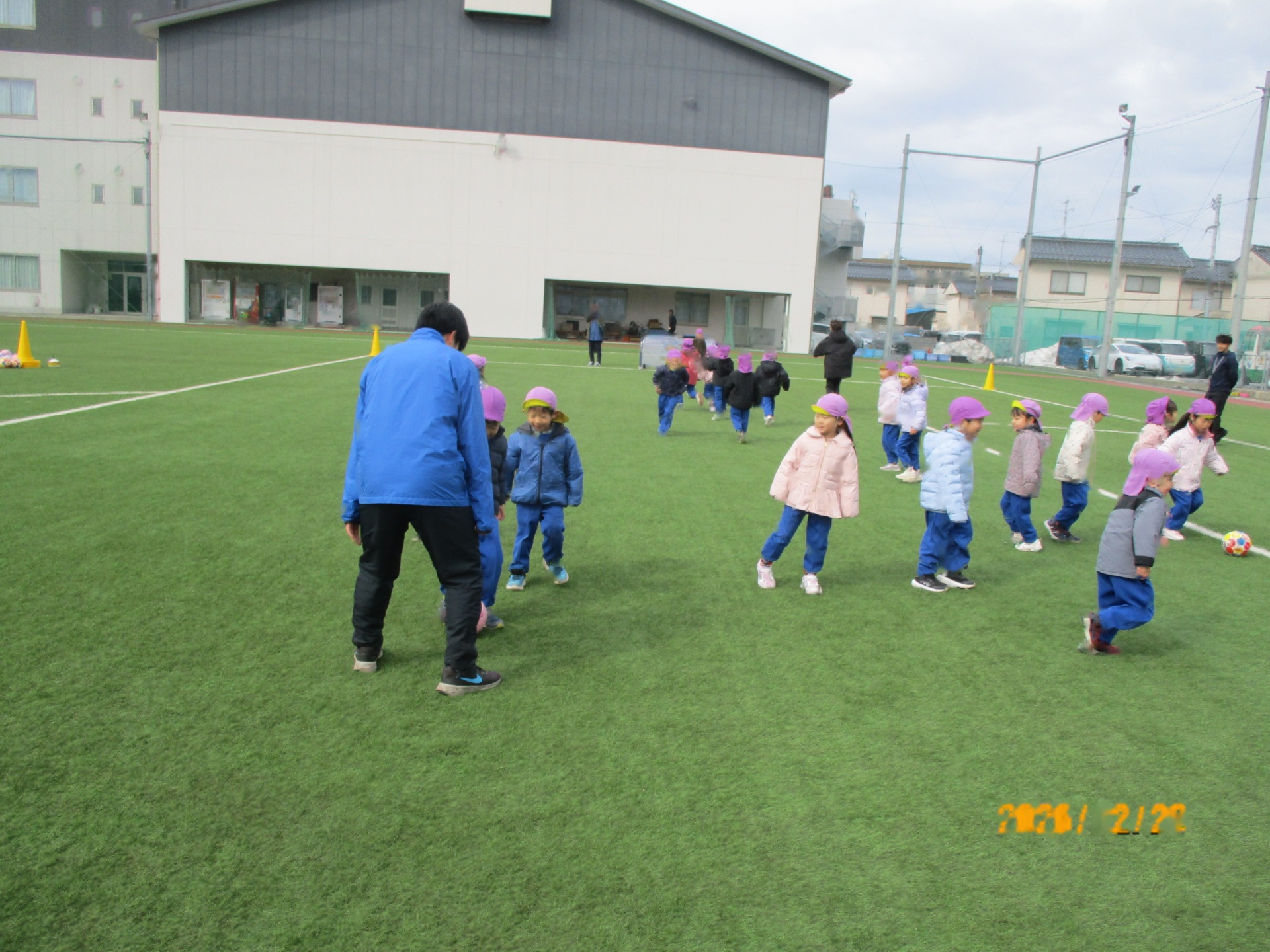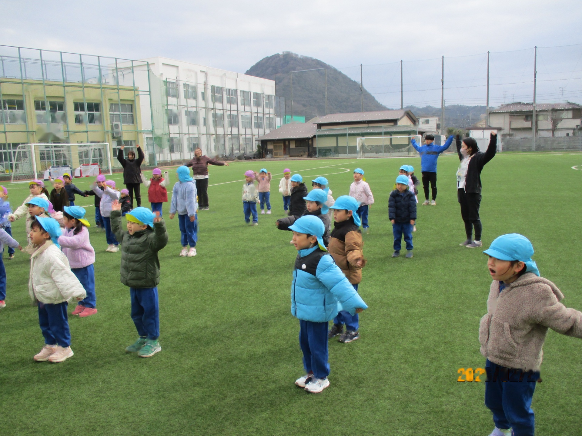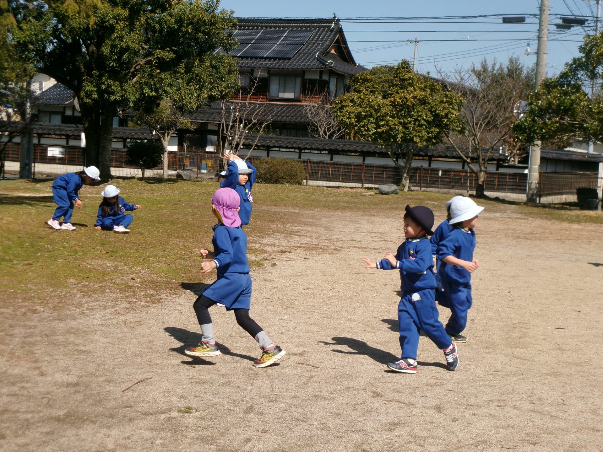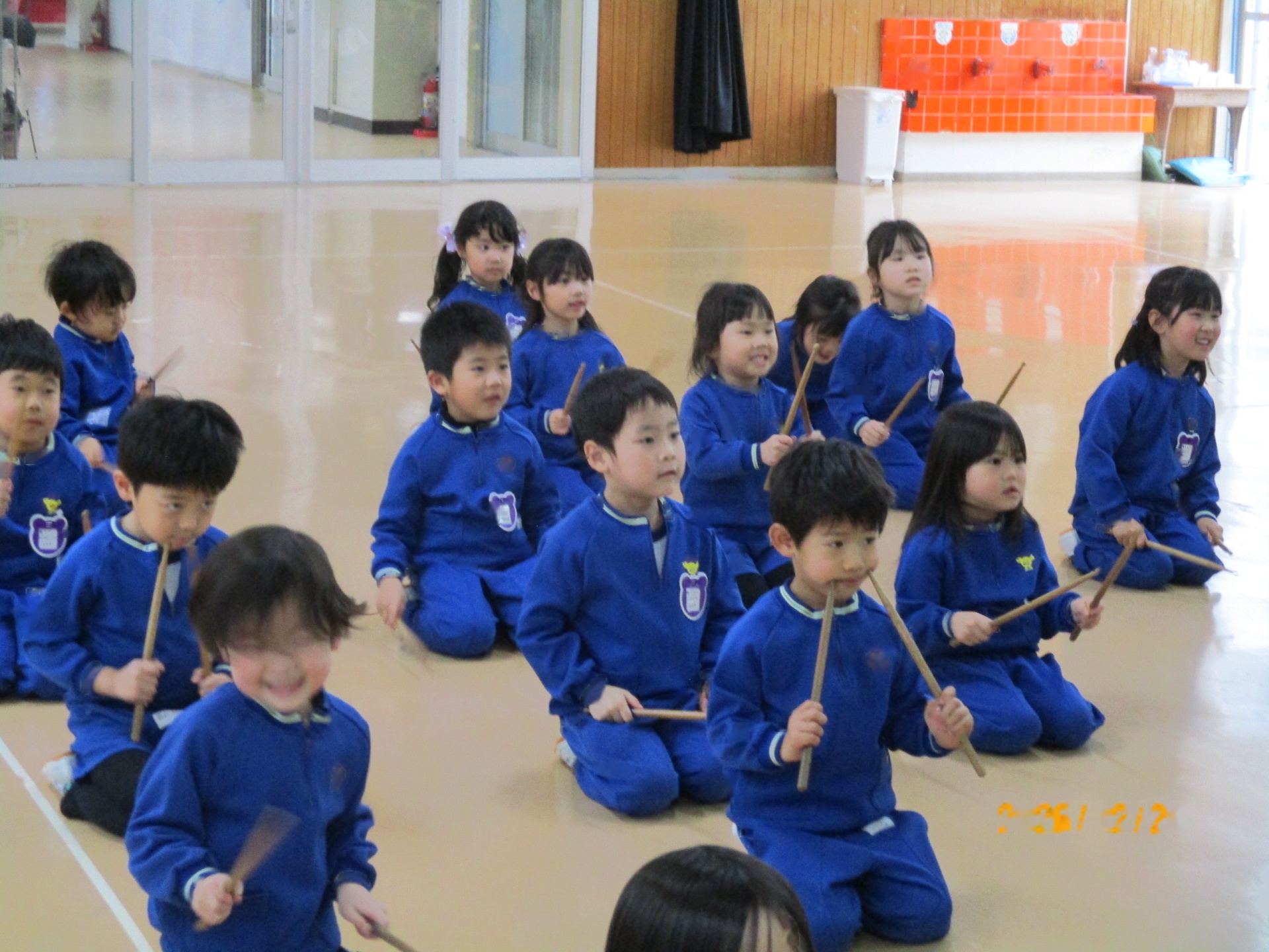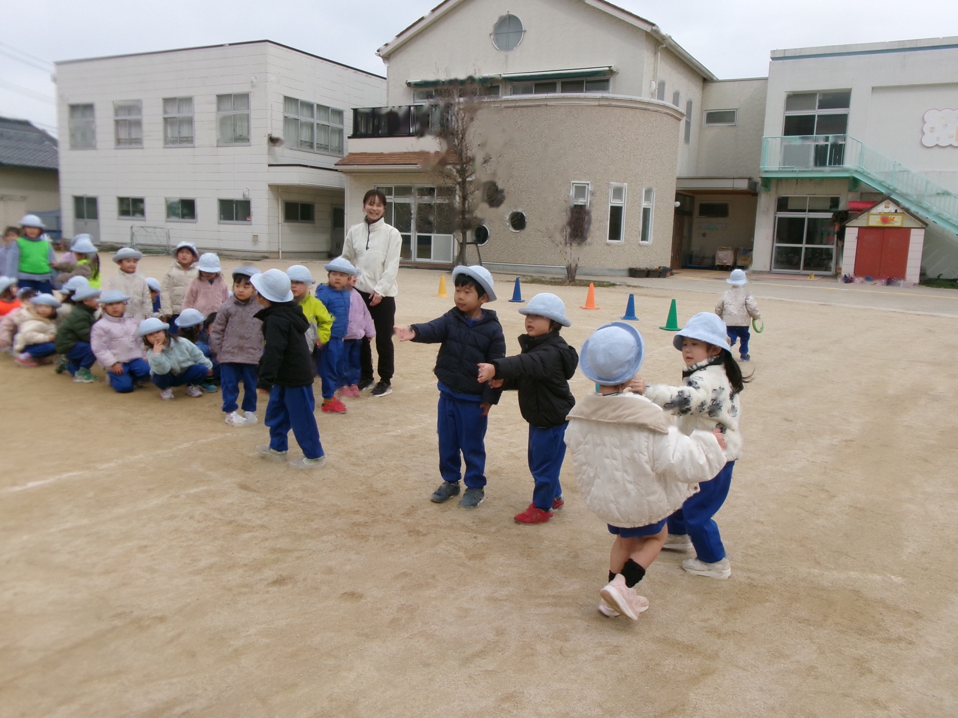 3学期に入り、マーチングの練習を始めました。年長組のお兄さんお姉さんの姿を見て憧れを抱いていた子ども達は、「マーチングの練習しようか!」と言うと「よっしゃー!」と喜んでいます😊まずは、基本動作から始めました。気を付け・休め、できるかな?笛の音に合わせて「や!」と元気な掛け声が響きます。