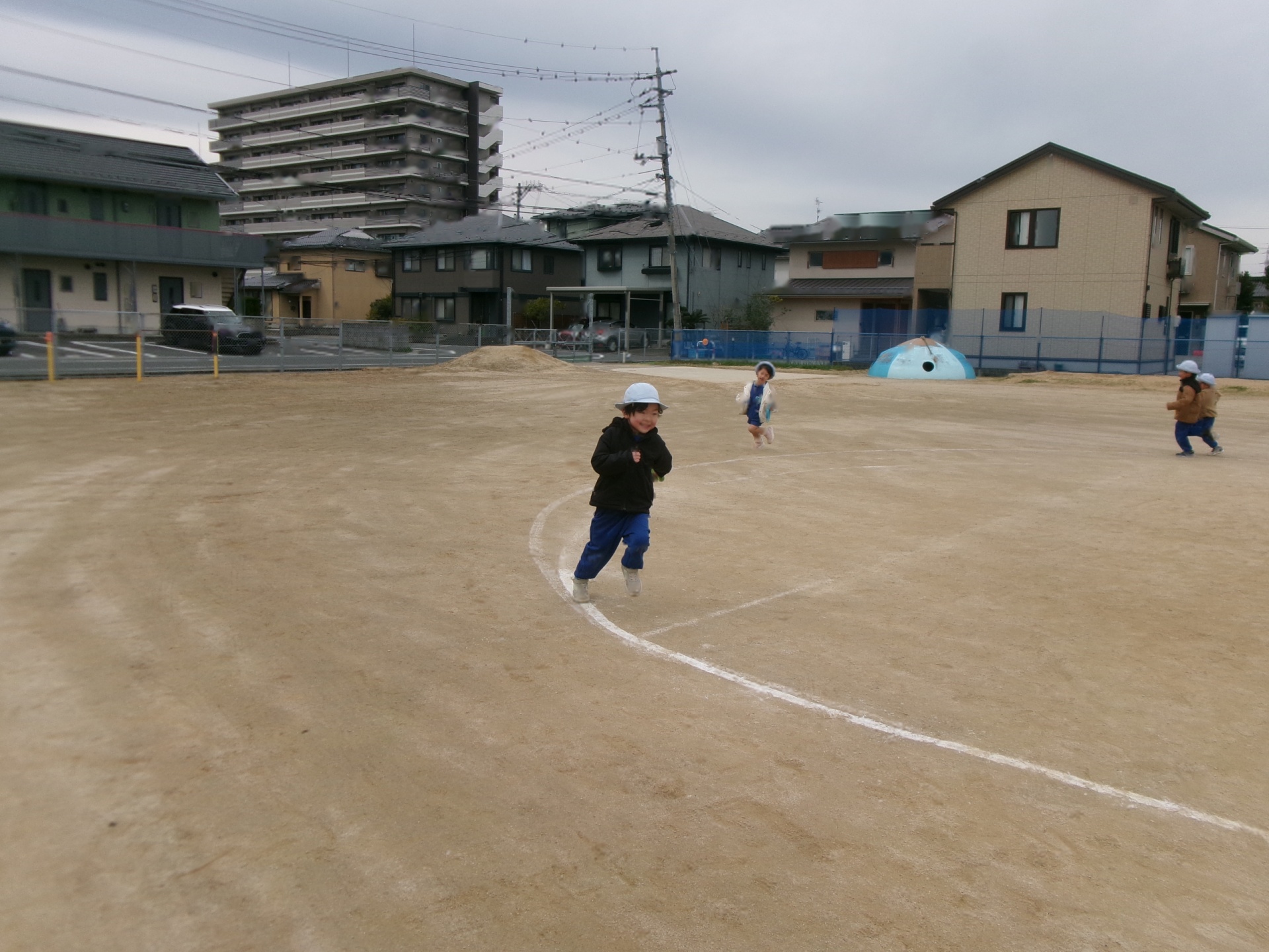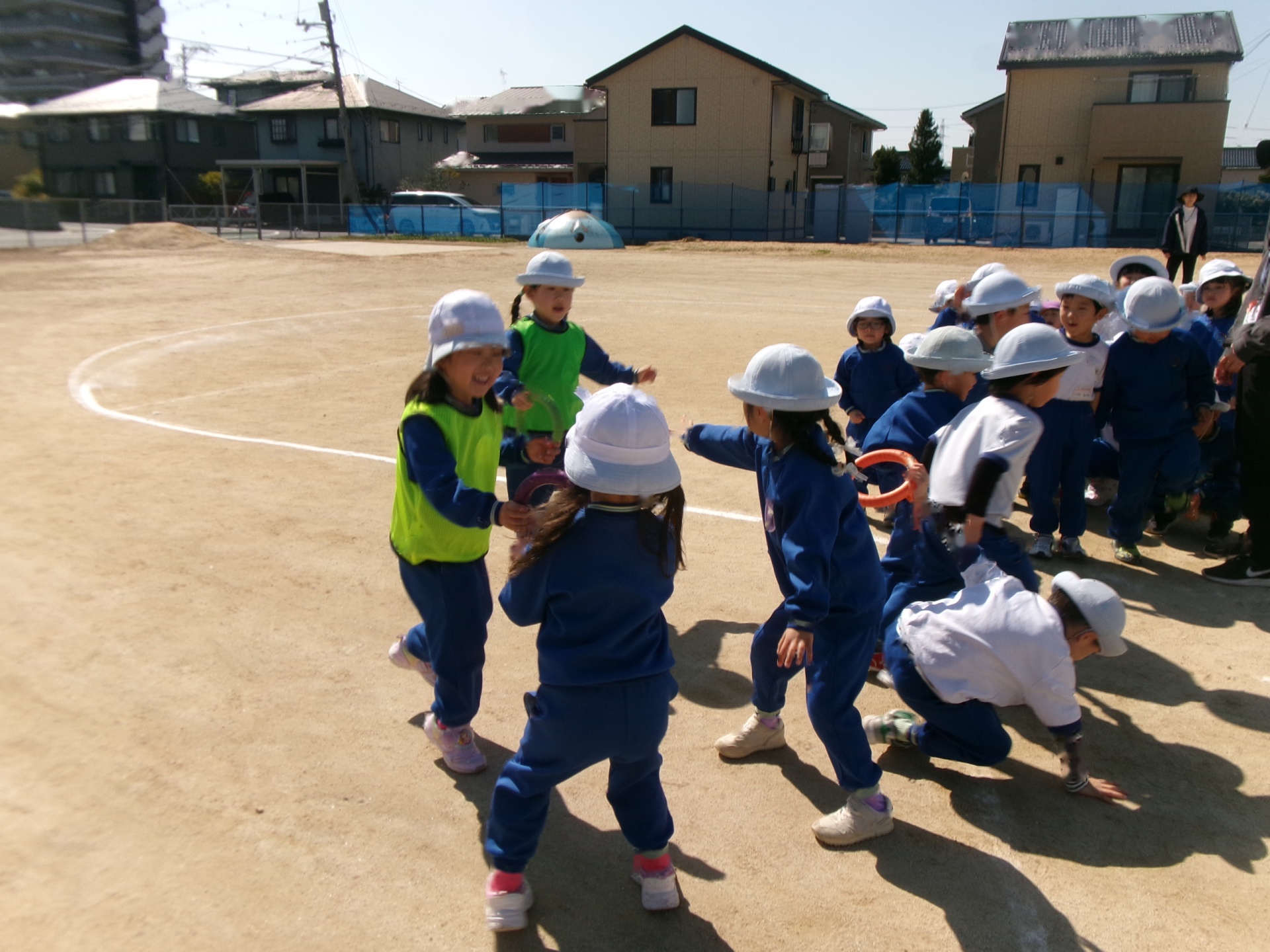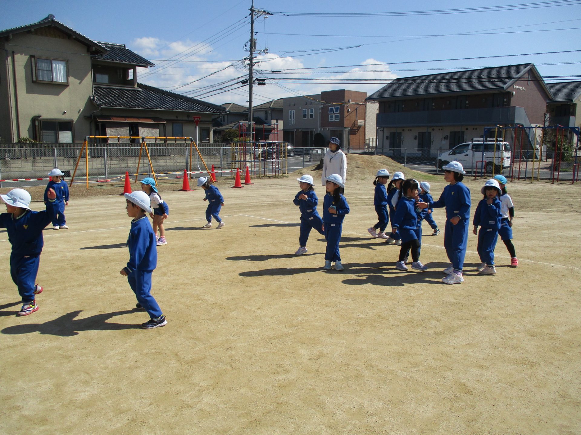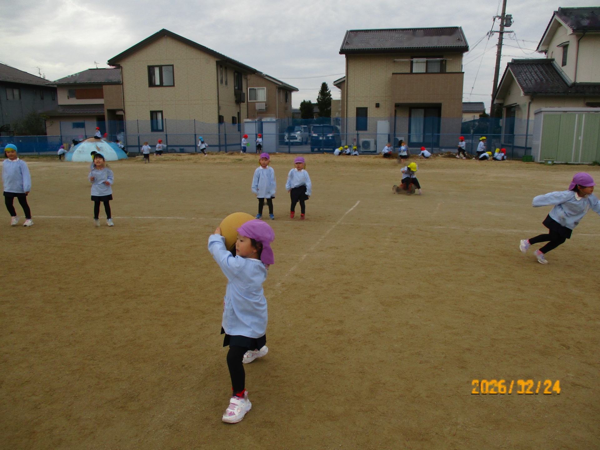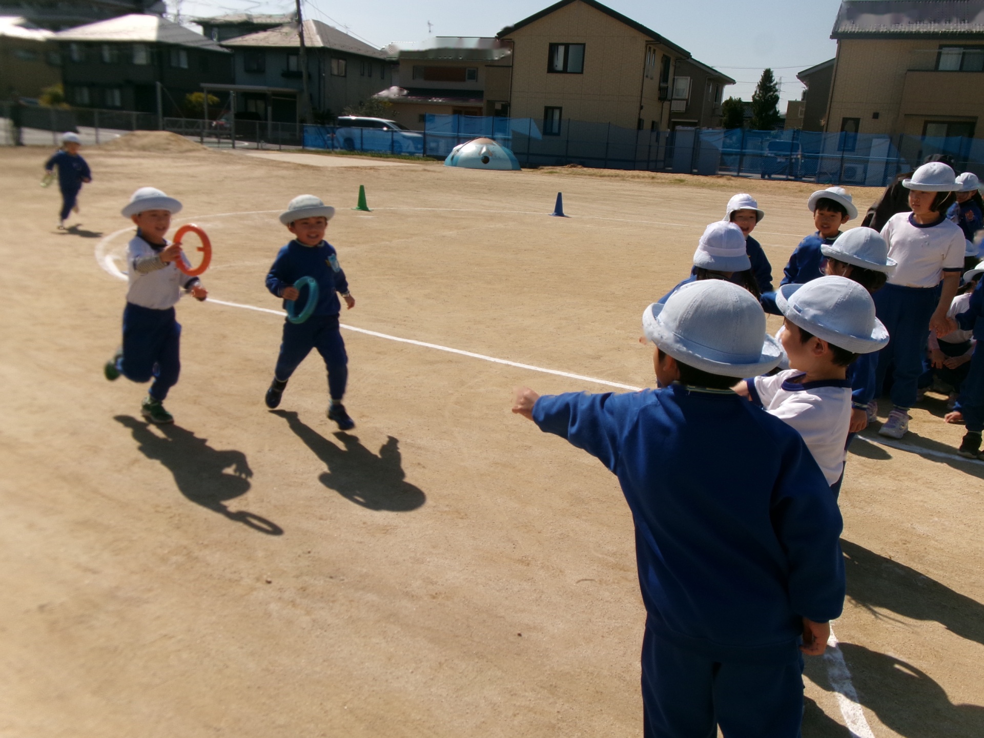 園庭でリレーとドッヂボールをしました!初めにルールを確認しました。今回はクラス対抗です!子ども達の負けられない戦いが始まります!