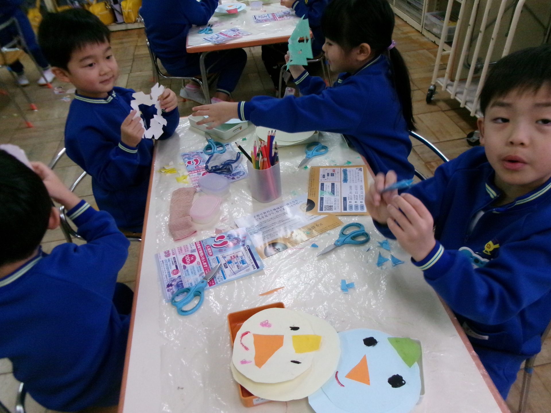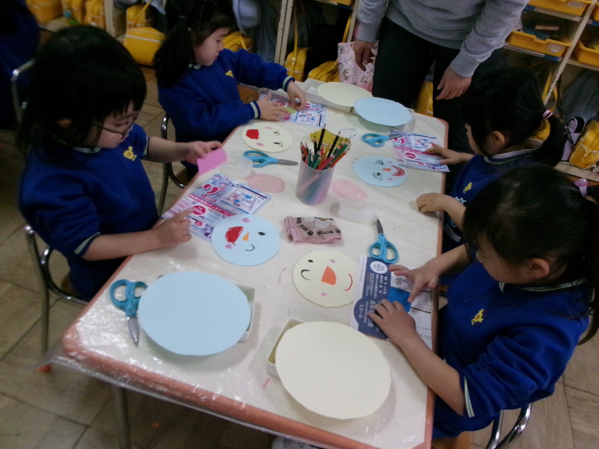 自分で手袋を切った後は、画用紙を丸くし、立体の雪だるまが完成!顔のパーツは画用紙に挑戦しました!そしてゆきだるまの周りには毛糸で雪の結晶も作りました☆