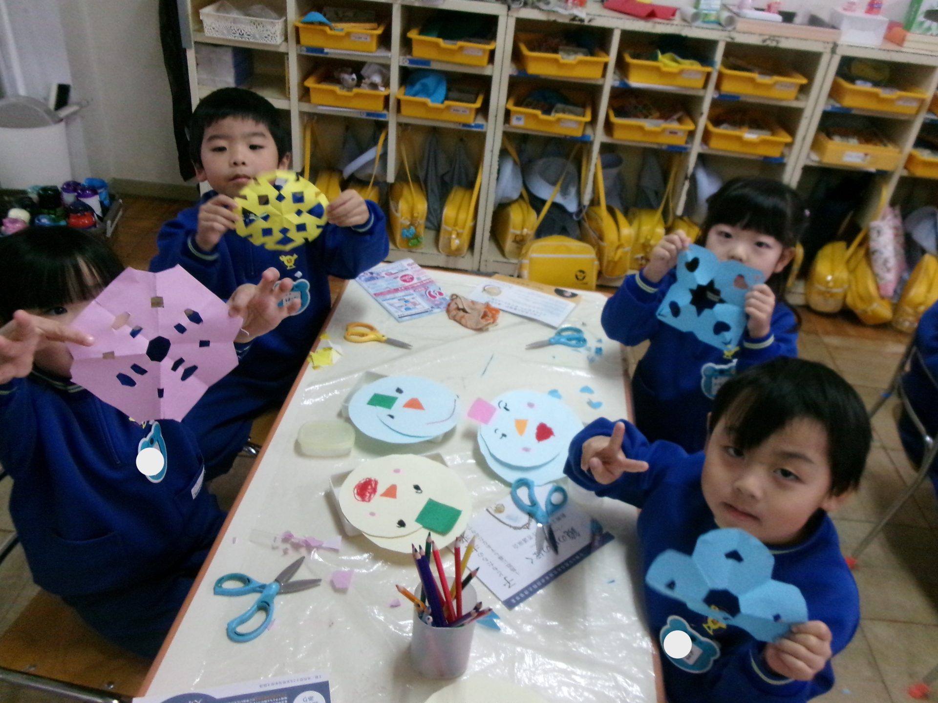 画用紙で丸を切り、人参の鼻・バケツは自分で考えながら切りました!そして、今回は雪の結晶に挑戦!はさみで少しずつ切っていくと形が変わり、そして友達とも形が違っていることに気づき、見せ合いこして楽しんでいました☆