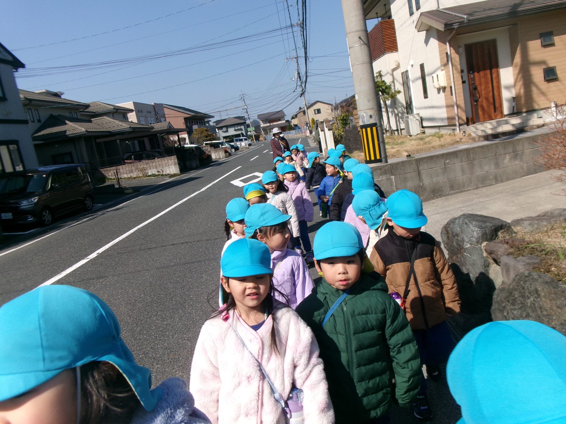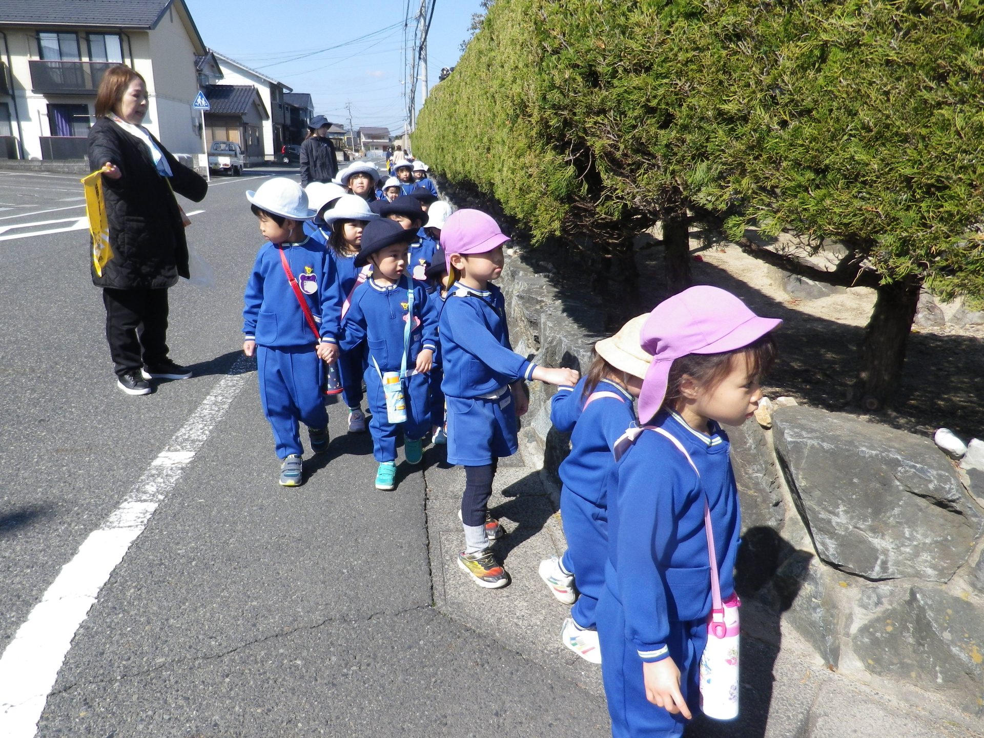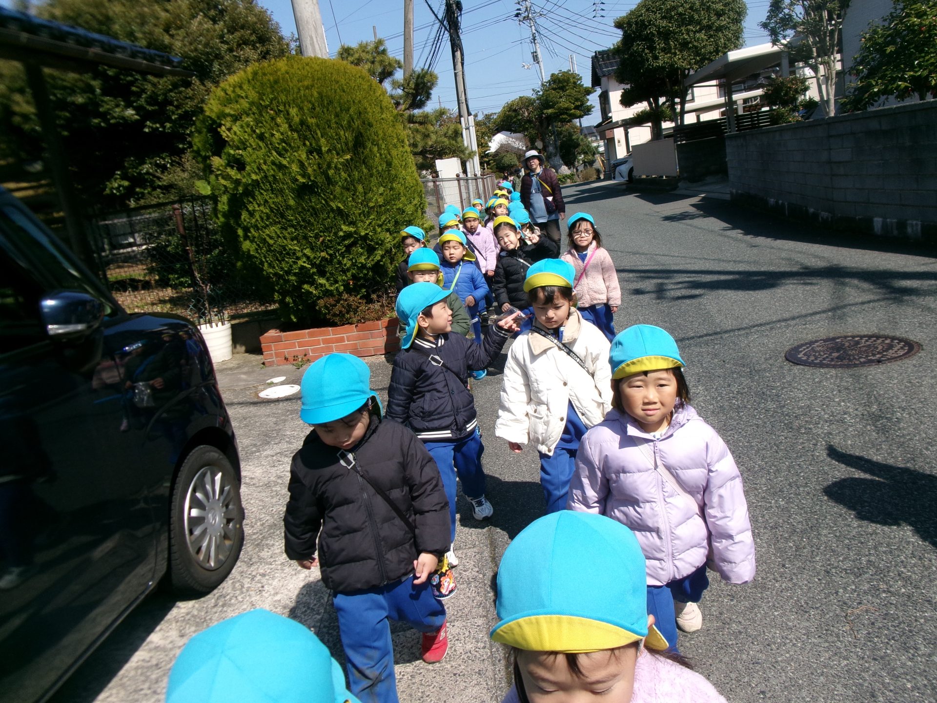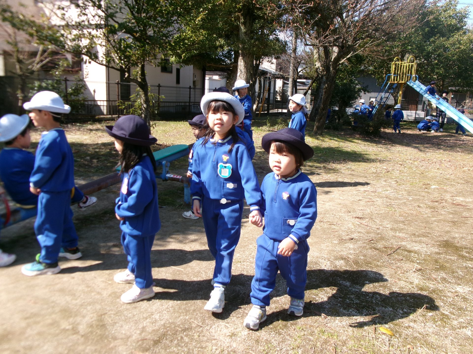 年中さんと2歳さんで近くの公園まで歩いて行きました。お兄さん、お姉さんが優しく手を繋いでくれたり、声をかけてくれたりして、嬉しそうに歩く2歳さんでした♪