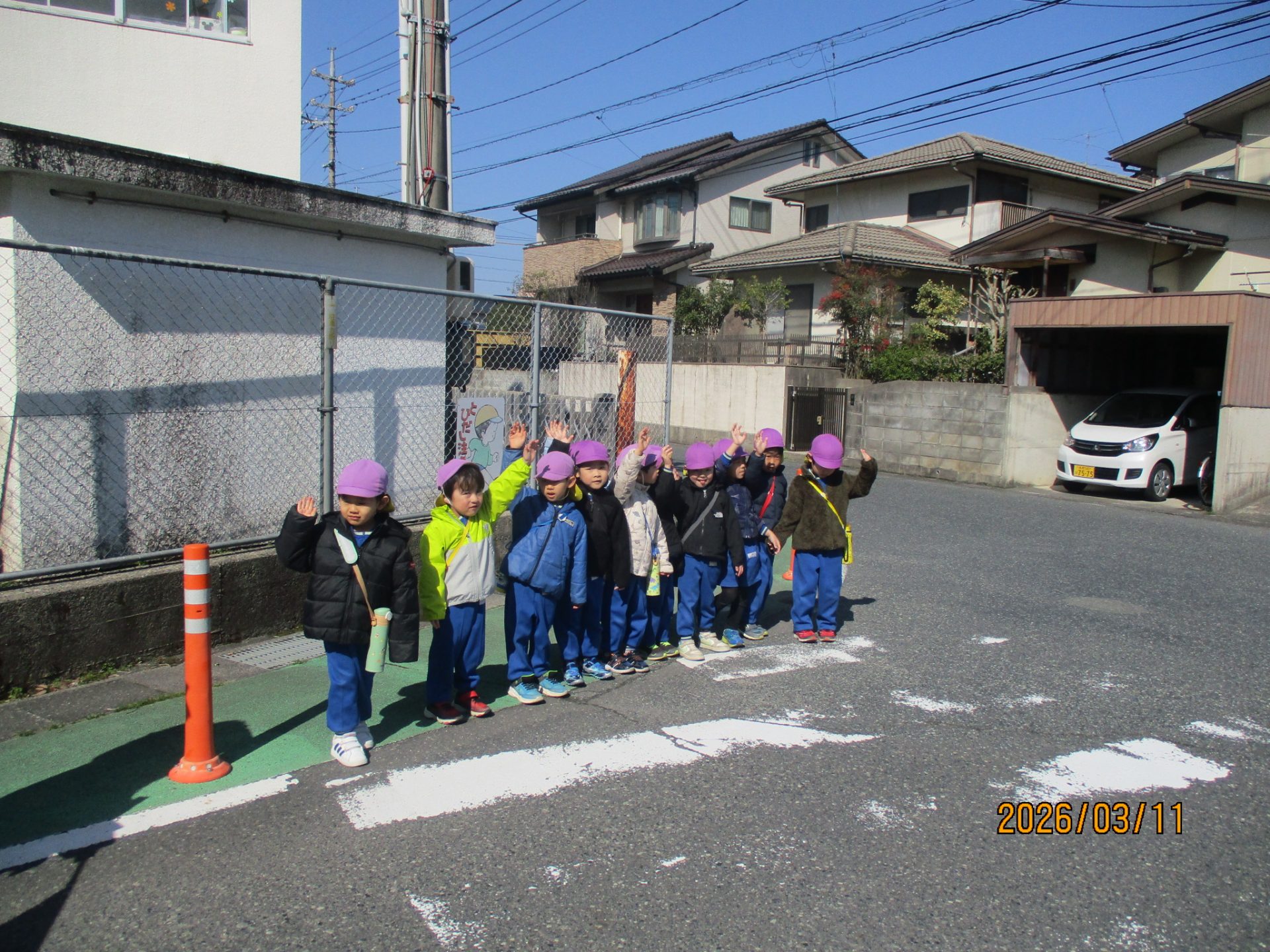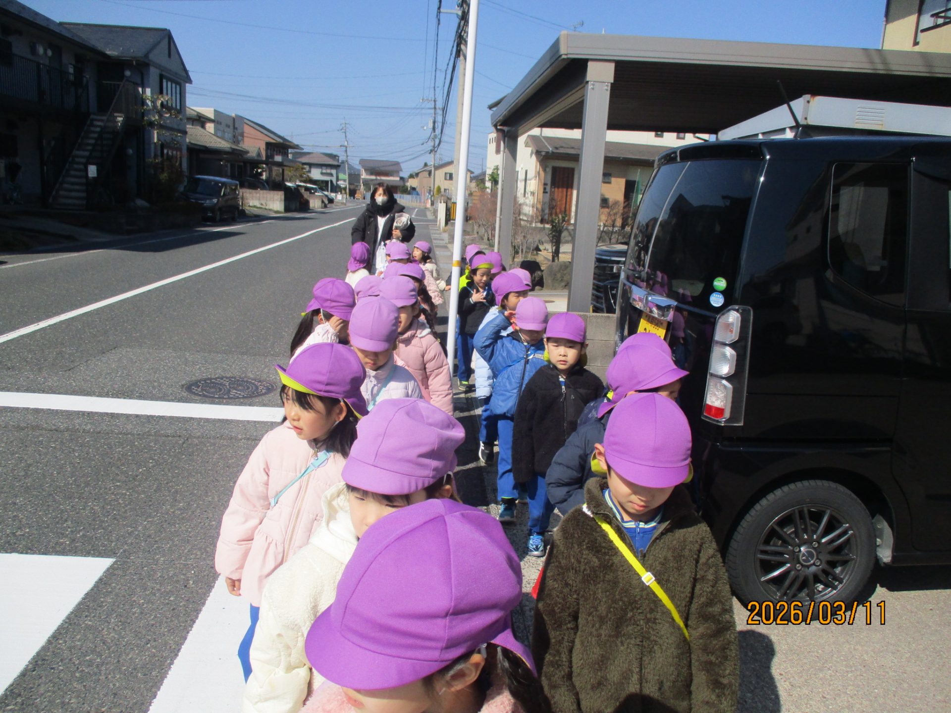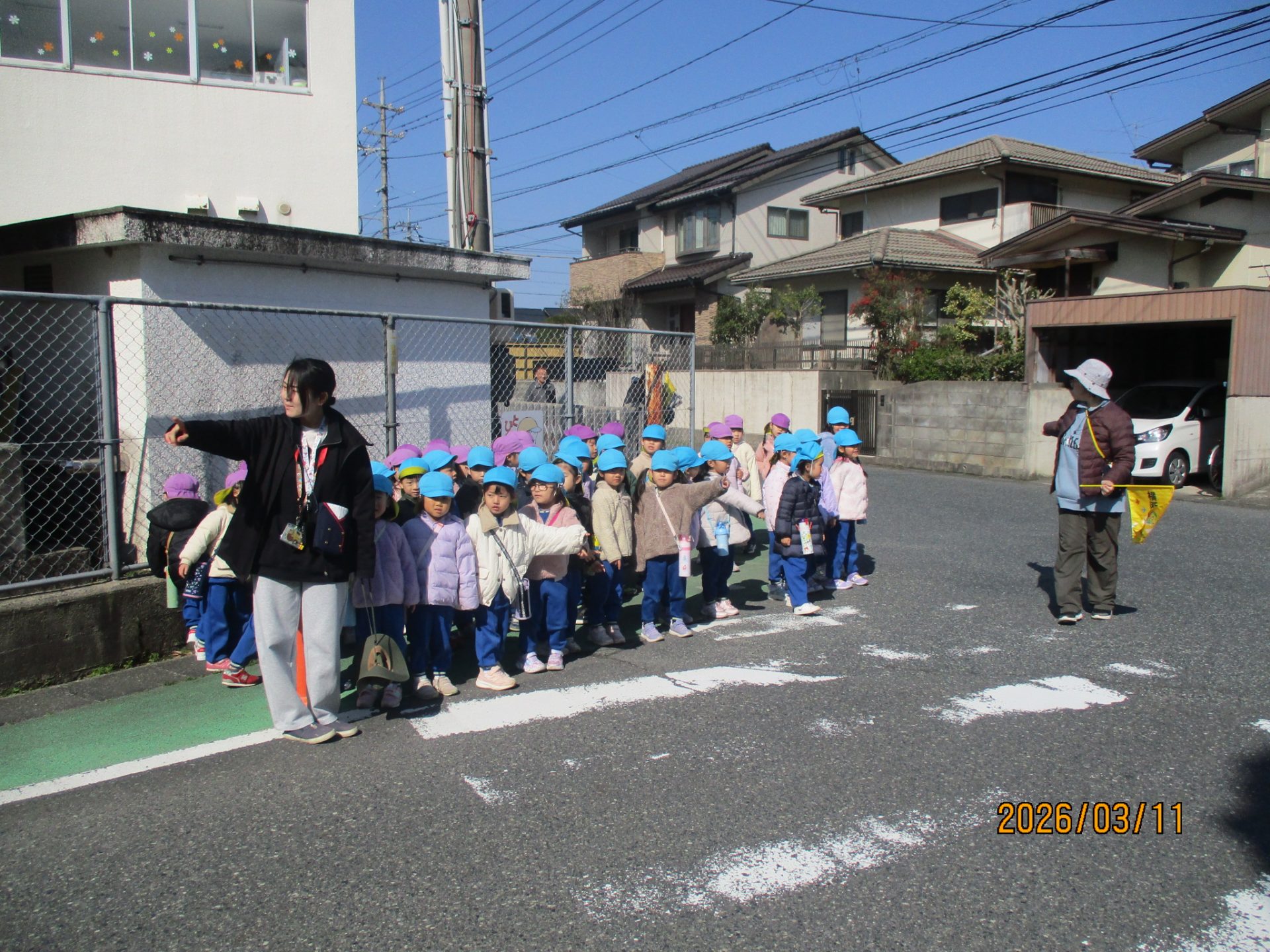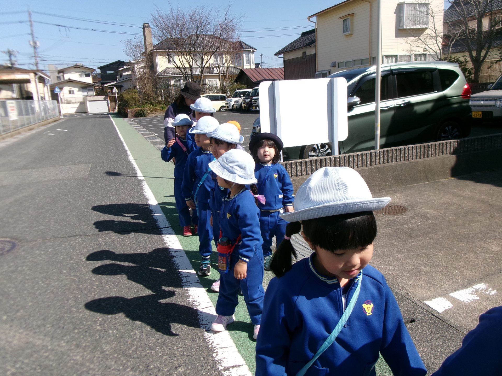 道路の端を歩くことや、横断歩道では車が来ていないか右と左を確認してから手をあげて渡ることなど、交通ルールを子ども達と確認してから出かけました。