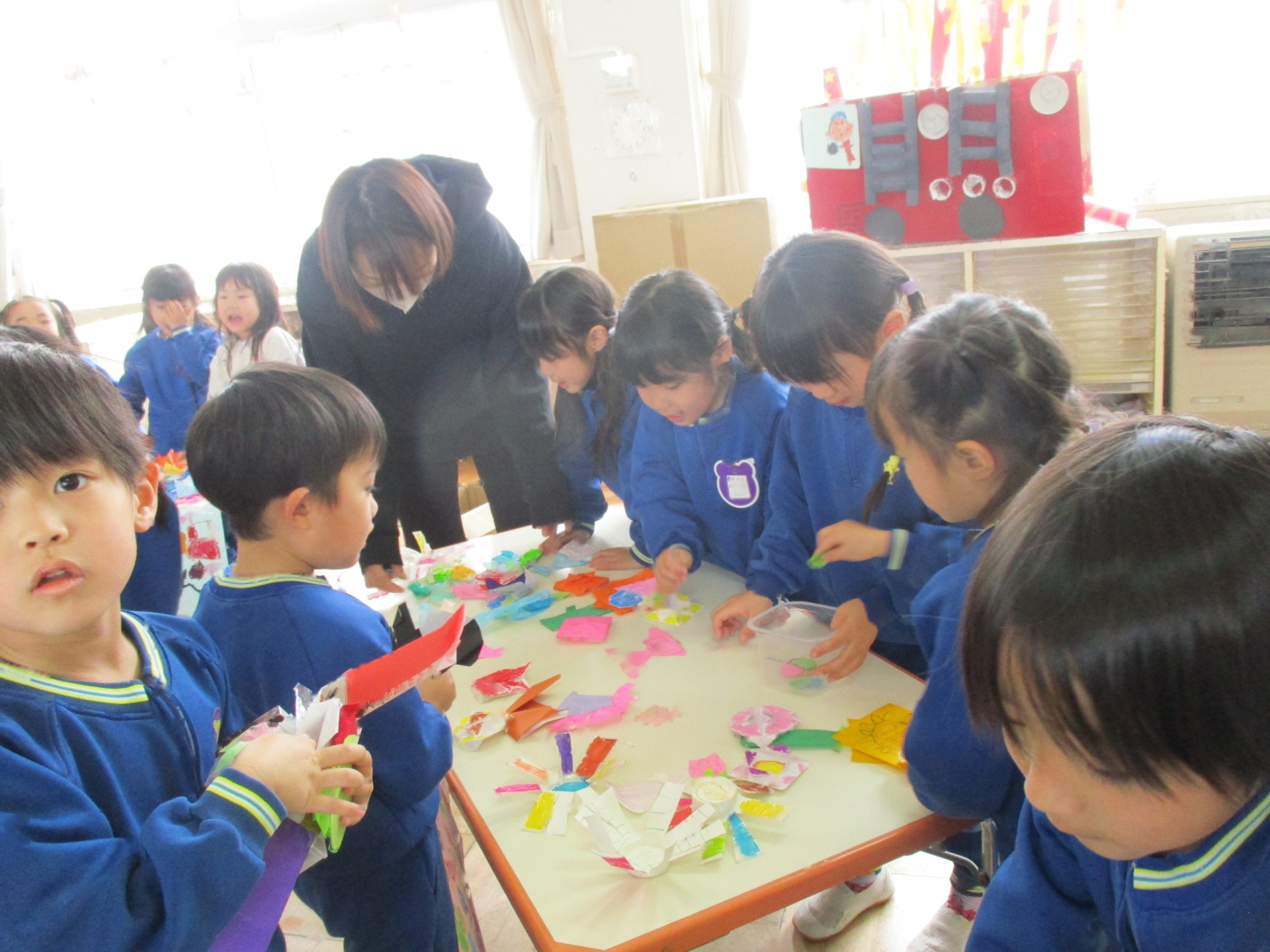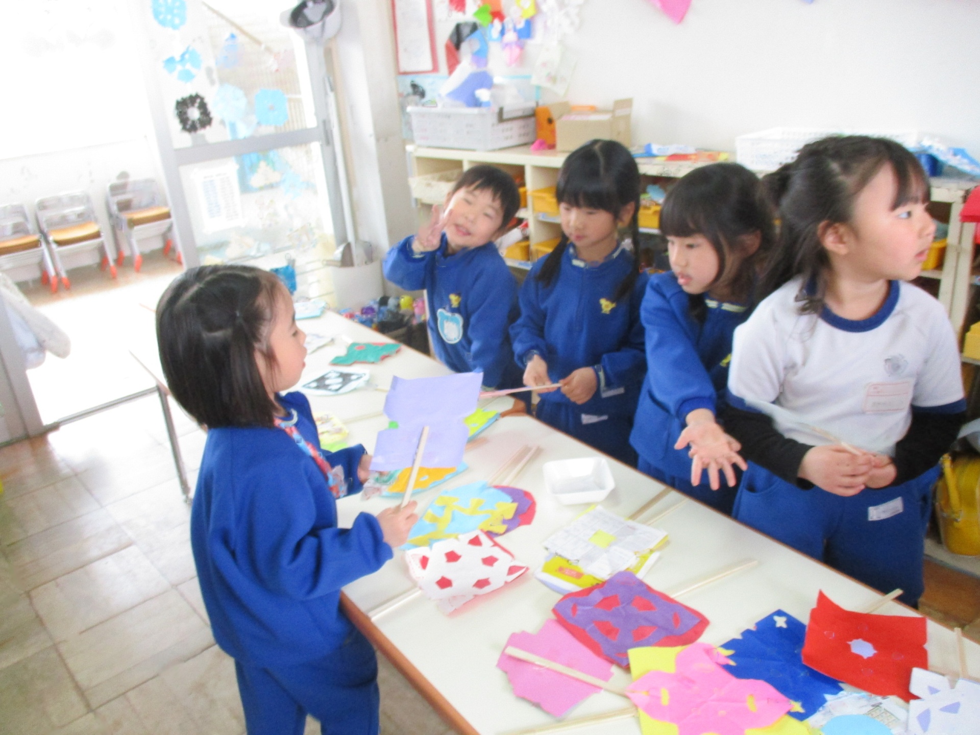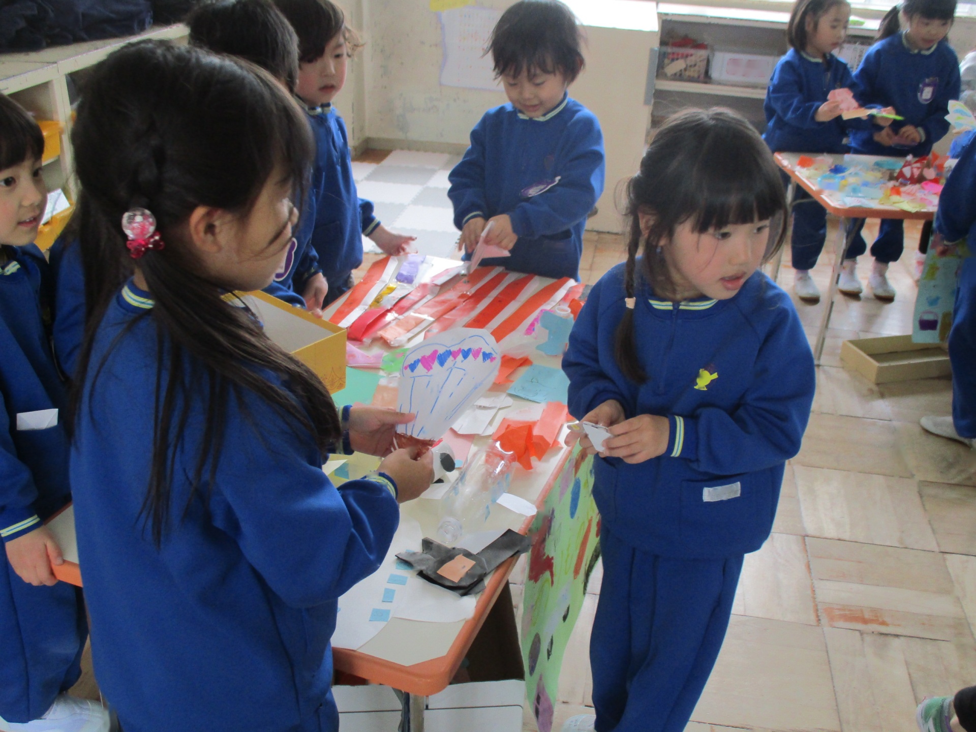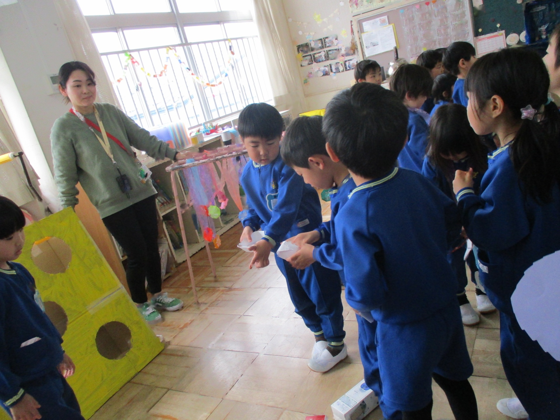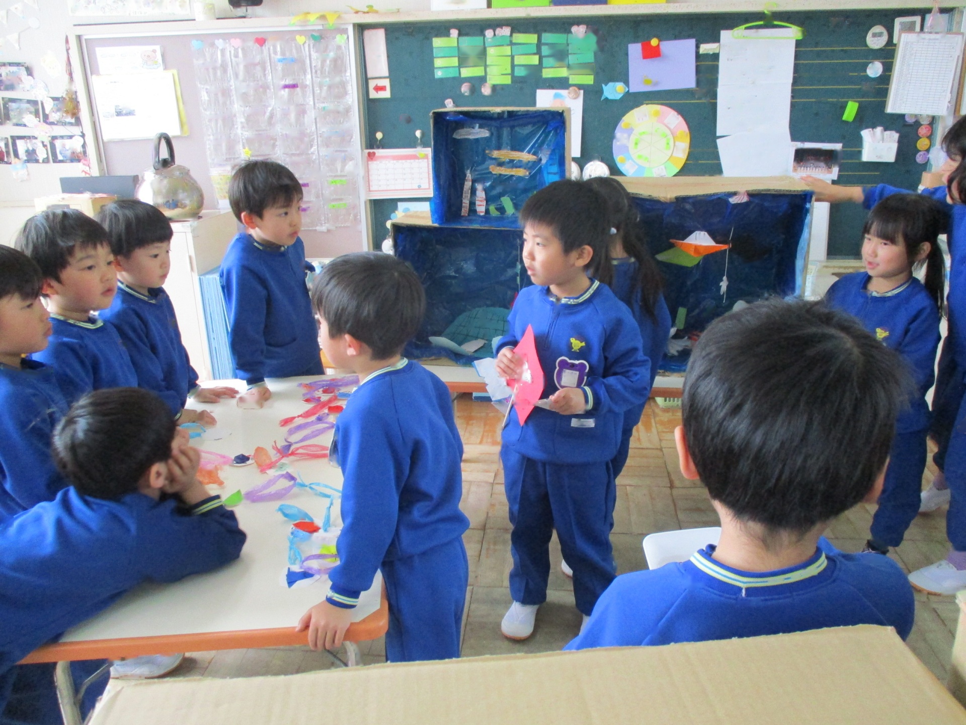 年中組でおみせやさんごっこをしました!すみれ組では「のりものやさん・れすとらん・さかなやさん・はなやさん・ふくやさん」ゆり組では「すいぞくかん・あくせさりーやさん・ゆきのけっしょうやさん・げーむこーなー」がオープンしました!一年間いろいろな制作で身についた力を発揮して友達と一緒に作ってきました!お客さんは来てくれるかな?「いらっしゃいませ!!」
