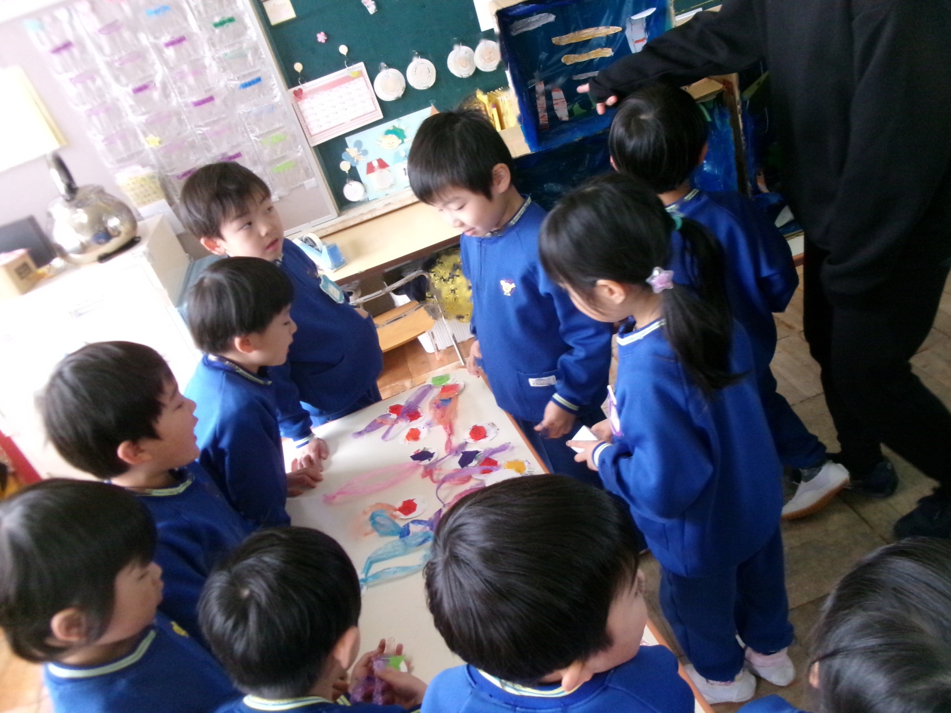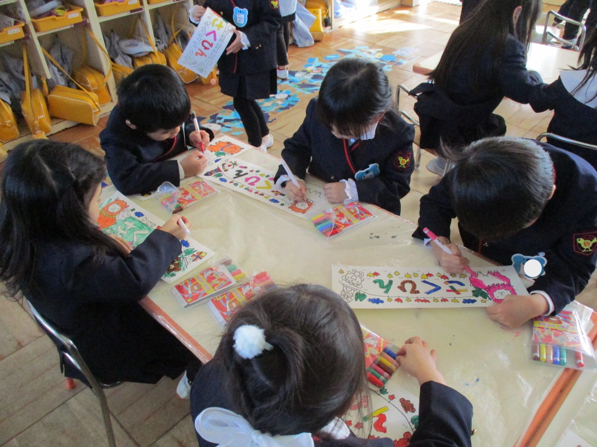 ABCの歌を歌った後、手や身体でアルファベットを作りました。また、アルファベット表を見て、先生が隠したものをすぐに当てていてびっくり!一年間を通して楽しく身についていると感じました⭐