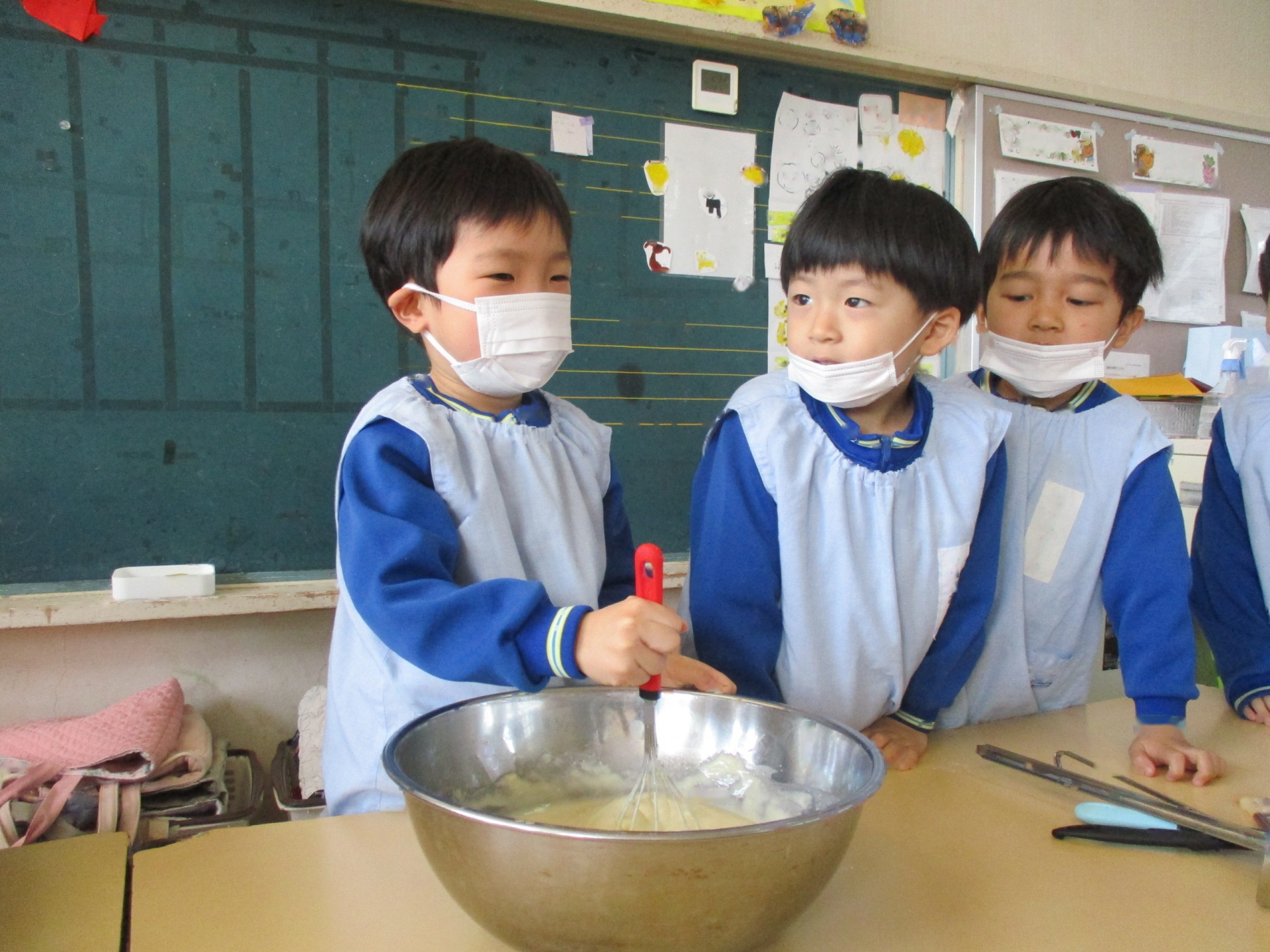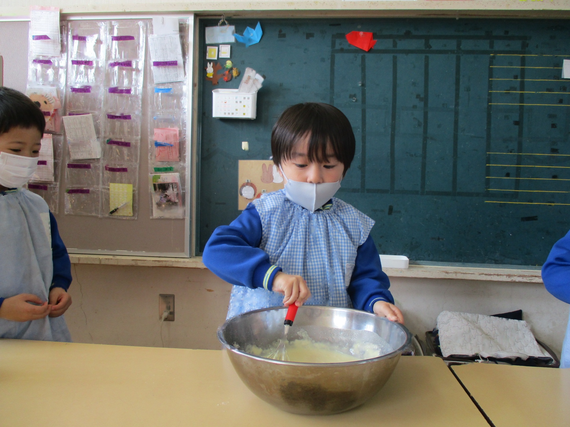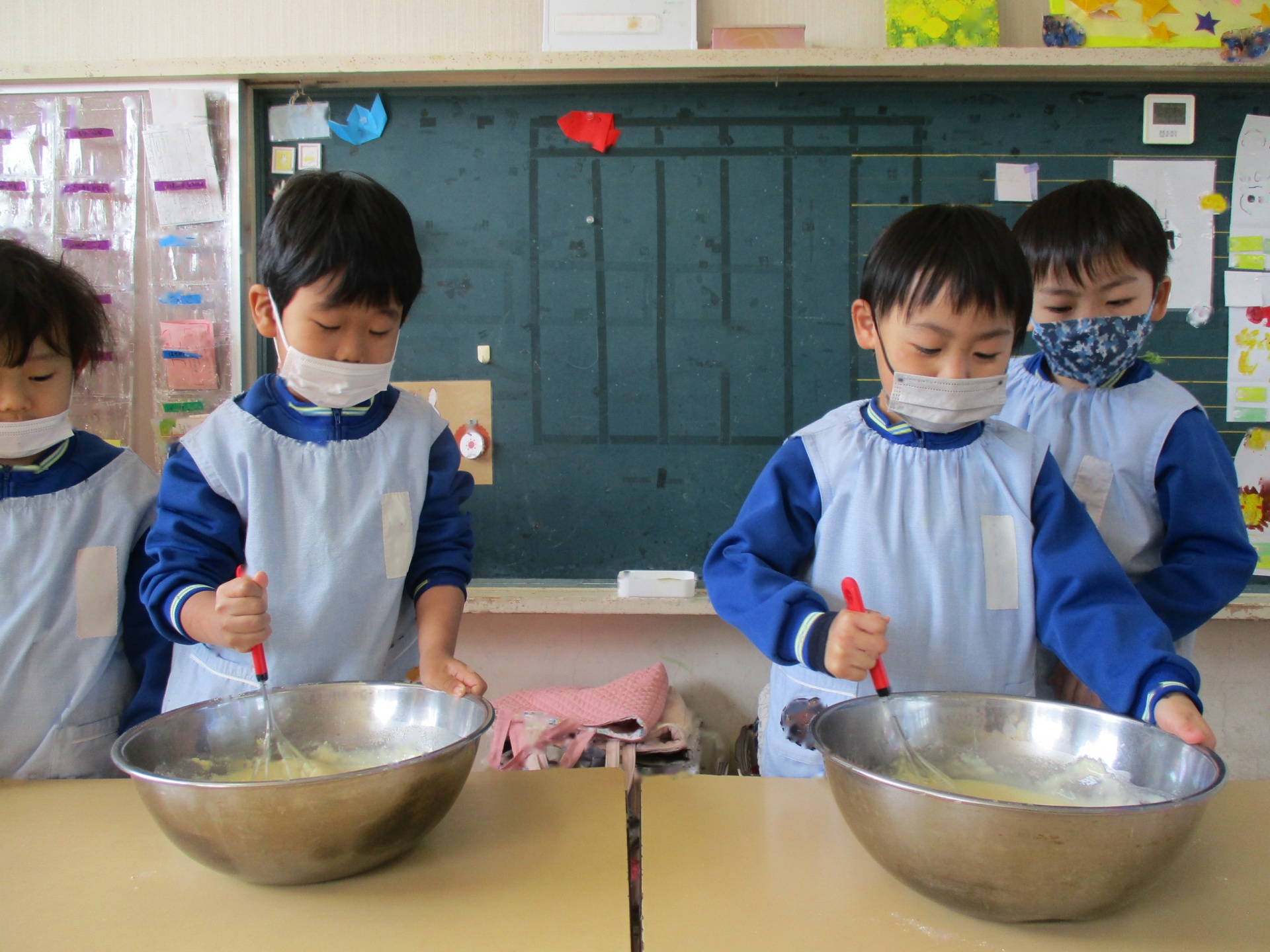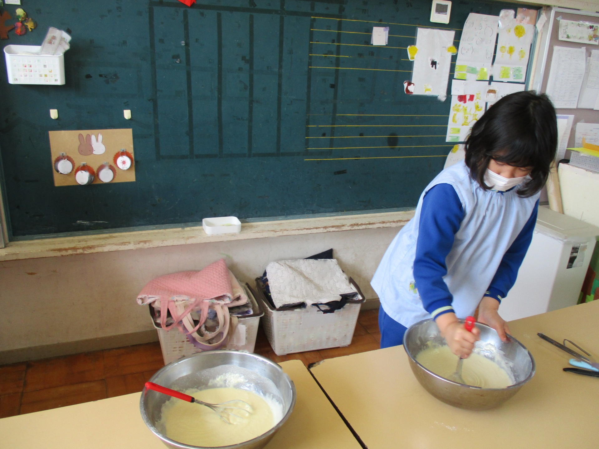 年中組最後のクッキングをしました!「最後のクッキング、何を食べたい?」と聞くと「ピザ!ぎょうざ!ケーキ!くだもの!」といろんな案が出てきました!今日はその中からホットケーキを選び、みんなで作りました!
