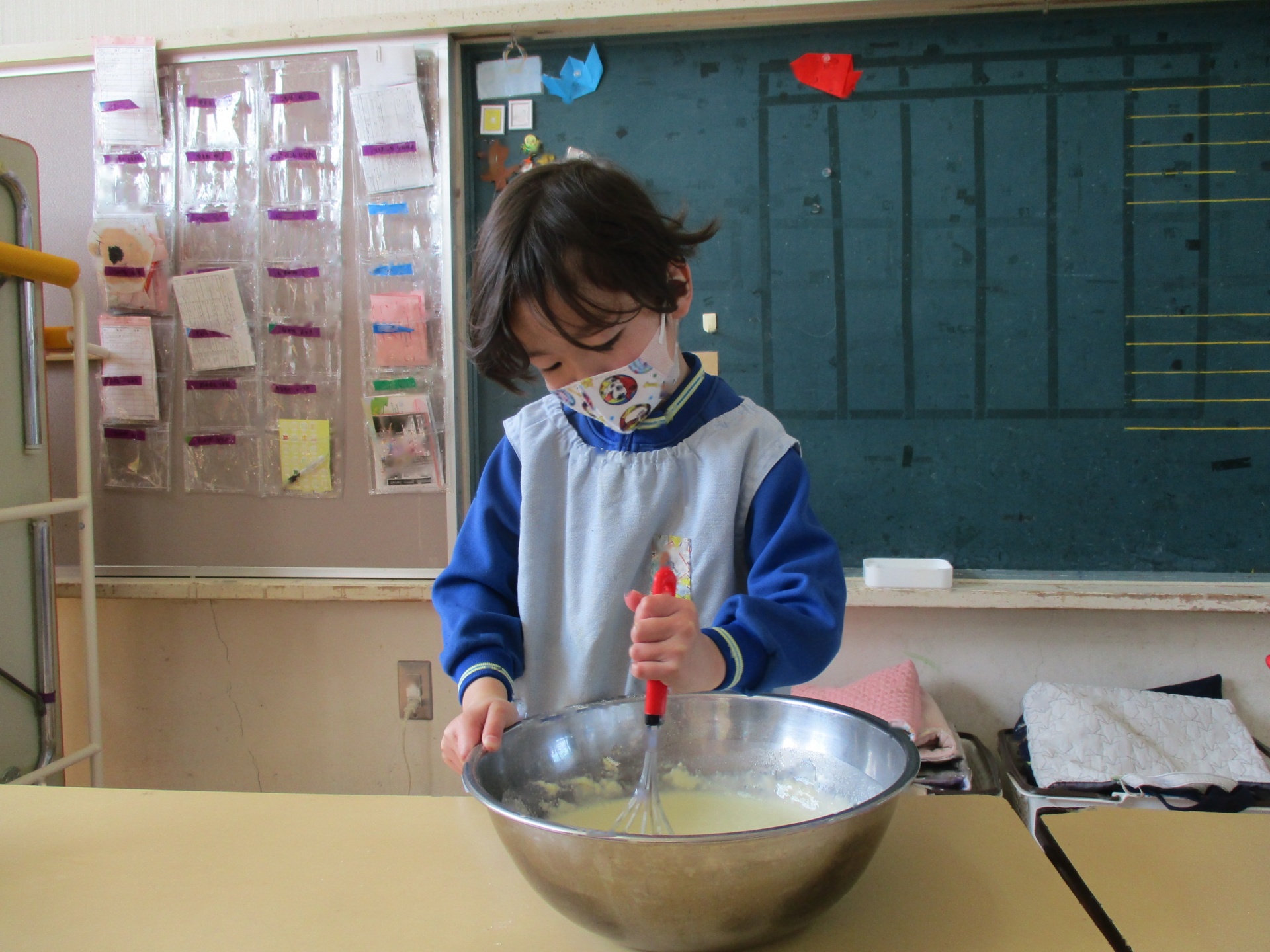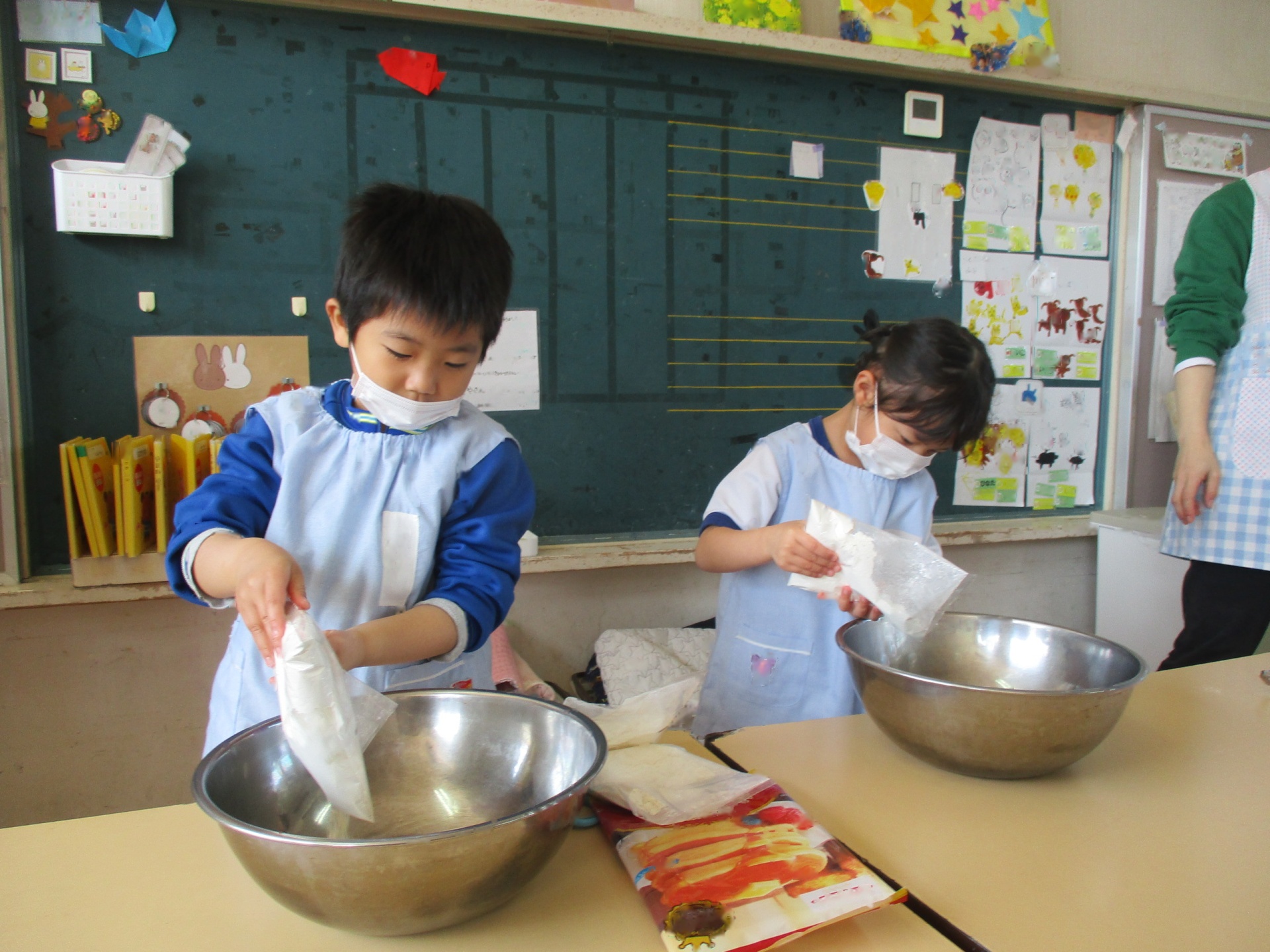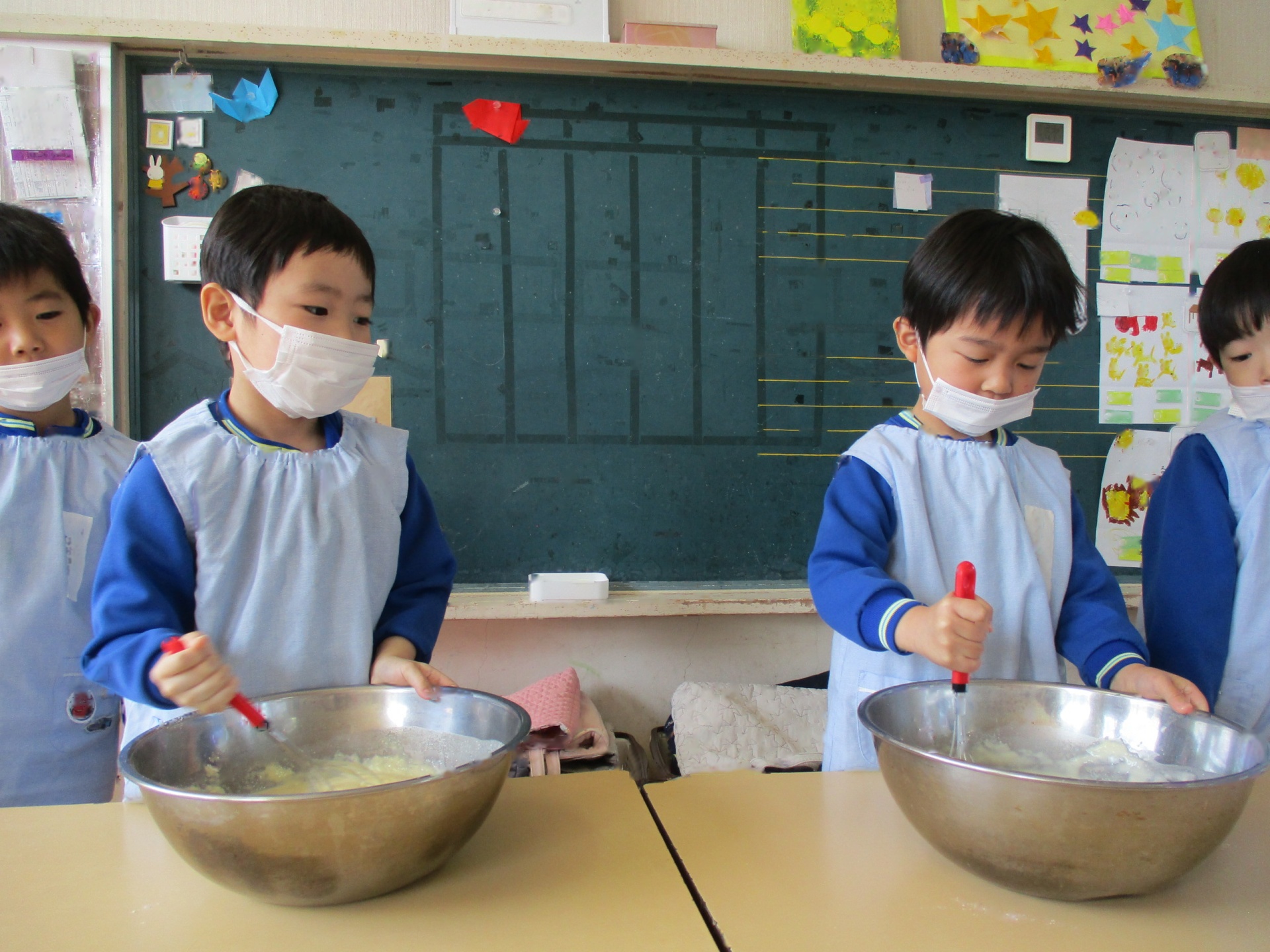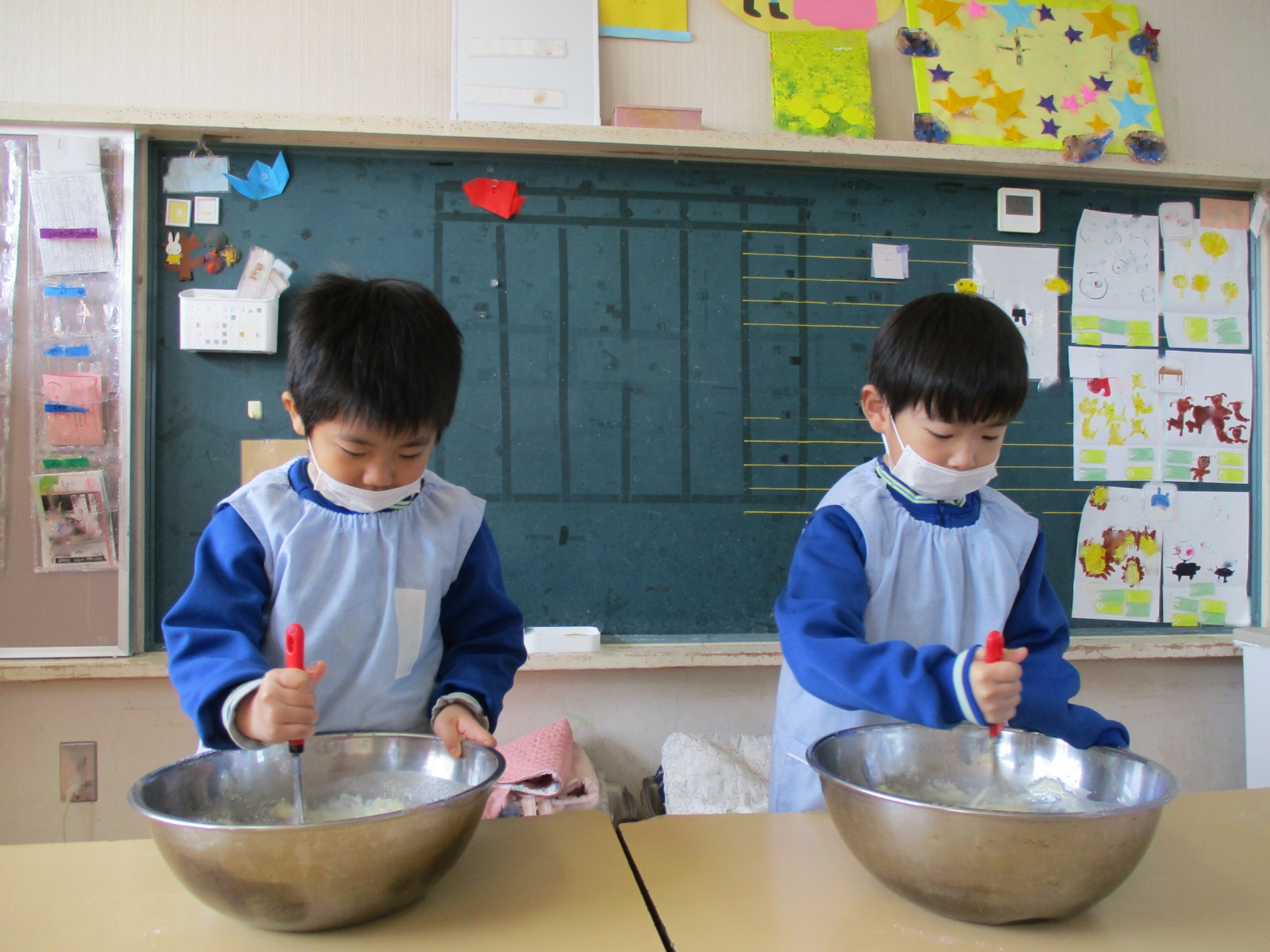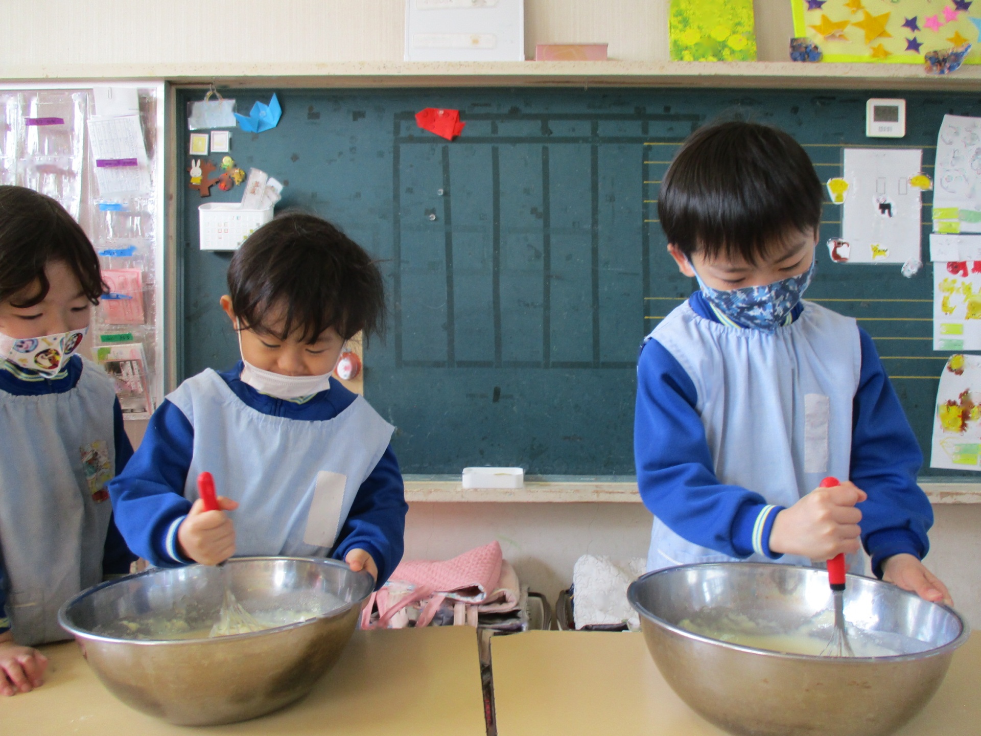 年中組最後のクッキングをしました!「最後のクッキング、何を食べたい?」と聞くと「ピザ!ぎょうざ!ケーキ!くだもの!」といろんな案が出てきました!今日はその中からホットケーキを選び、みんなで作りました!