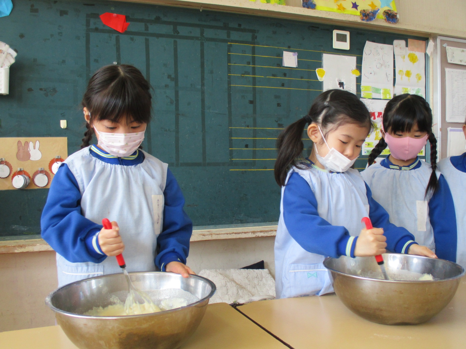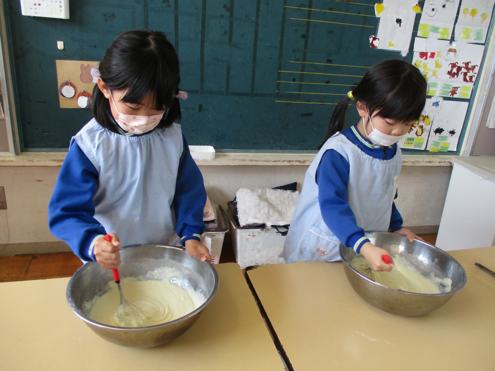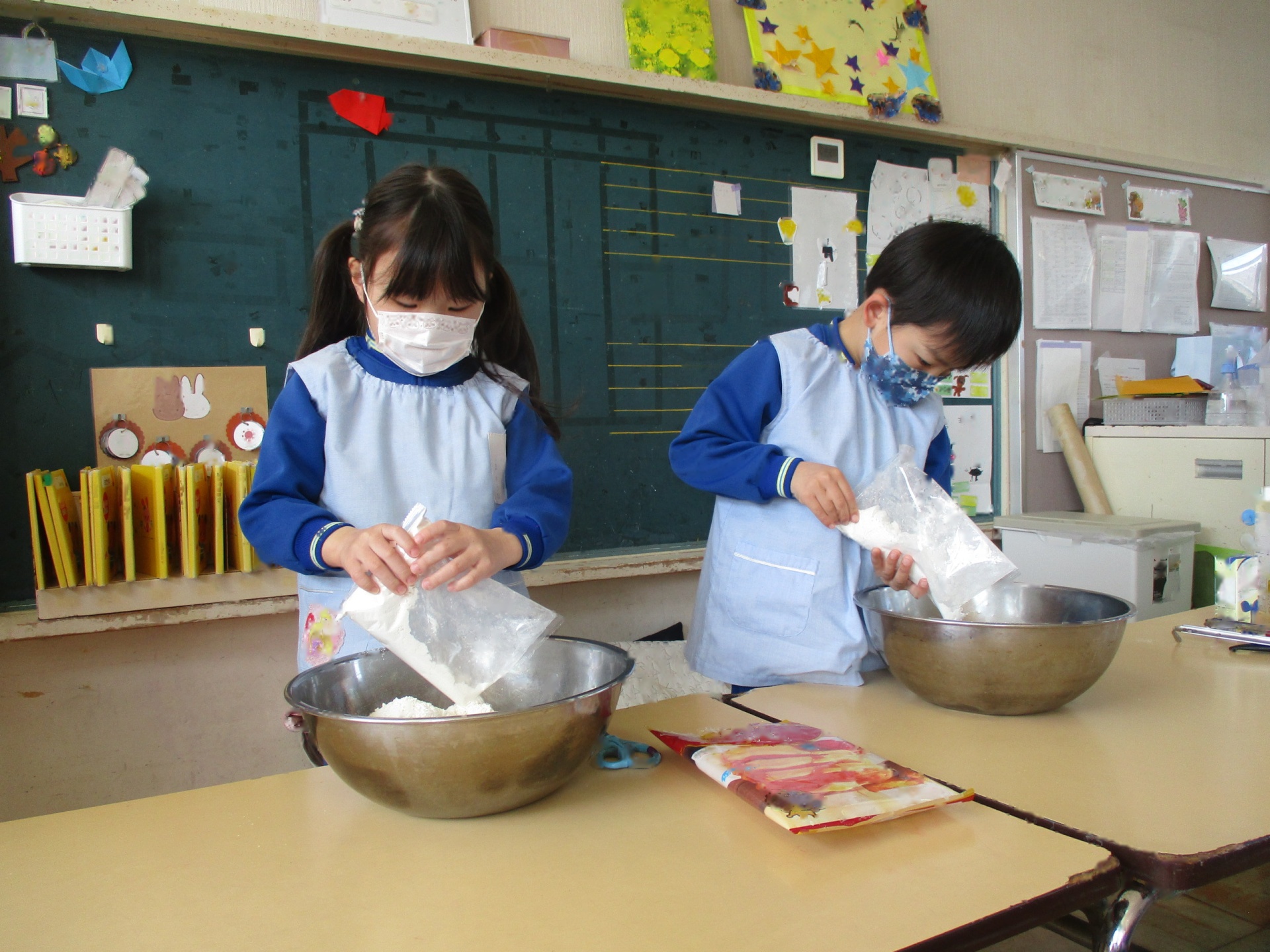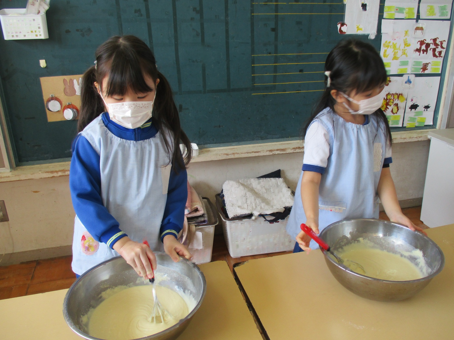 年中組最後のクッキングをしました!「最後のクッキング、何を食べたい?」と聞くと「ピザ!ぎょうざ!ケーキ!くだもの!」といろんな案が出てきました!今日はその中からホットケーキを選び、みんなで作りました!