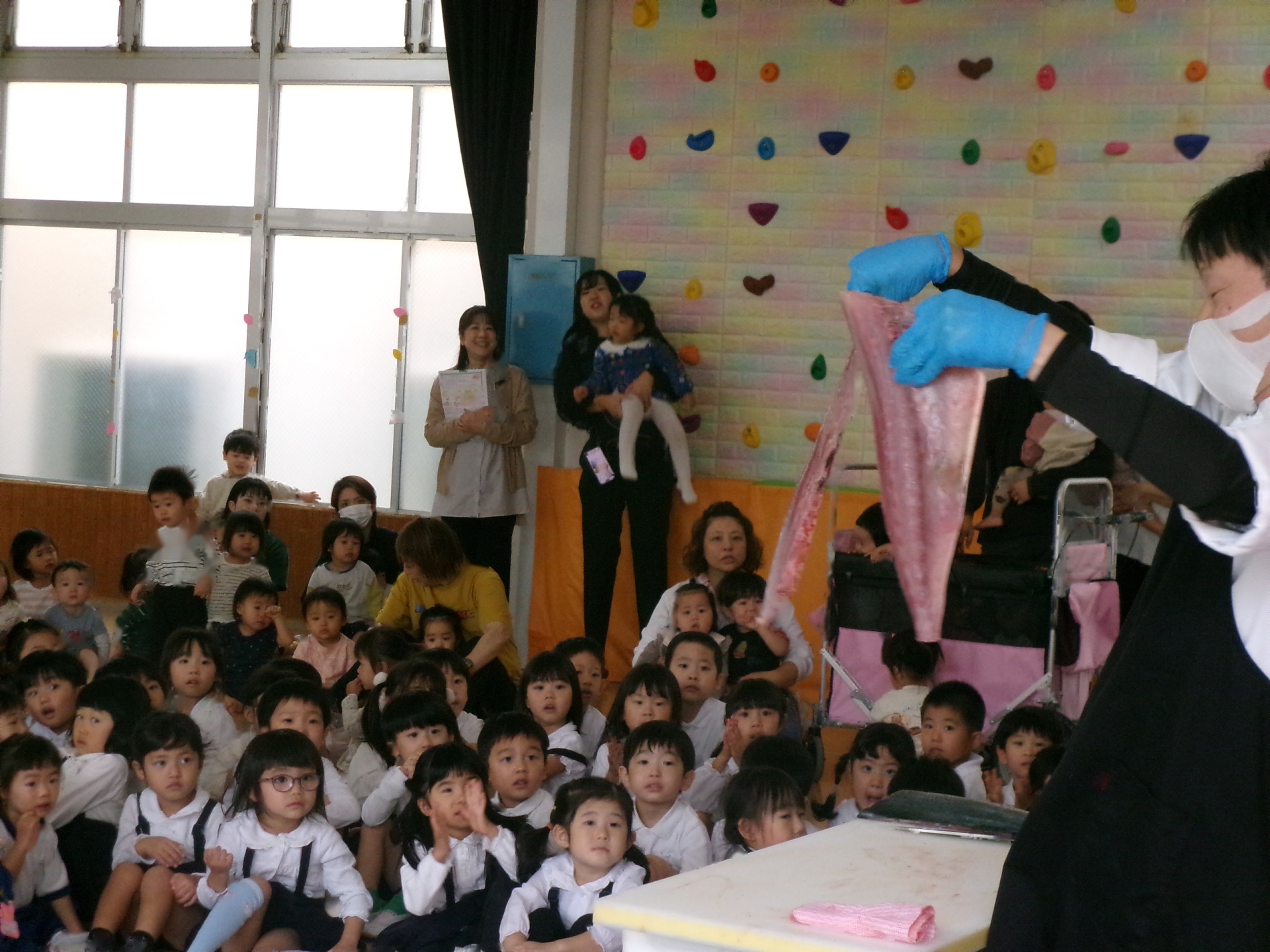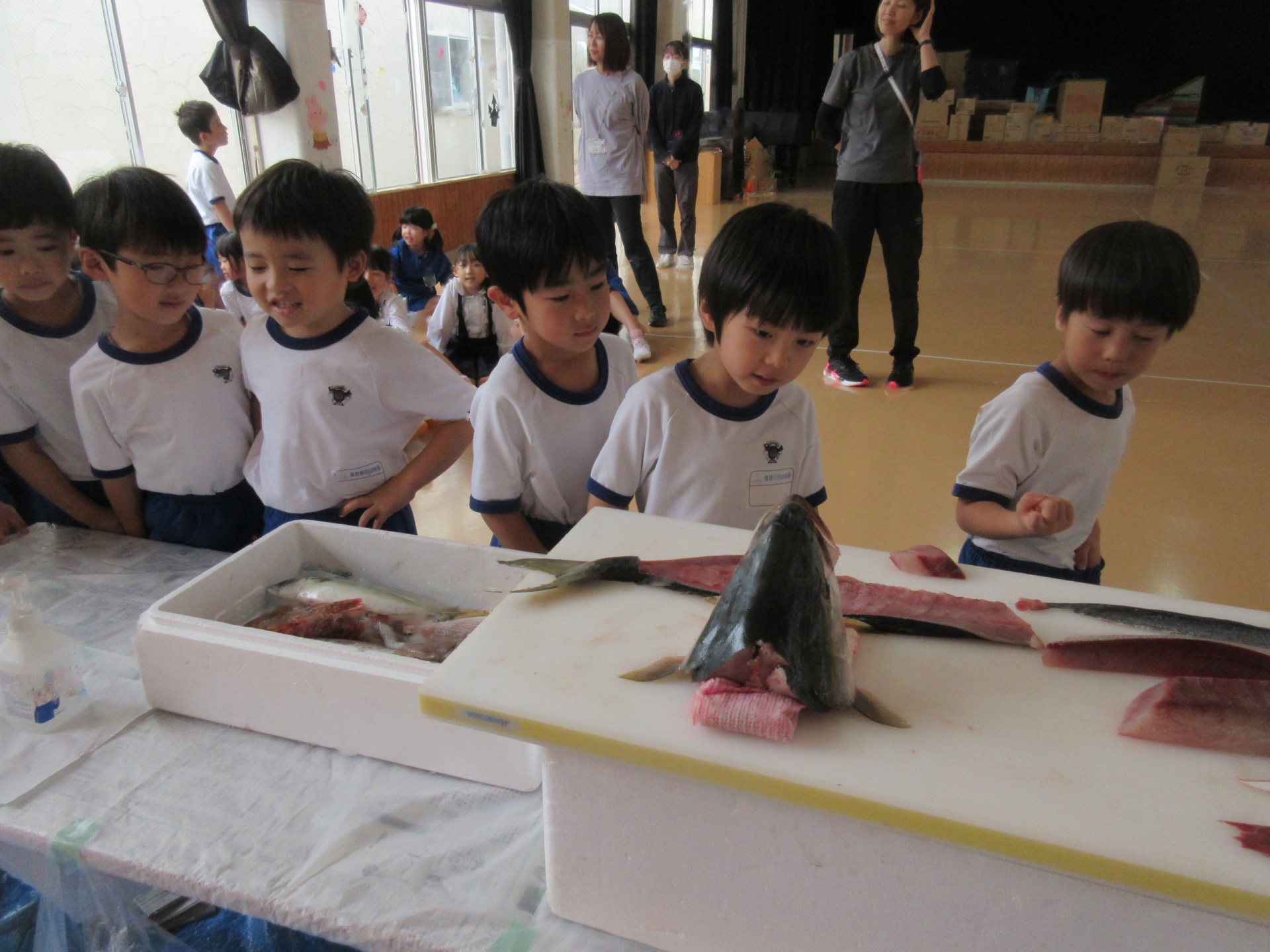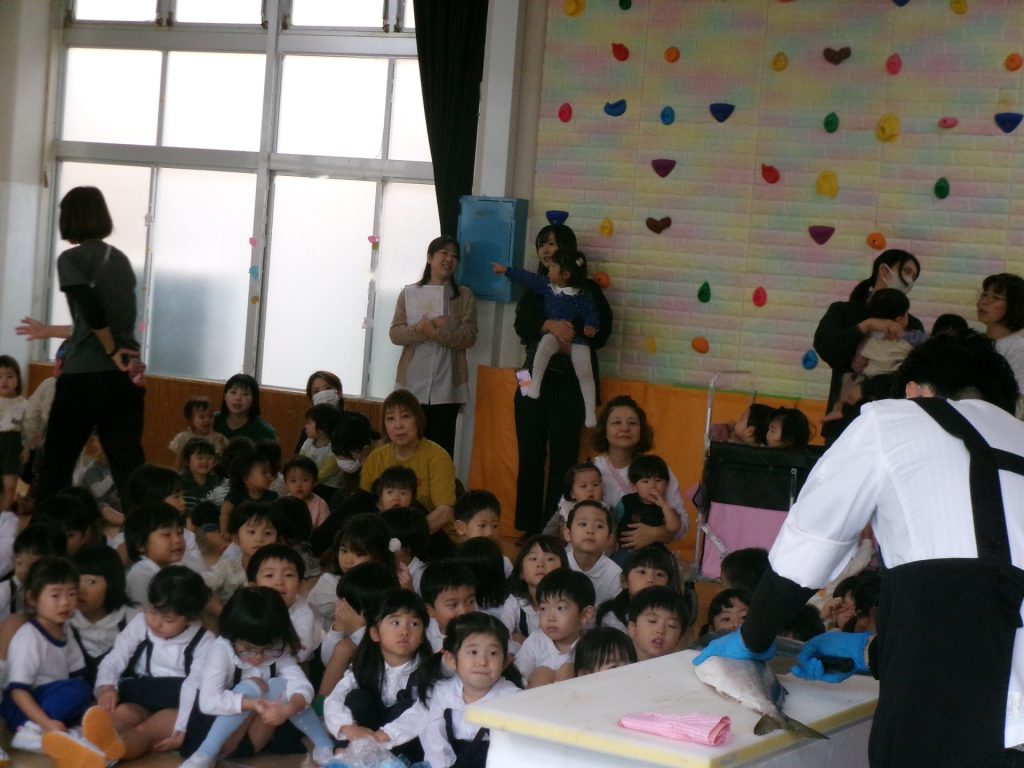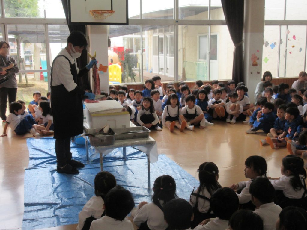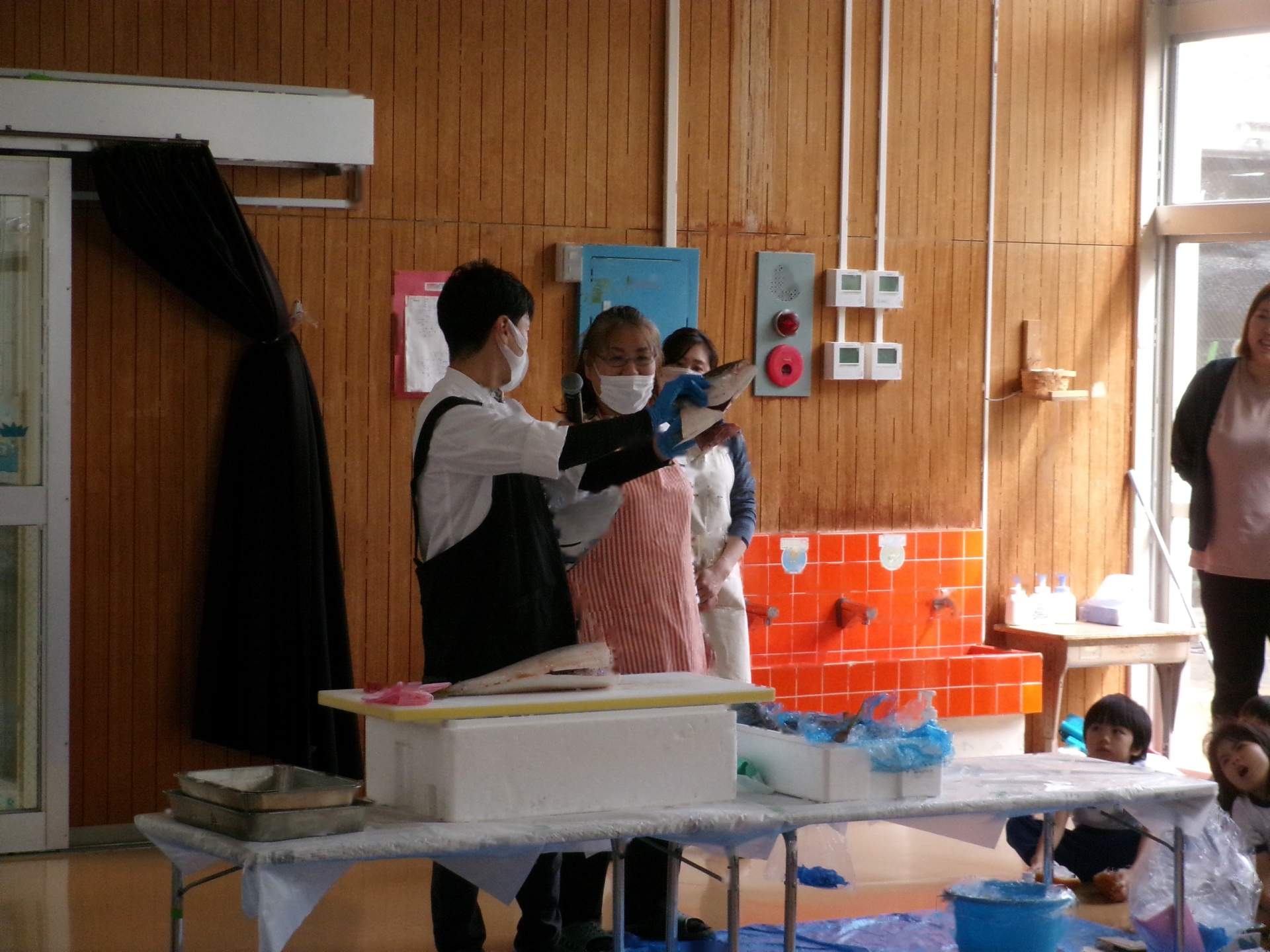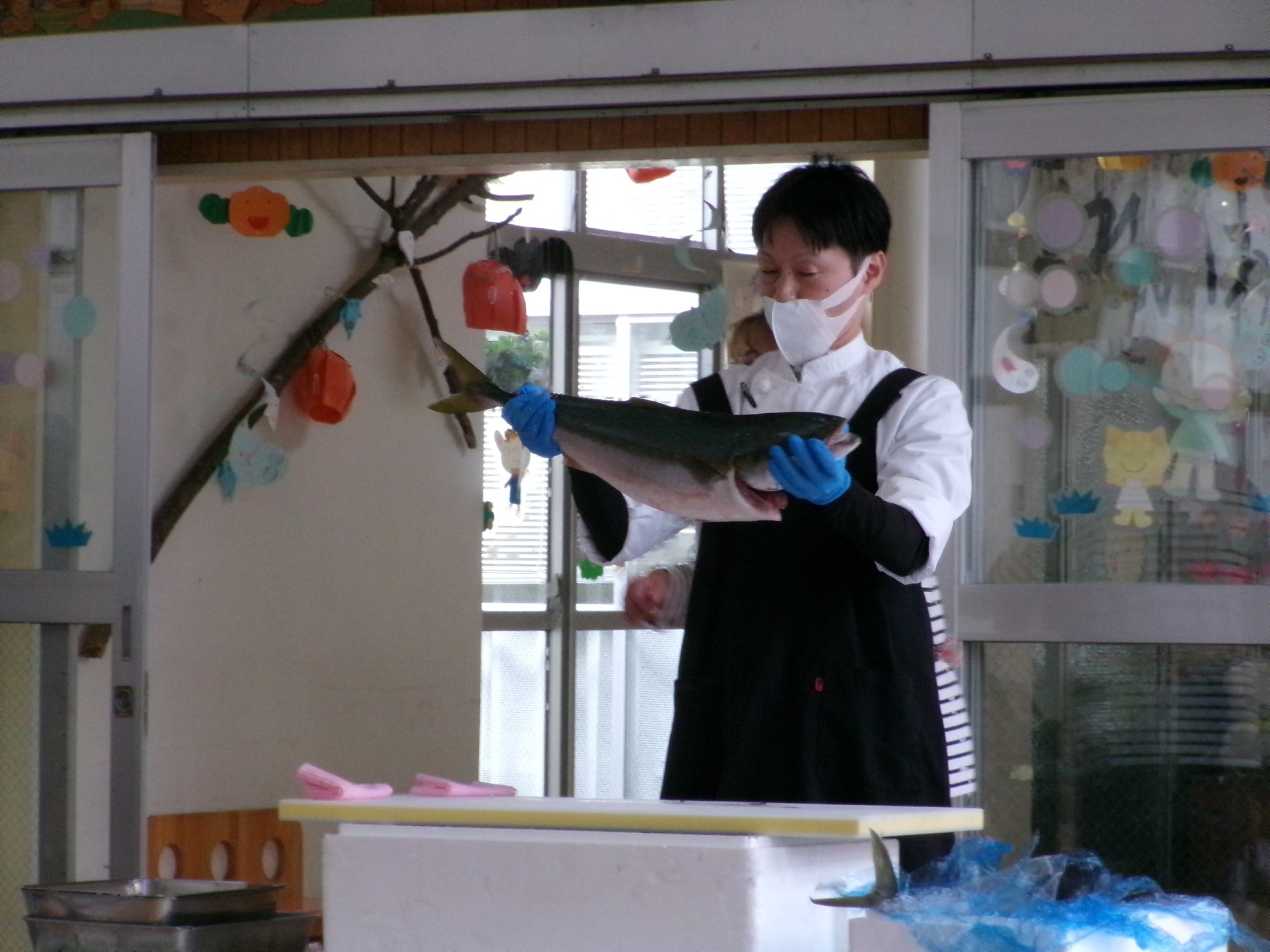 2025.11.21 ☆魚の解体ショー☆ 先月、食育の一環として魚の解体ショーの見学をしました。 初めて見る子どもも多く、調理師さんの華麗な手さばきに釘付けの子ども達でした。 解体ショーを通して、≪命を頂いていること≫を感じてくれたことと思います。