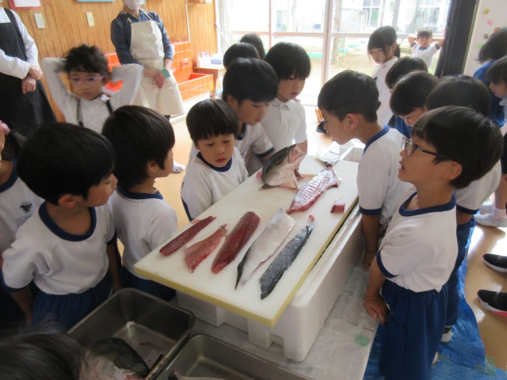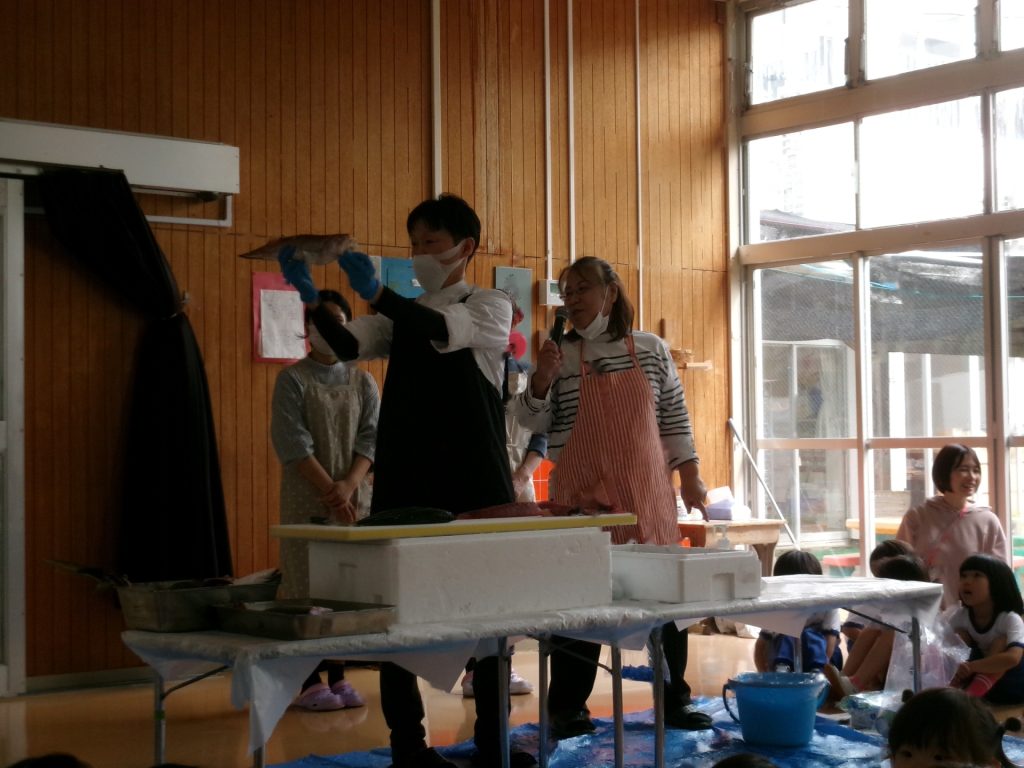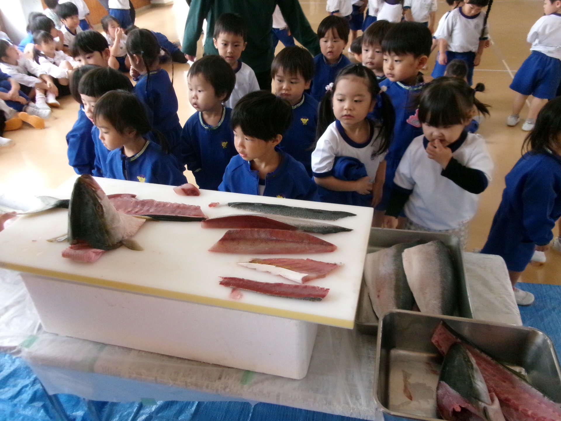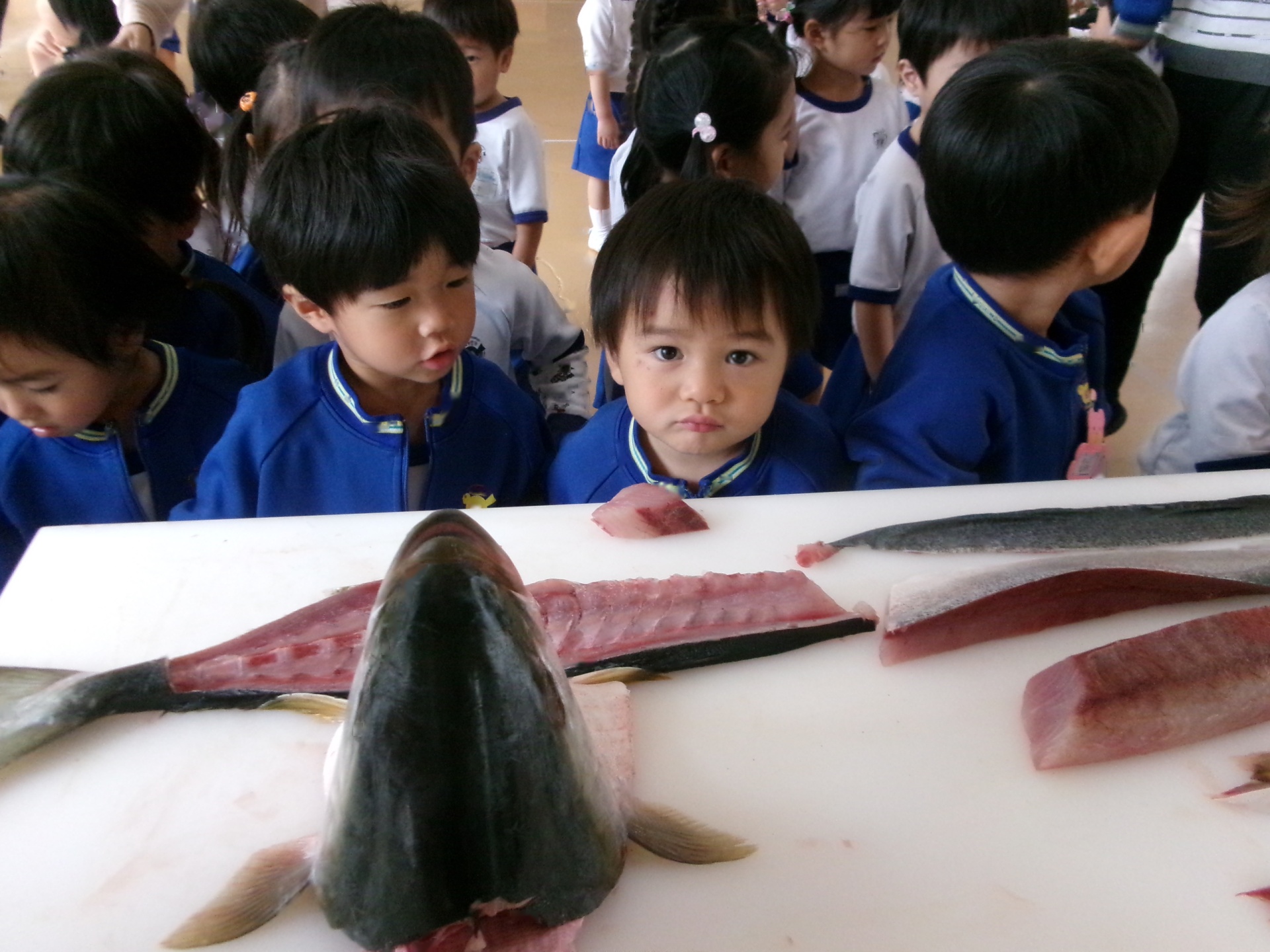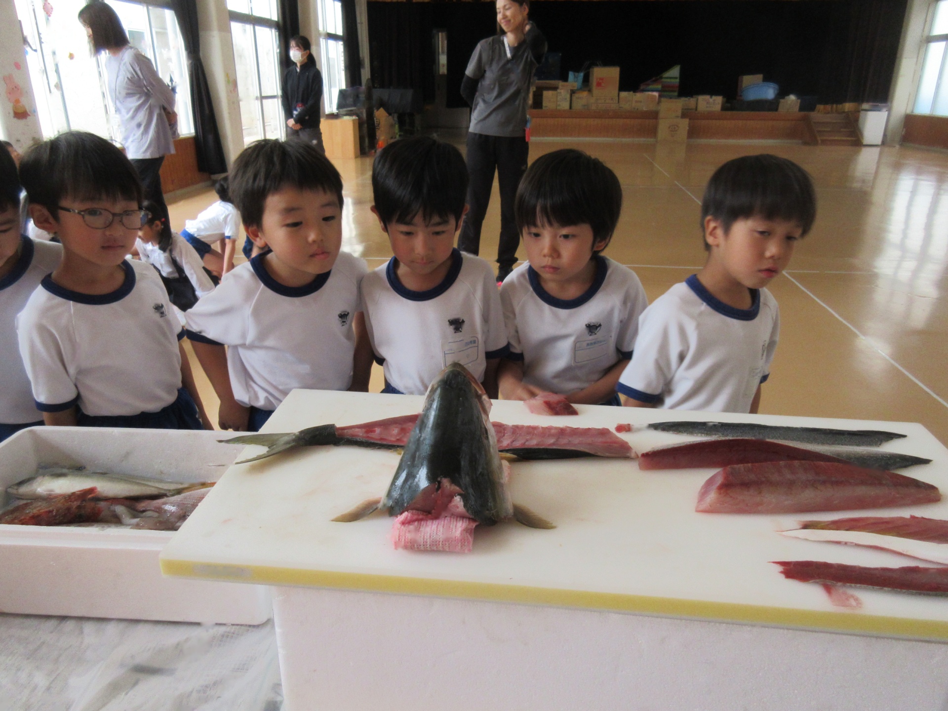 2025.11.21 ☆魚の解体ショー☆ 先月、食育の一環として魚の解体ショーの見学をしました。 初めて見る子どもも多く、調理師さんの華麗な手さばきに釘付けの子ども達でした。 解体ショーを通して、≪命を頂いていること≫を感じてくれたことと思います。