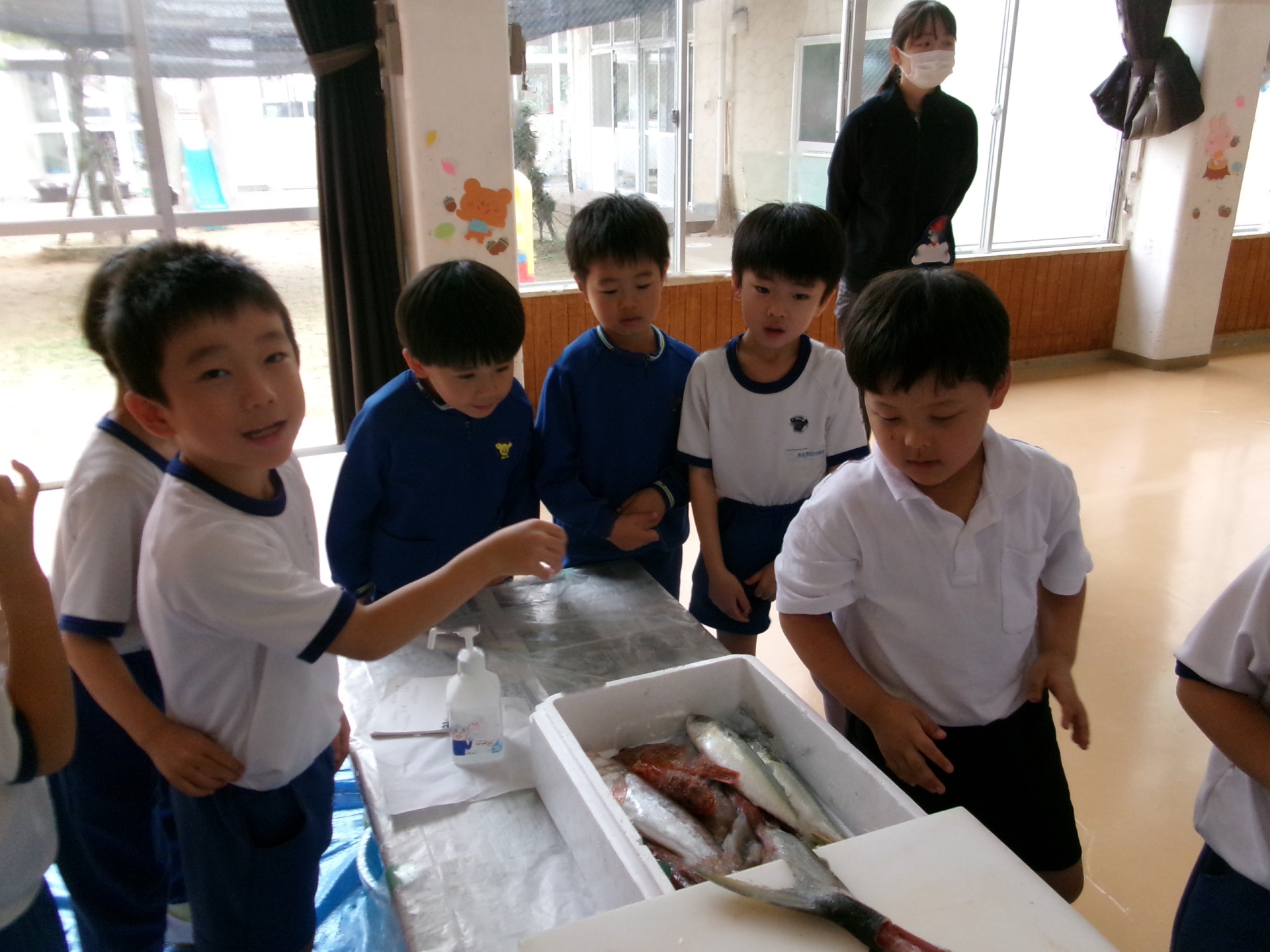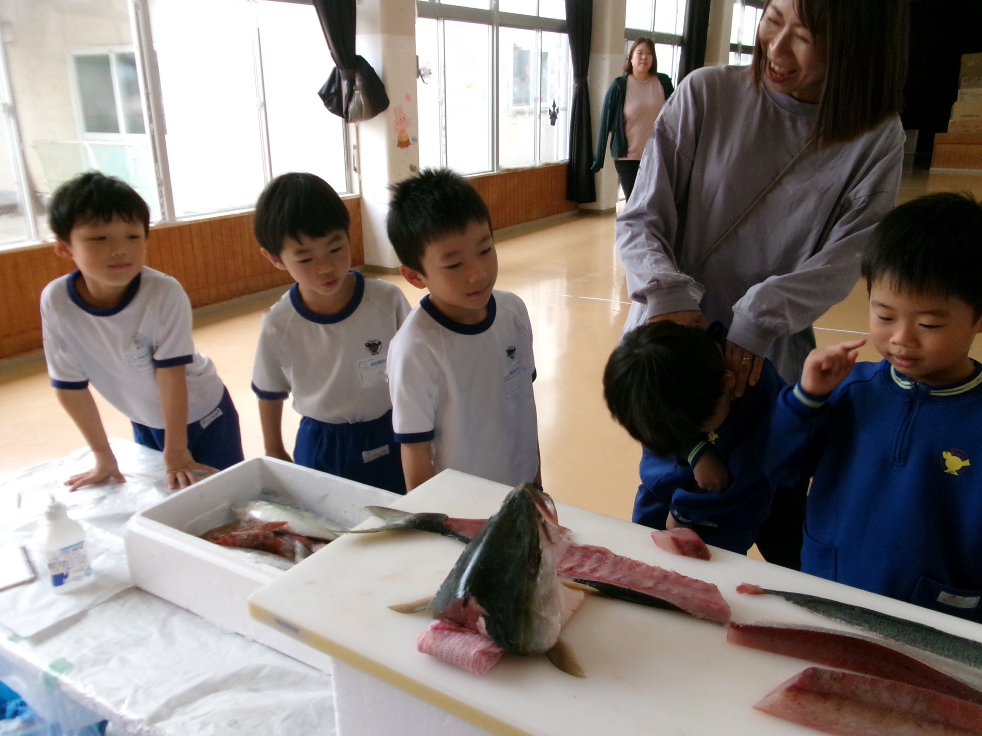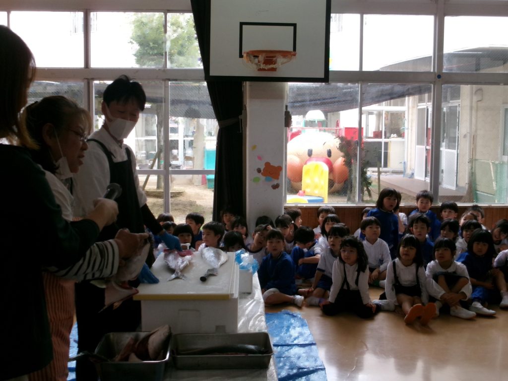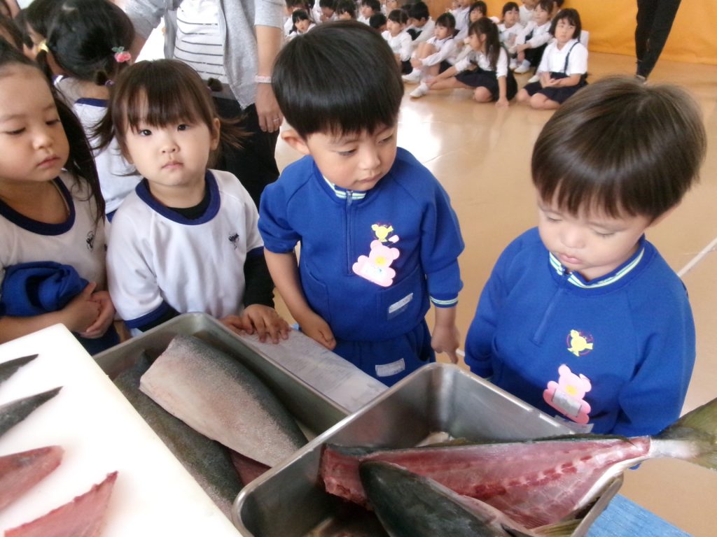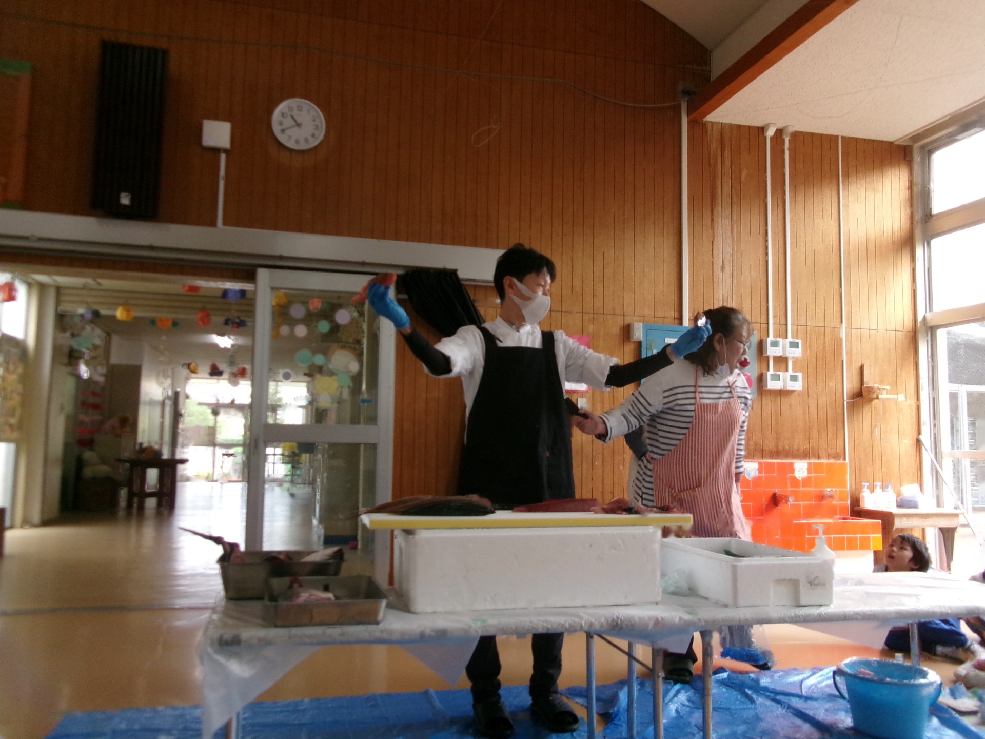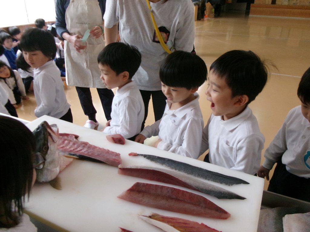 2025.11.21 ☆魚の解体ショー☆ 先月、食育の一環として魚の解体ショーの見学をしました。 初めて見る子どもも多く、調理師さんの華麗な手さばきに釘付けの子ども達でした。 解体ショーを通して、≪命を頂いていること≫を感じてくれたことと思います。