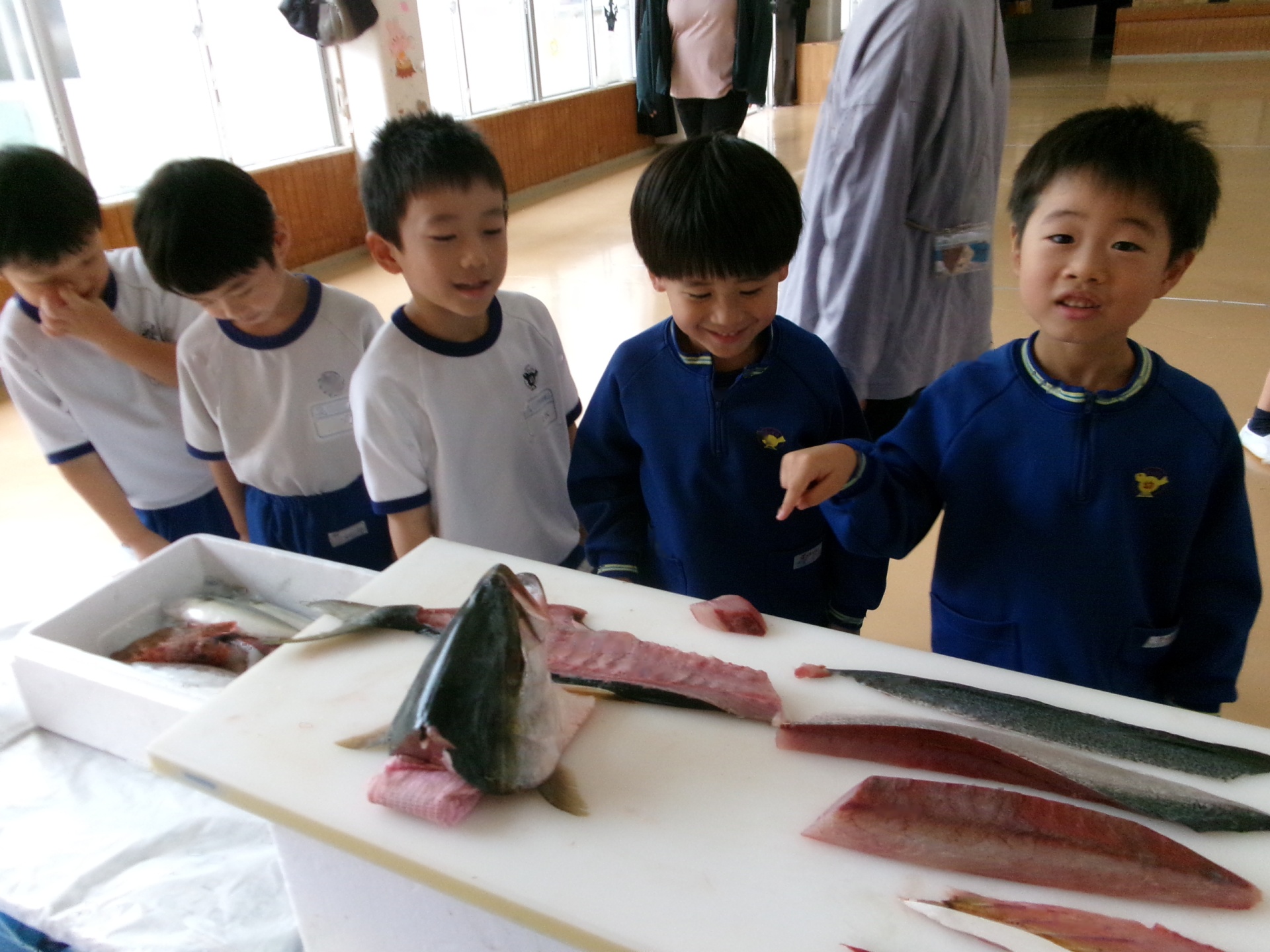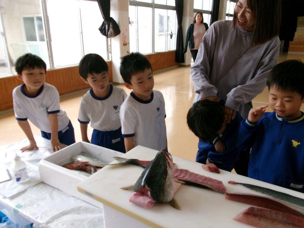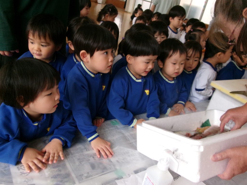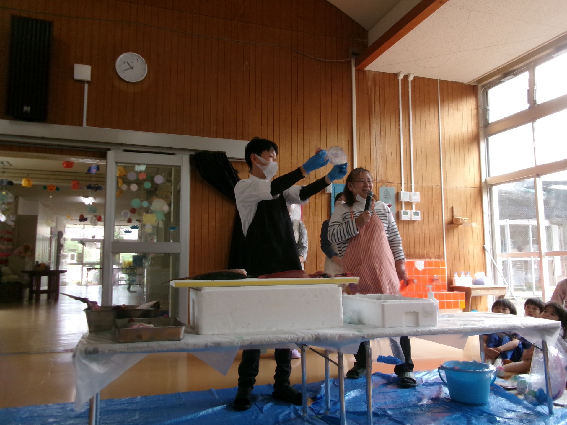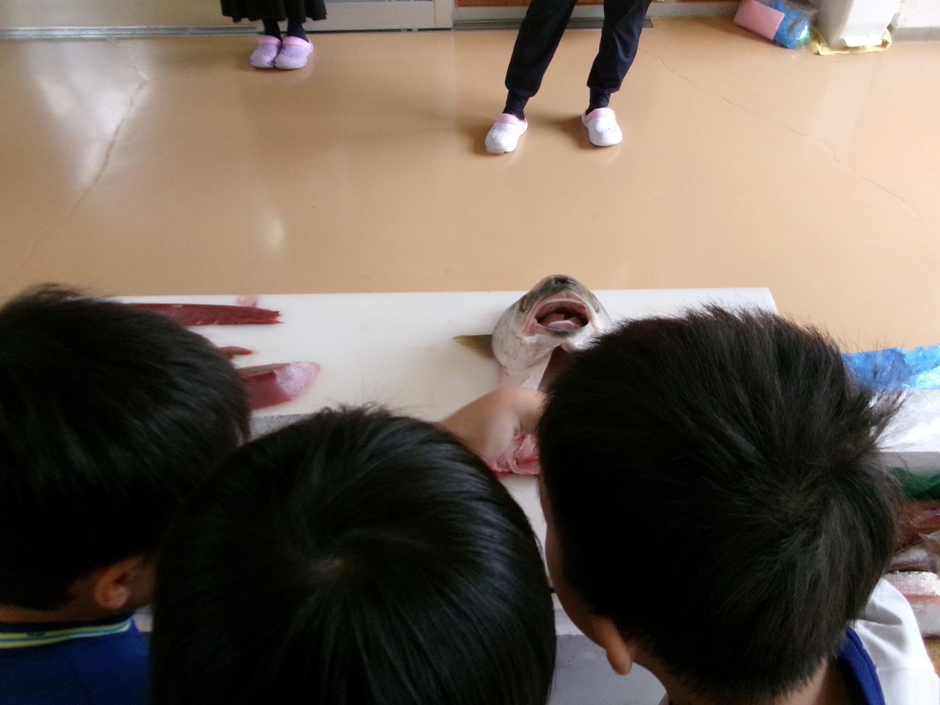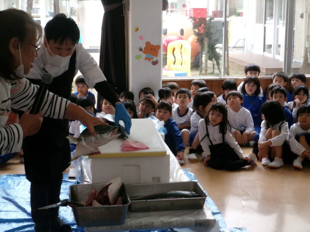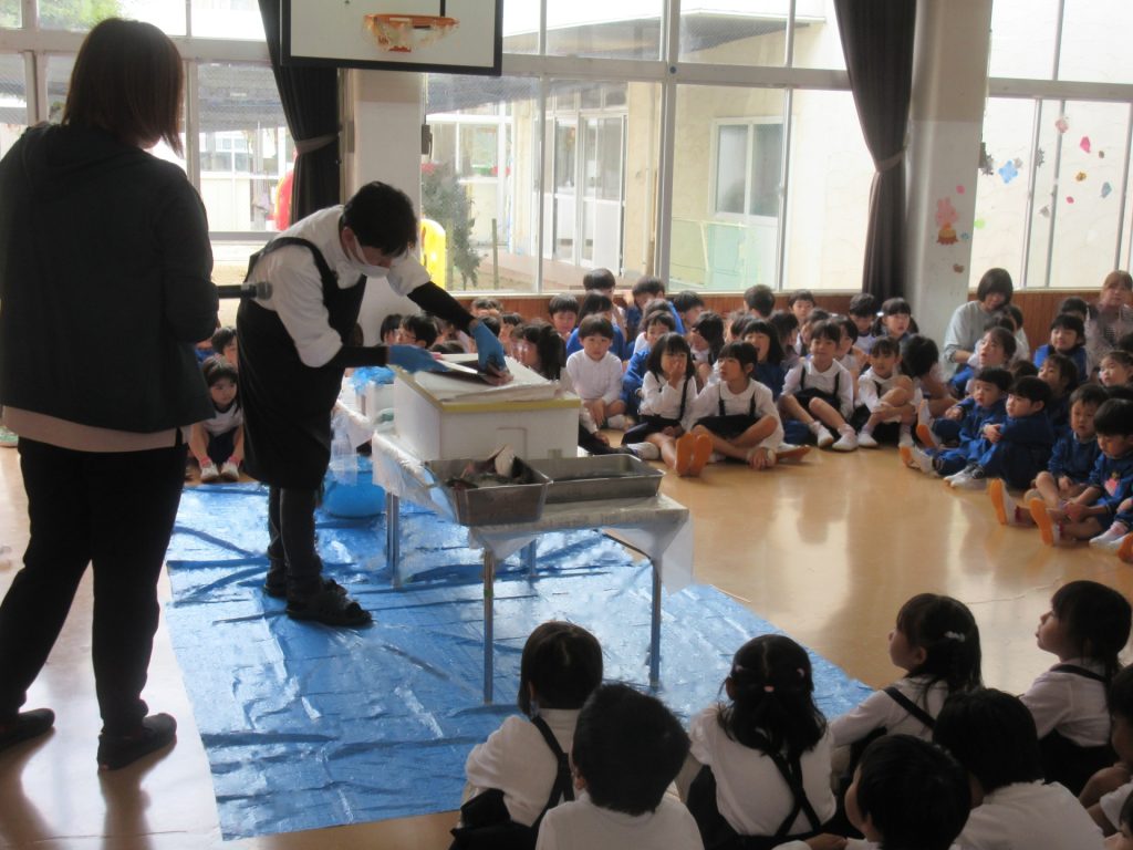 2025.11.21 ☆魚の解体ショー☆ 先月、食育の一環として魚の解体ショーの見学をしました。 初めて見る子どもも多く、調理師さんの華麗な手さばきに釘付けの子ども達でした。 解体ショーを通して、≪命を頂いていること≫を感じてくれたことと思います。