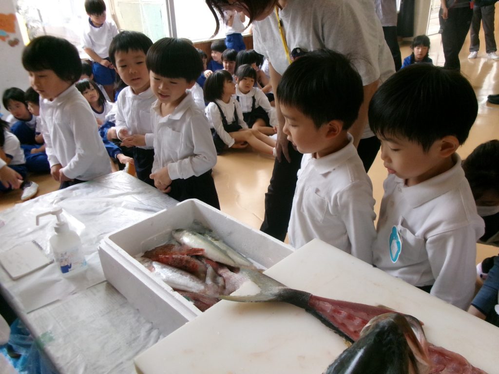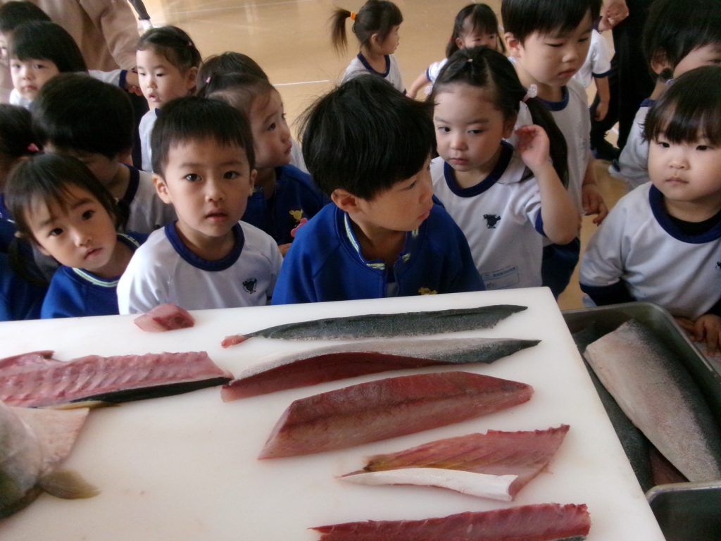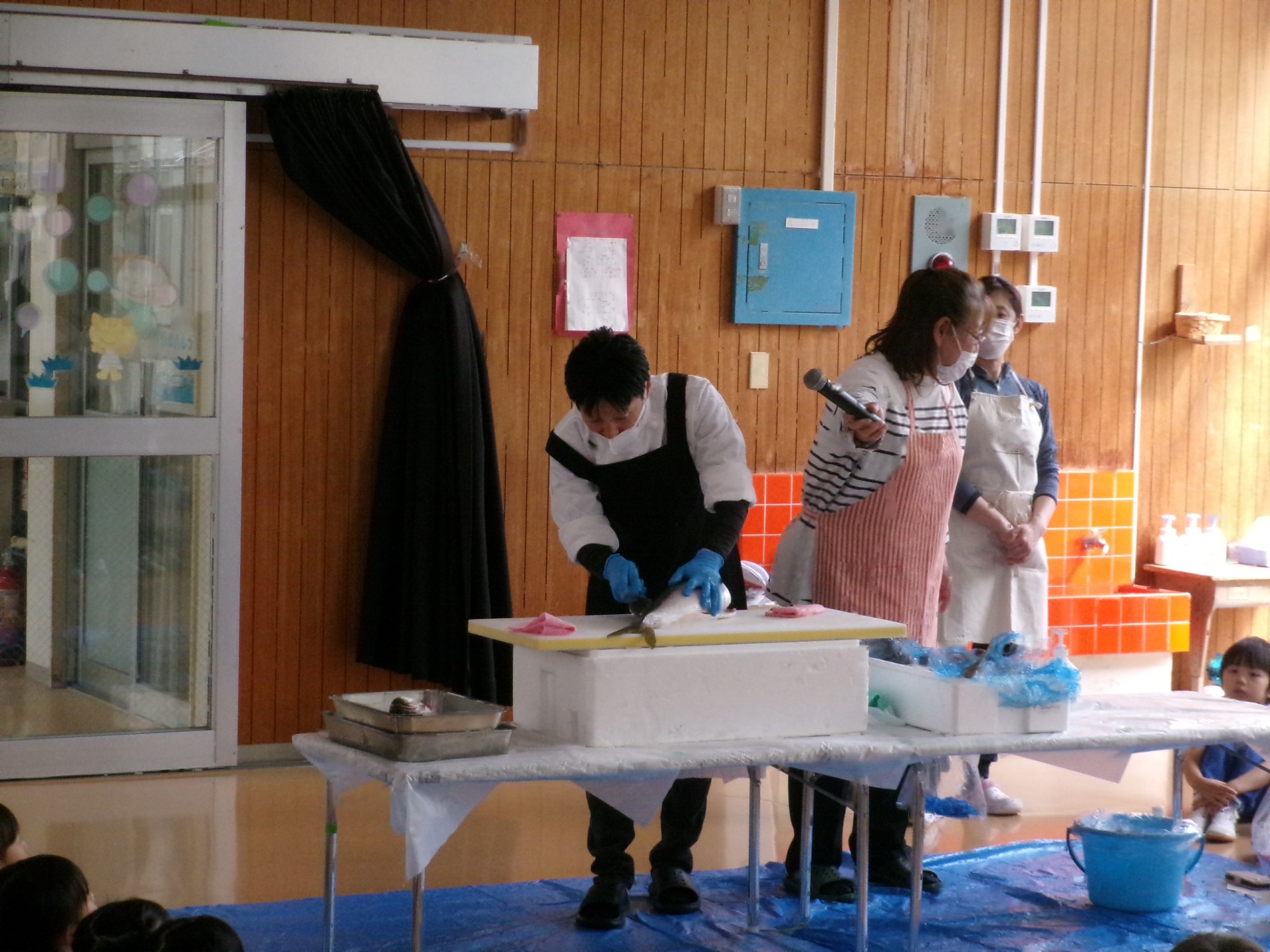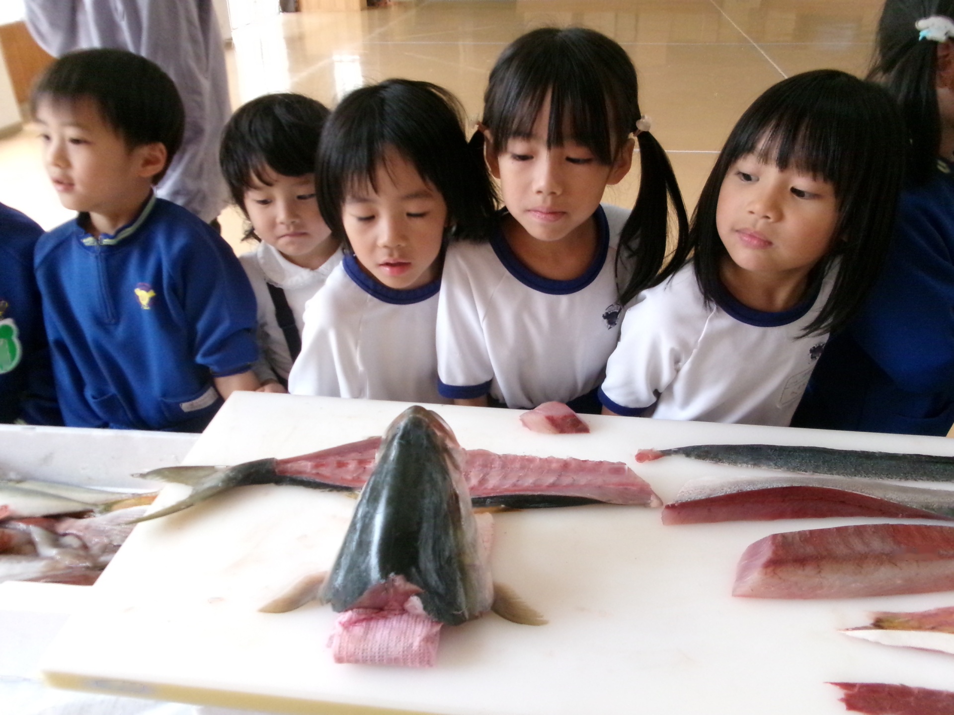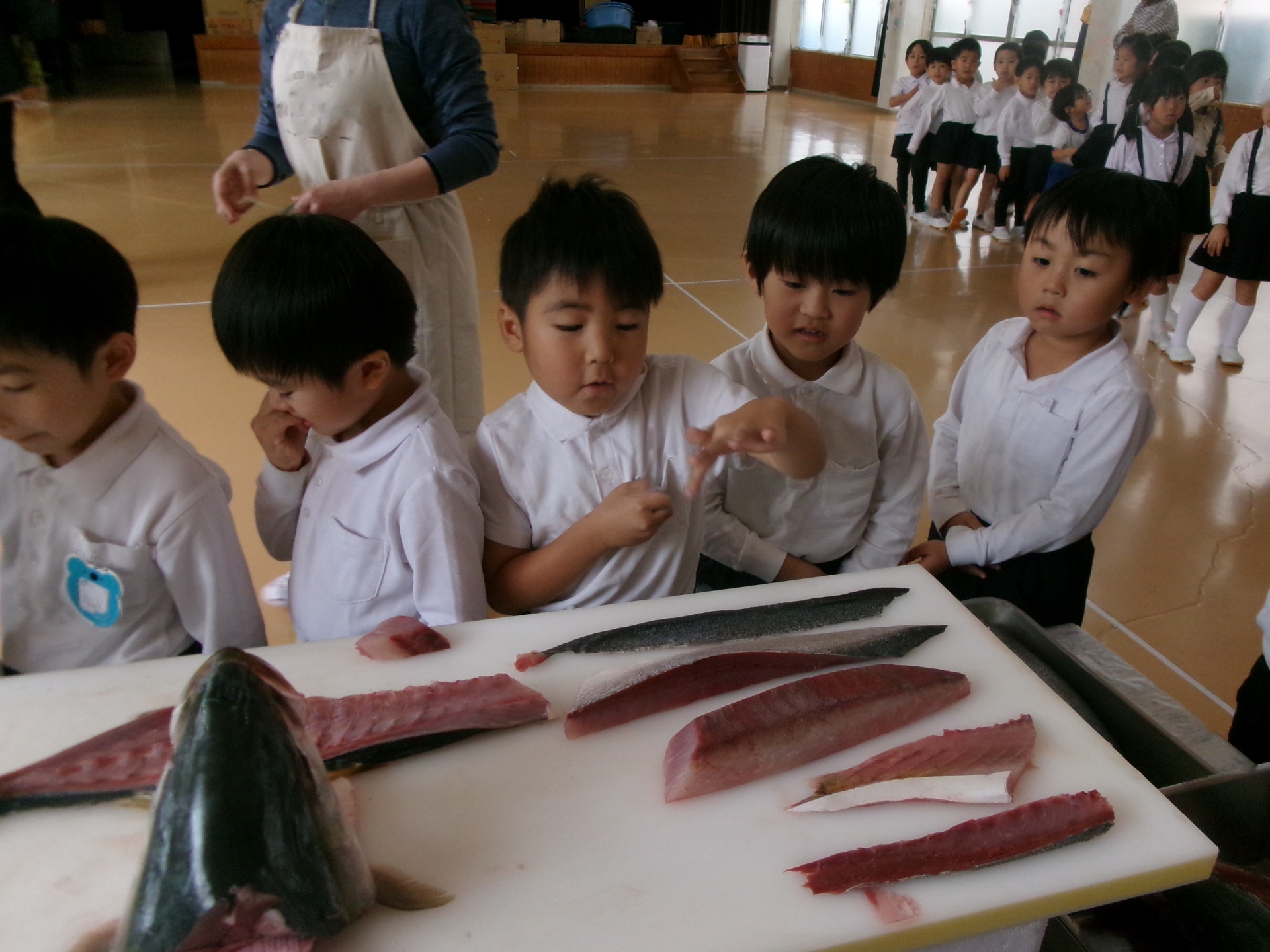 2025.11.21 ☆魚の解体ショー☆ 先月、食育の一環として魚の解体ショーの見学をしました。 初めて見る子どもも多く、調理師さんの華麗な手さばきに釘付けの子ども達でした。 解体ショーを通して、≪命を頂いていること≫を感じてくれたことと思います。