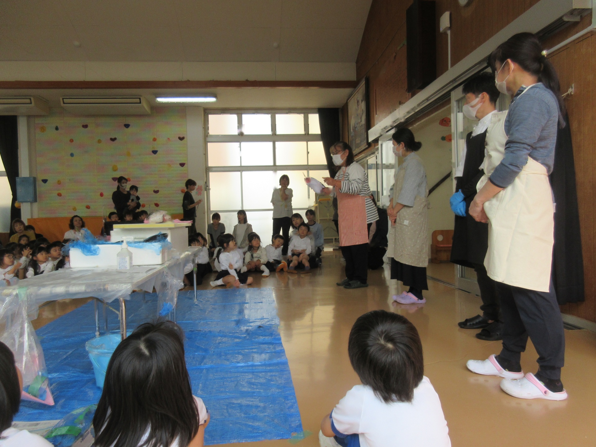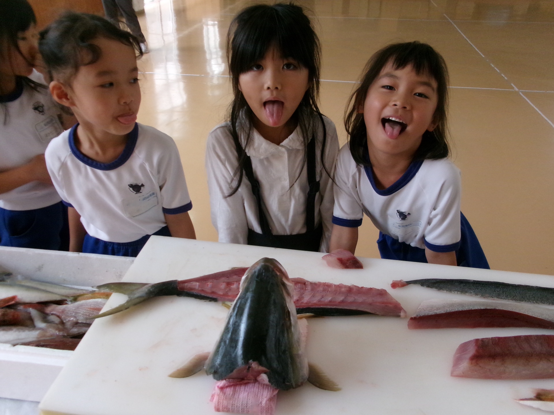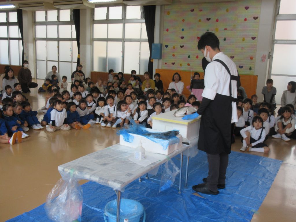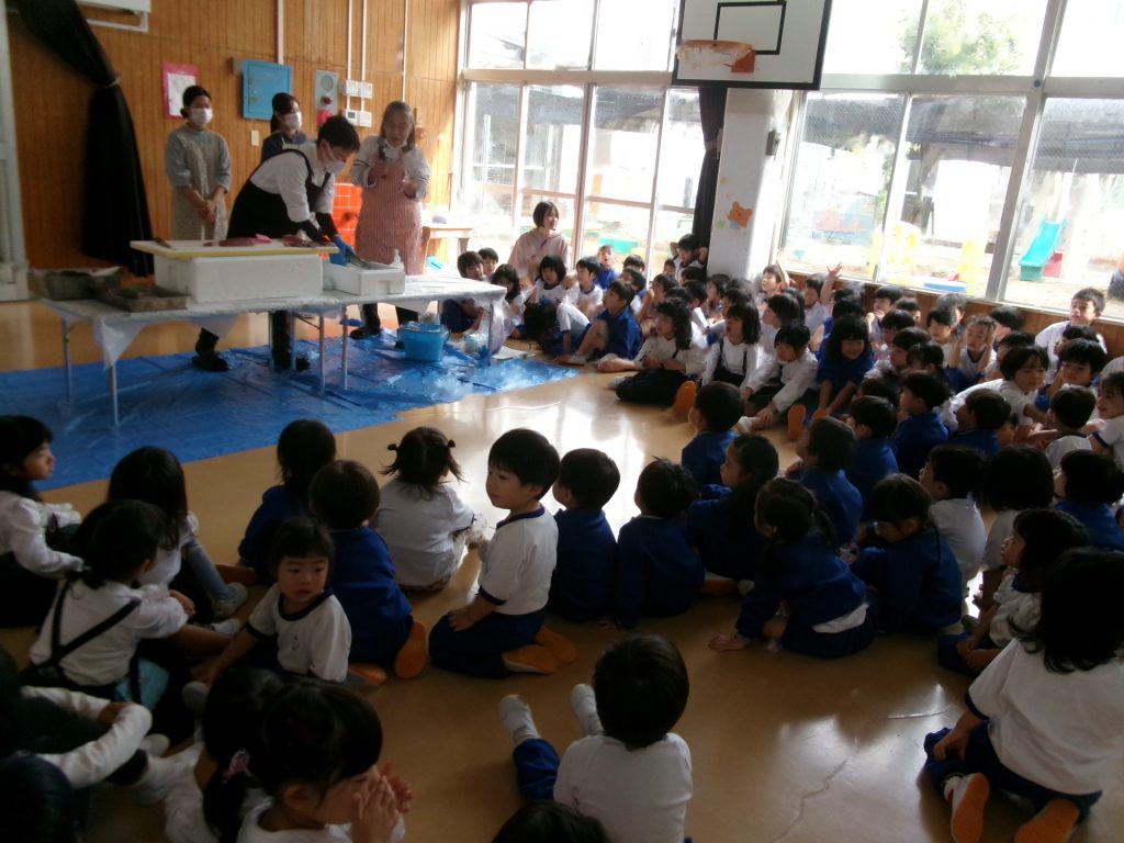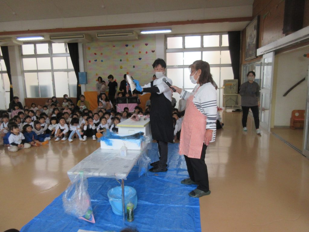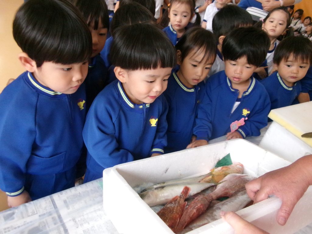 2025.11.21 ☆魚の解体ショー☆ 先月、食育の一環として魚の解体ショーの見学をしました。 初めて見る子どもも多く、調理師さんの華麗な手さばきに釘付けの子ども達でした。 解体ショーを通して、≪命を頂いていること≫を感じてくれたことと思います。