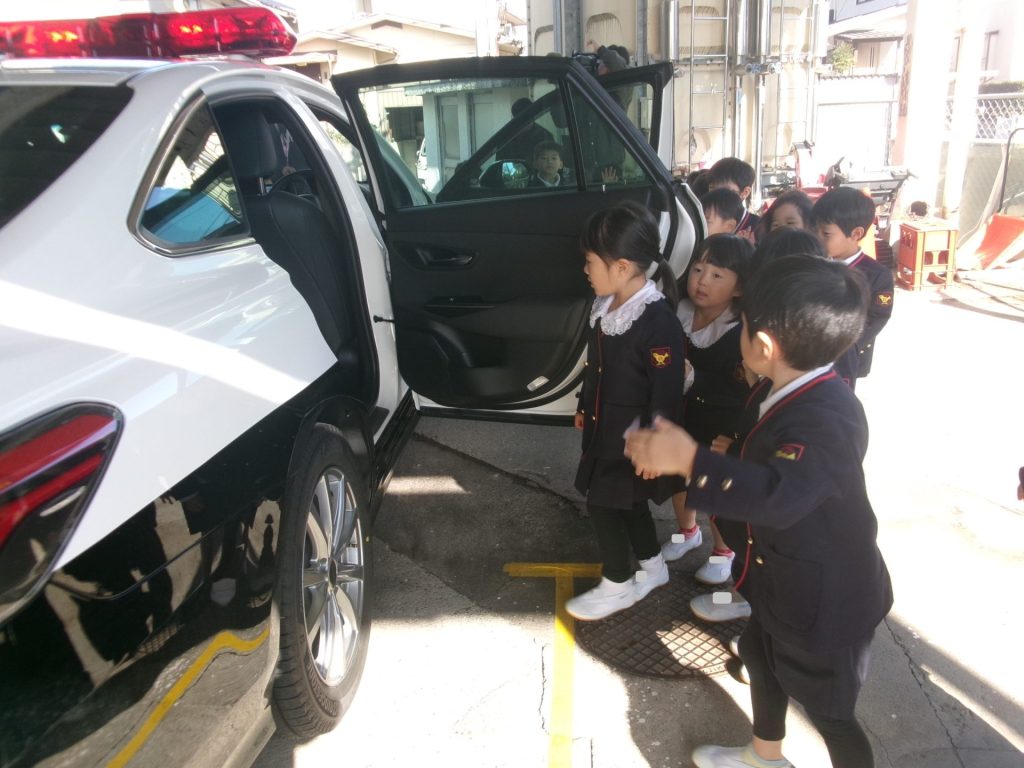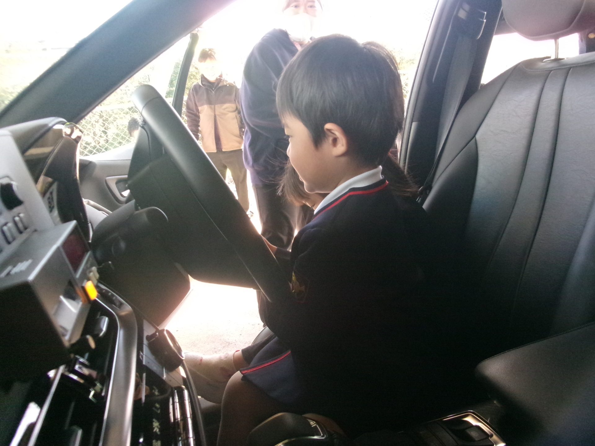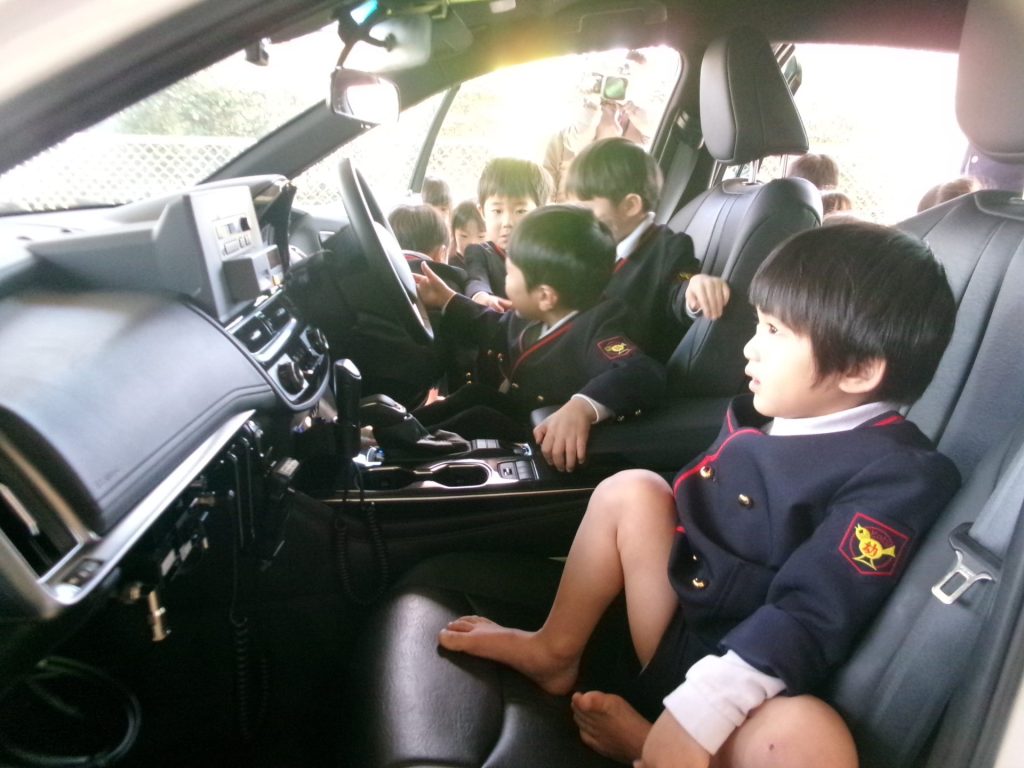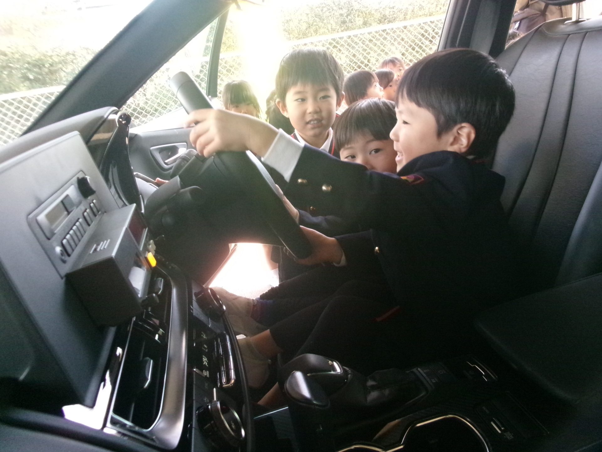 12月9日㈫に鳥取警察署の方に来ていただいて、交通安全指導をしていただきました。映像を見てクイズをしながらのお話を真剣に聞いていました。お話の後は、年長さんは横断歩道を渡る練習をしたり、学年ごとにパトカーを見せてもらいました。運転席に座ったりパトランプをつけさせてもらったりして、おまわりさんの気分を満喫していた子ども達です。