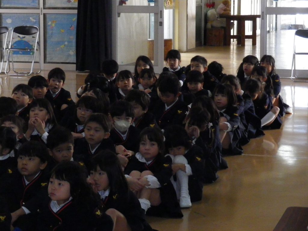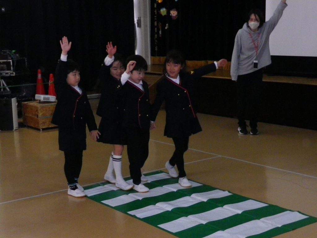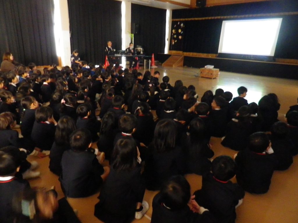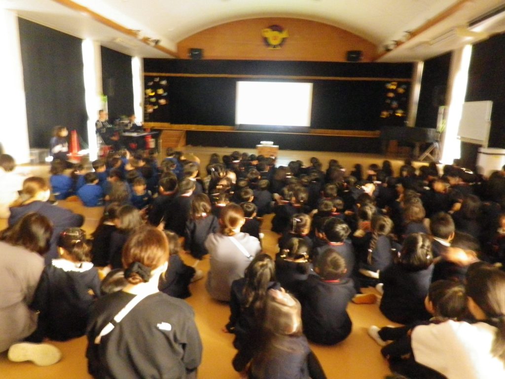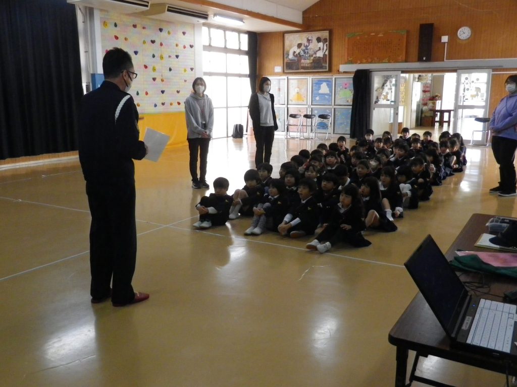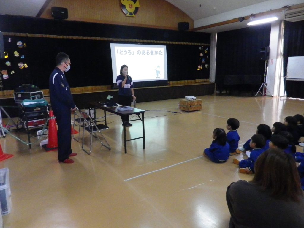 12月9日㈫に鳥取警察署の方に来ていただいて、交通安全指導をしていただきました。映像を見てクイズをしながらのお話を真剣に聞いていました。お話の後は、年長さんは横断歩道を渡る練習をしたり、学年ごとにパトカーを見せてもらいました。運転席に座ったりパトランプをつけさせてもらったりして、おまわりさんの気分を満喫していた子ども達です。